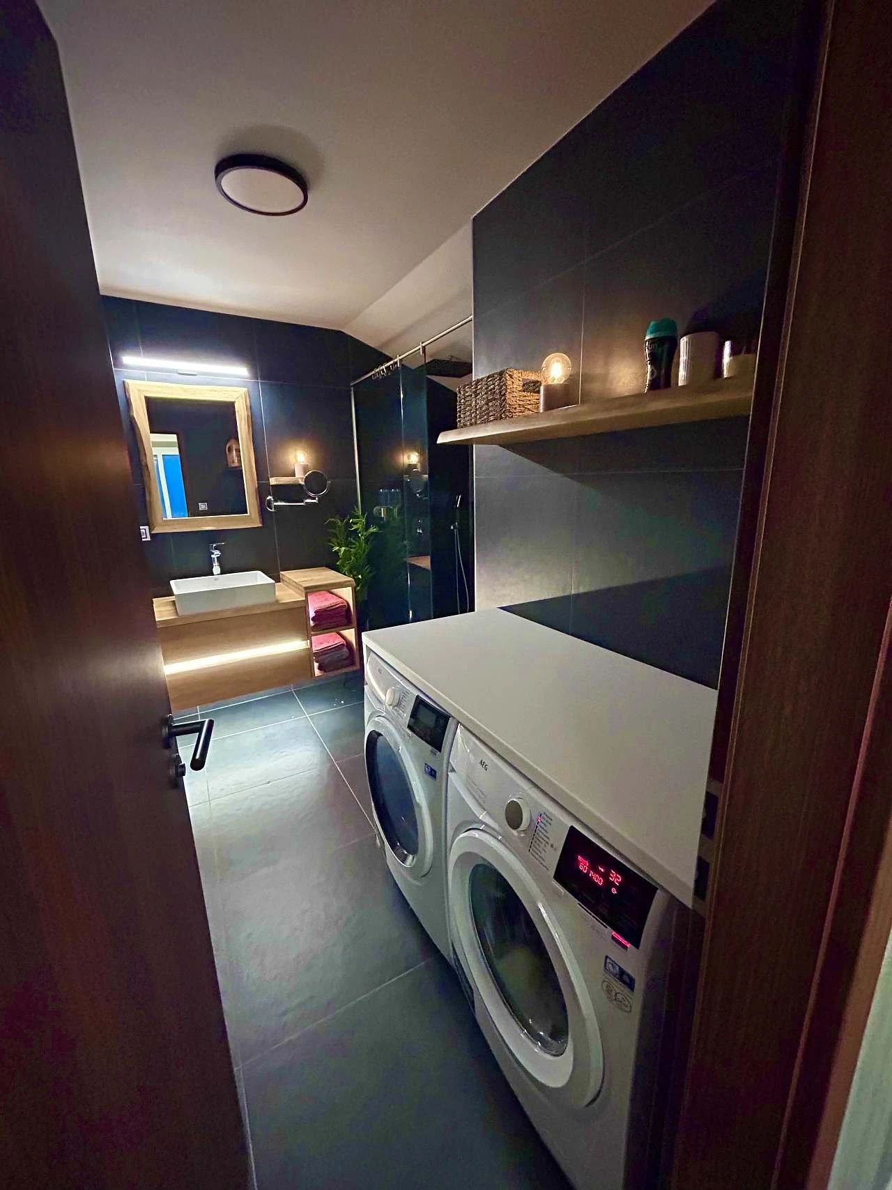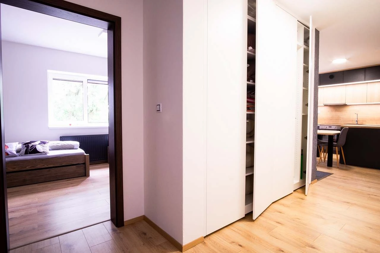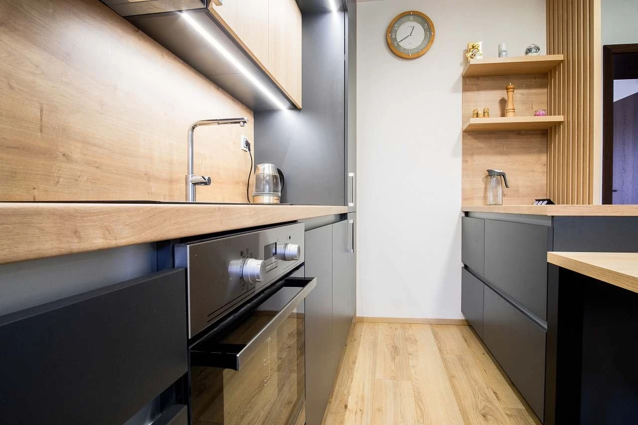 - Plně vybavená kuchyně: lednička, mrazák, myčka, mikrovlnná trouba, toustovač, rychlovarná konvice, základní nádobí a potřeby.