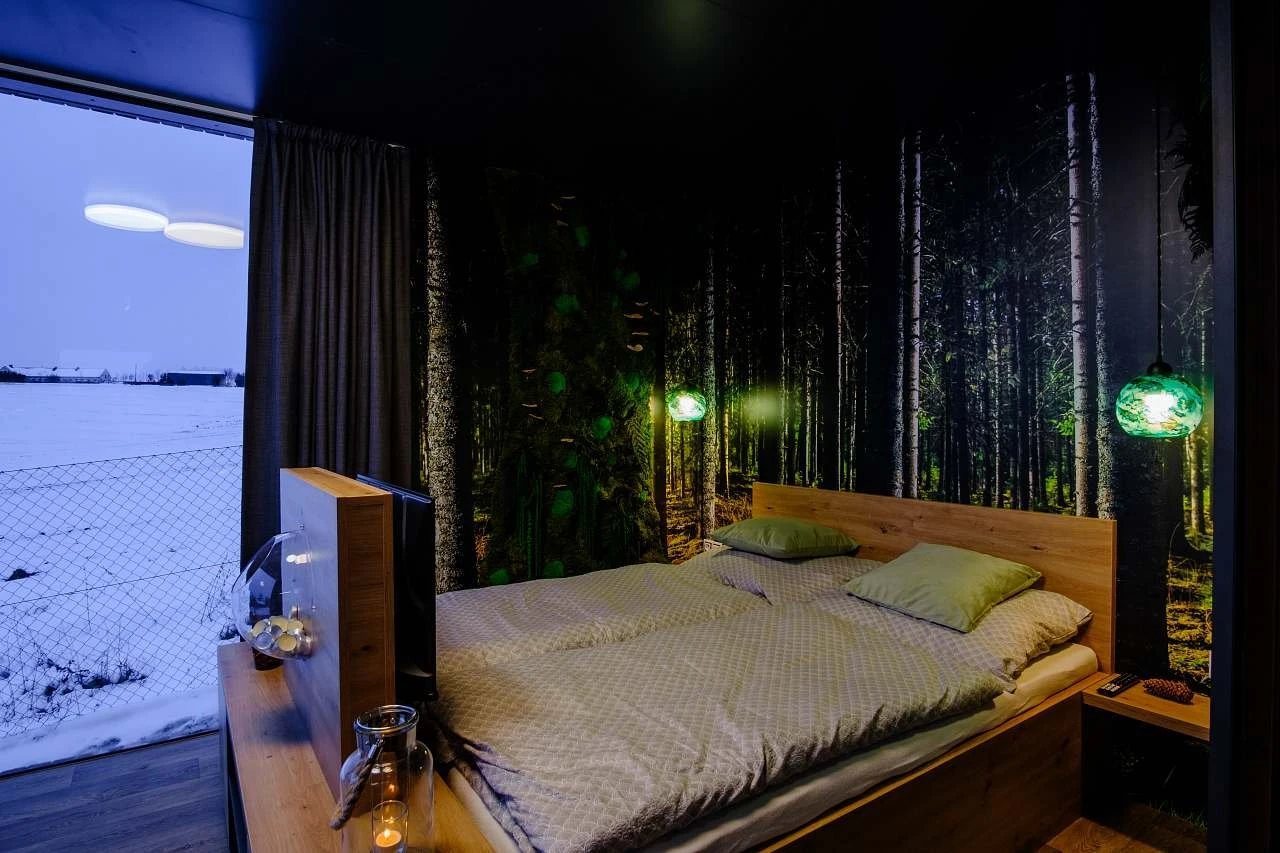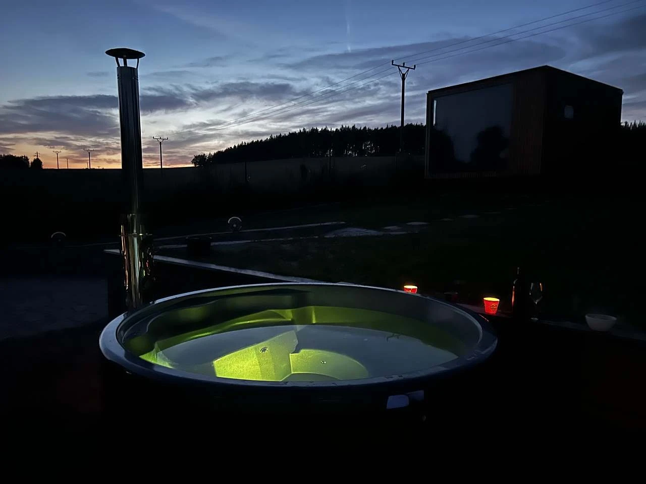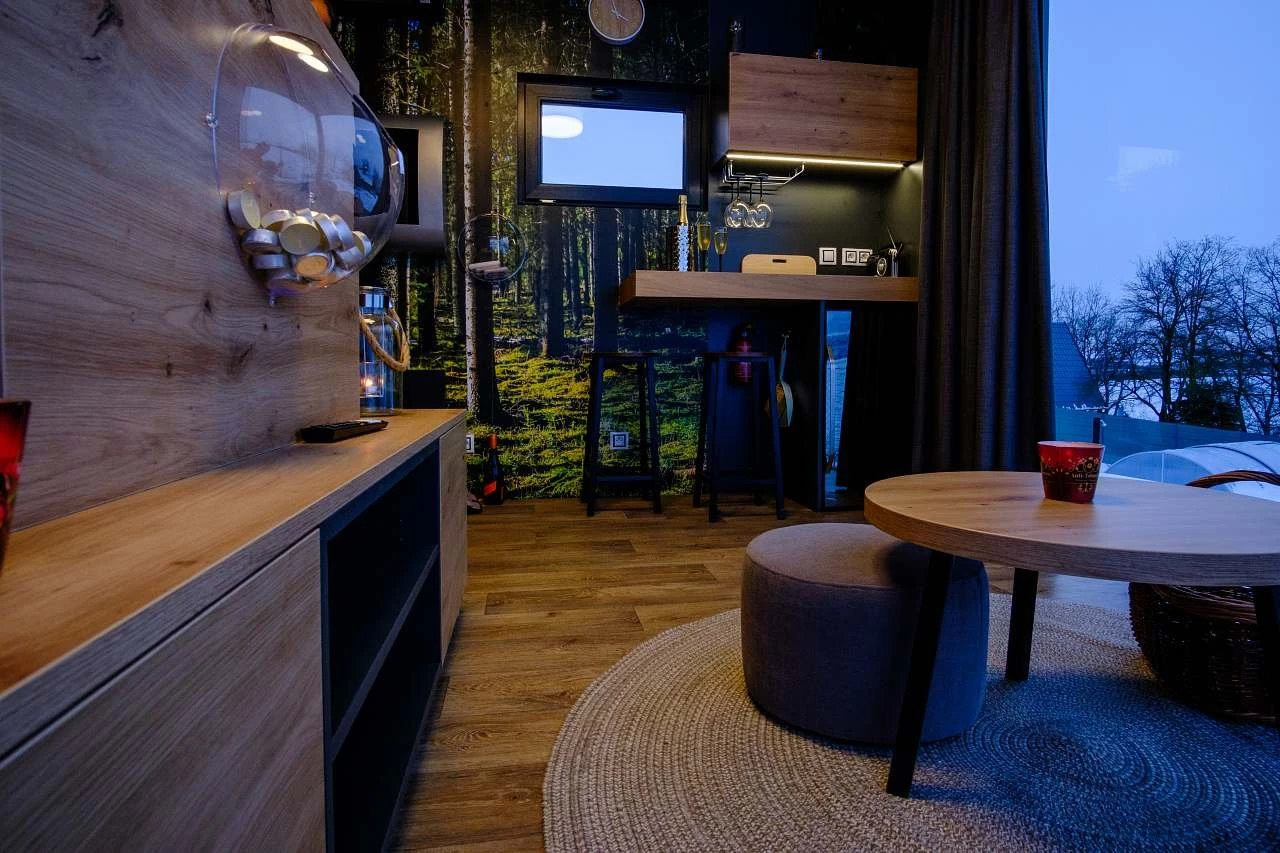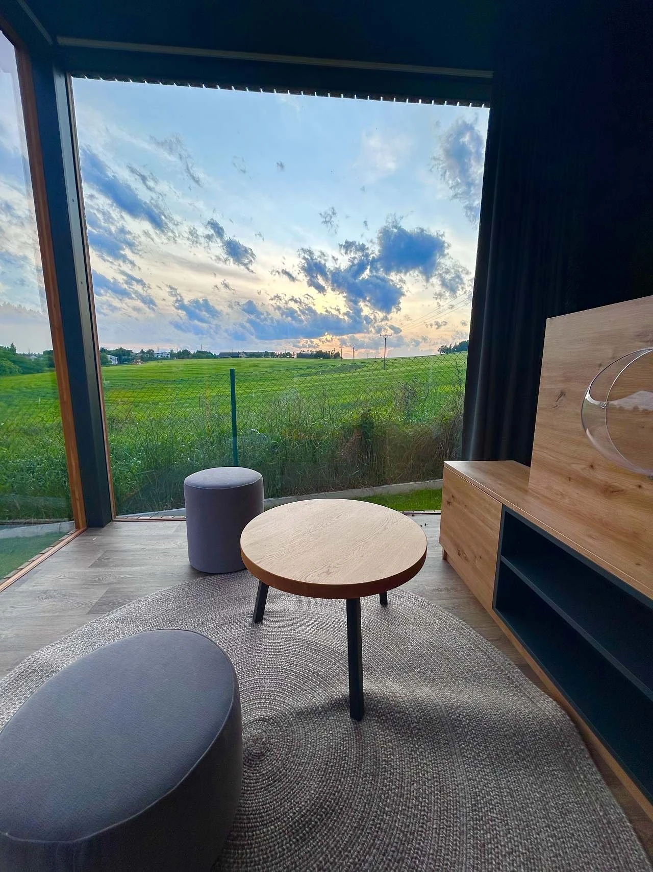 - Tiny House: manželská postel, TV, Wi-Fi, varná konvice, základní vybavení, klimatizace, lihový krb, přímotop. Sociální zařízení sdílené s chalupou.