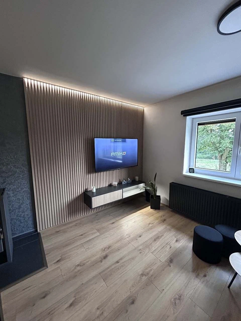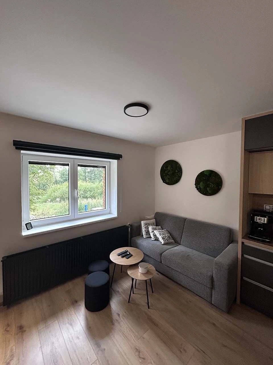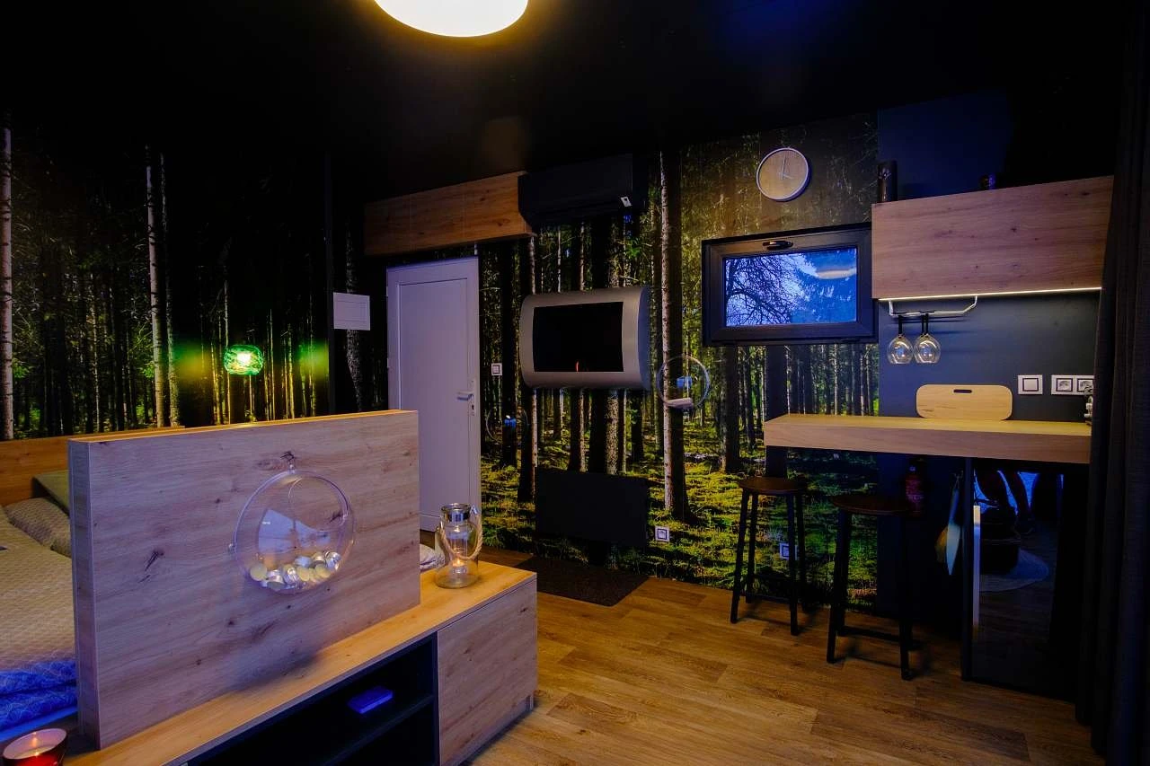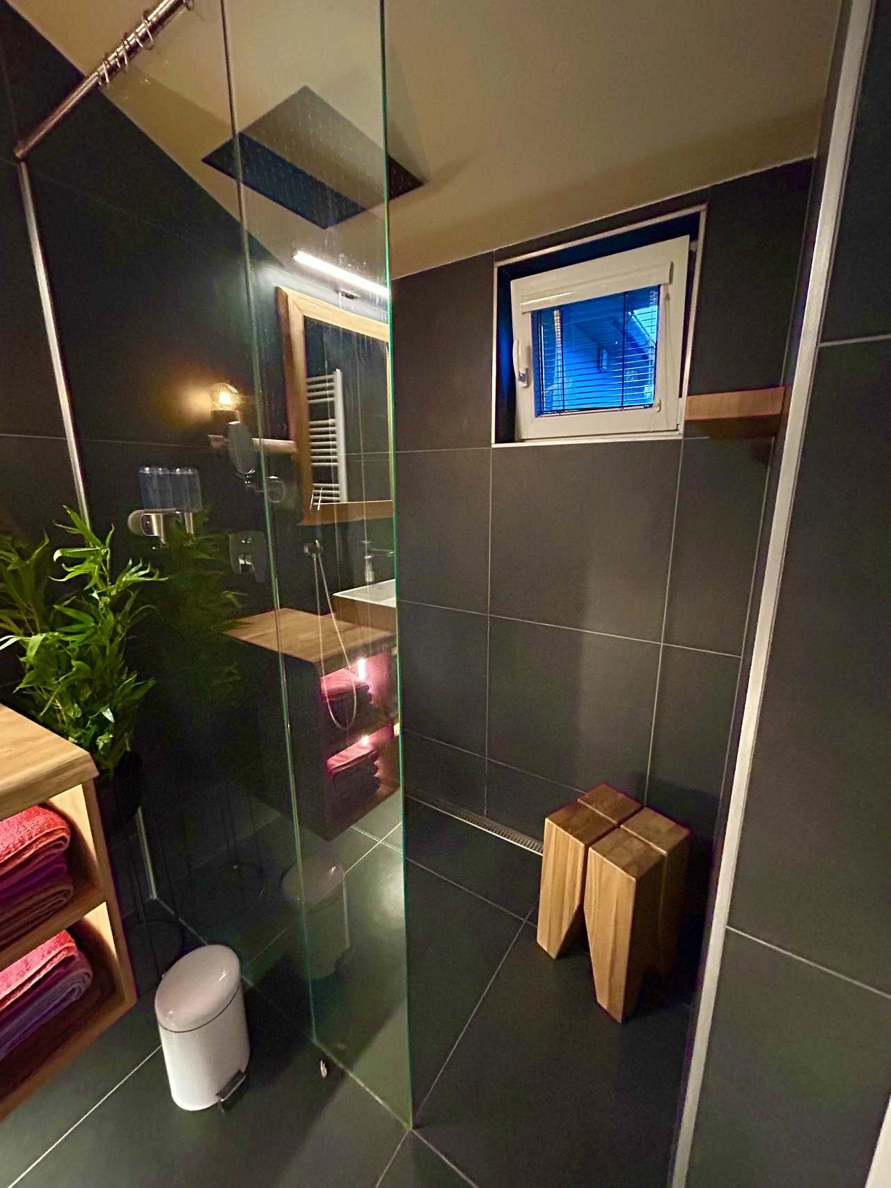 - Tiny House: manželská postel, TV, Wi-Fi, varná konvice, základní vybavení, klimatizace, lihový krb, přímotop. Sociální zařízení sdílené s chalupou.