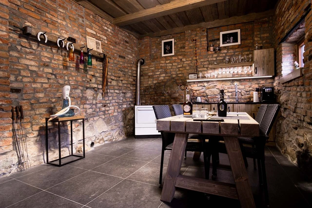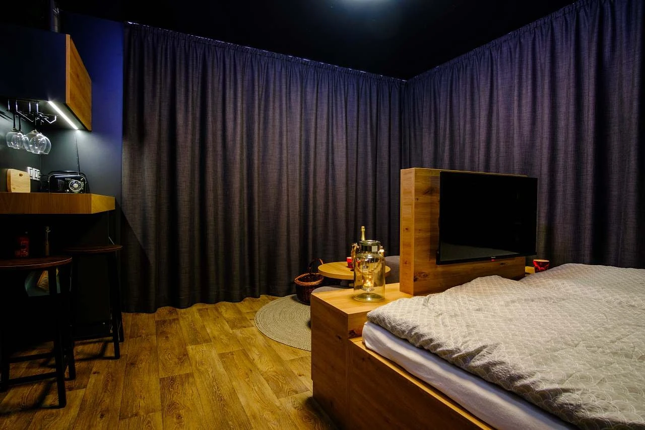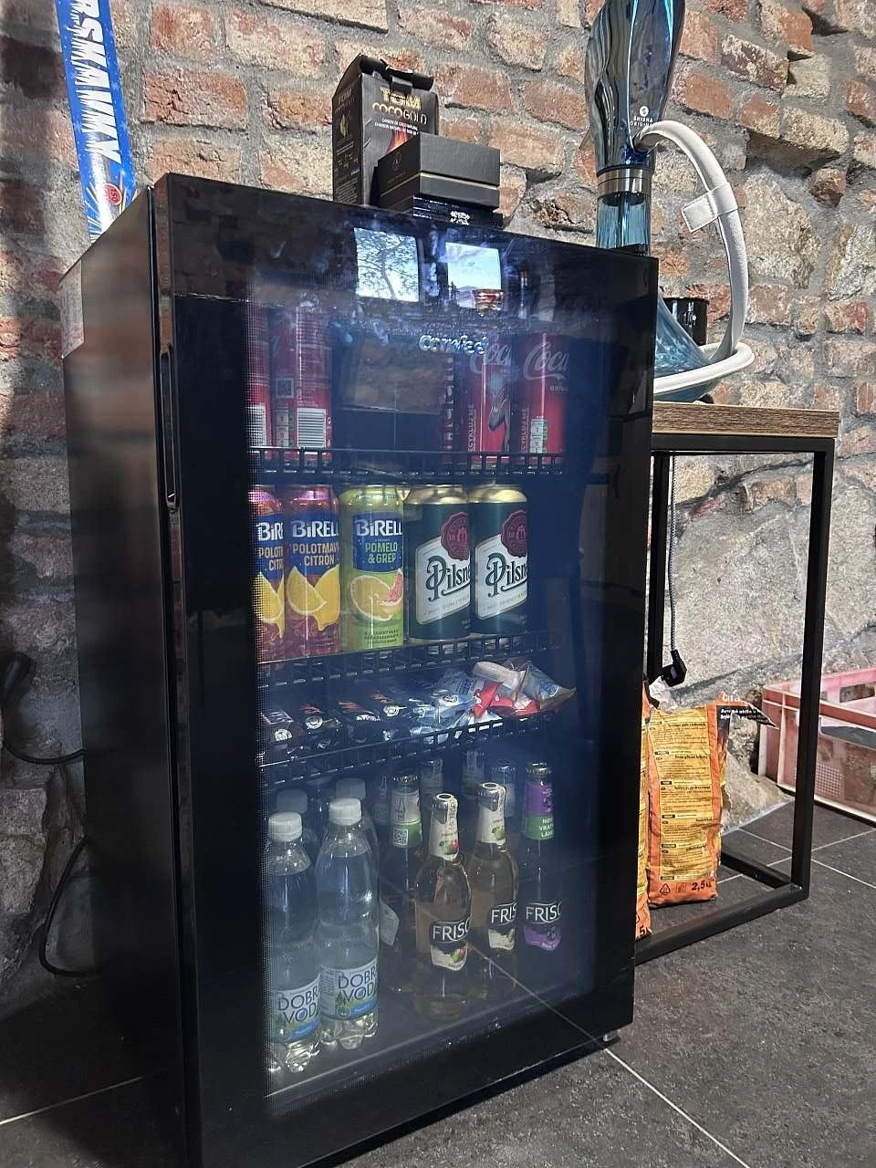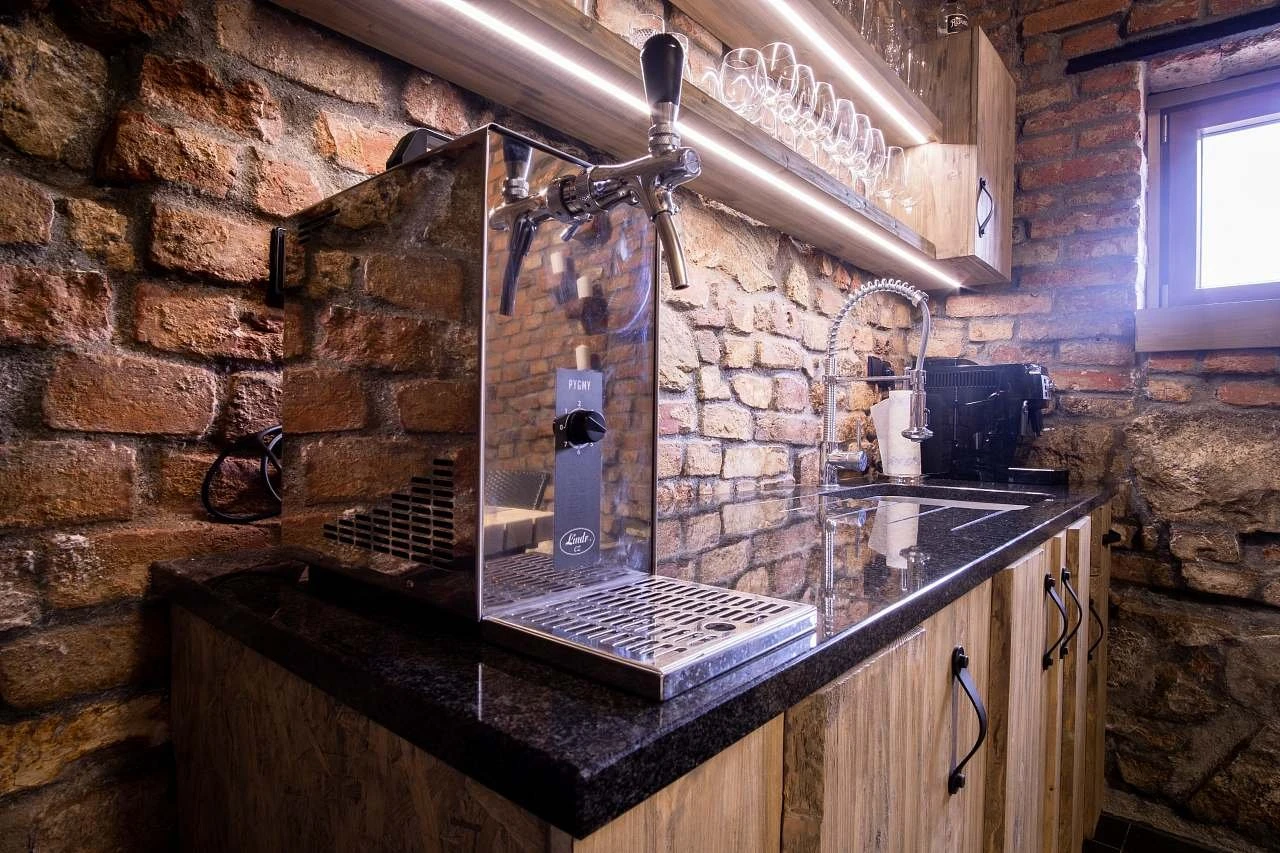 - Společenská místnost: kuchyňská linka s dřezem, výčepní zařízení, skleničky, bar, vodní dýmka, výběr vín a rumů.