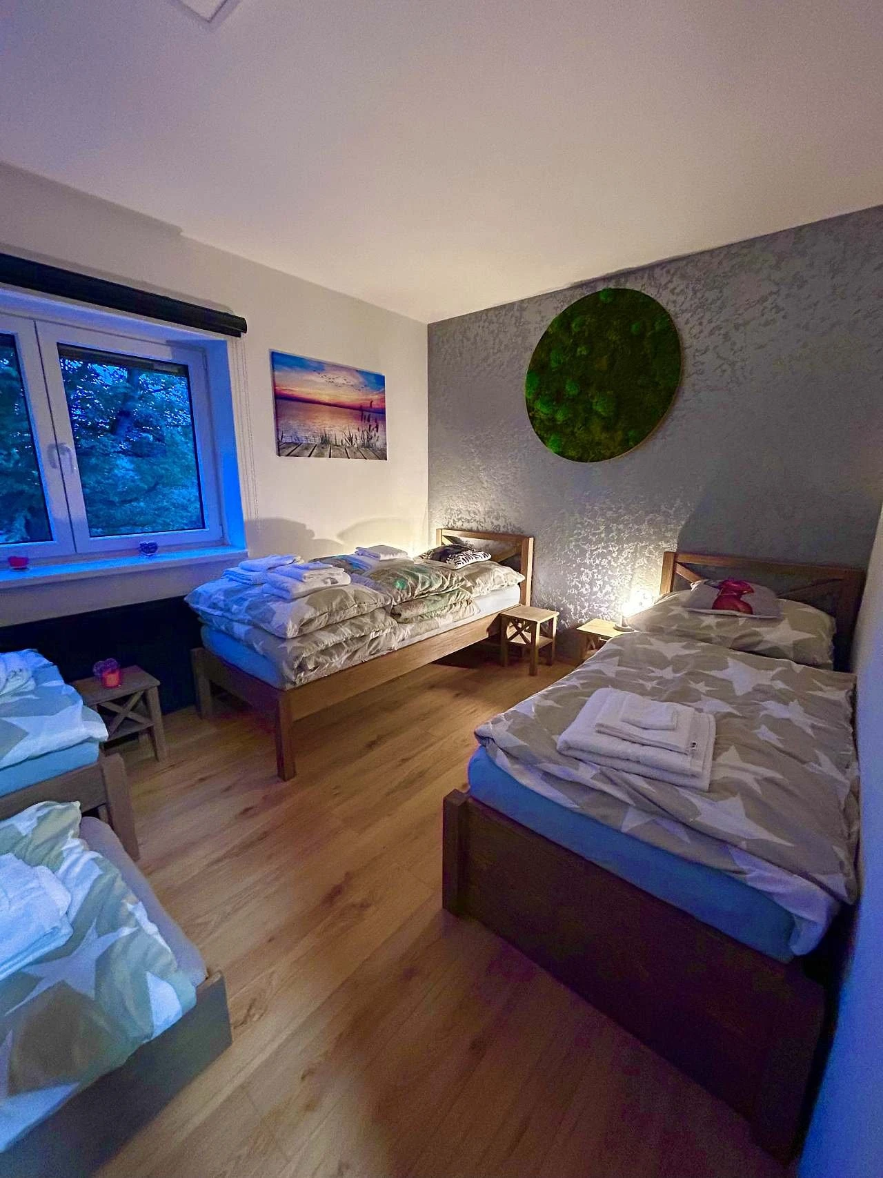 - Pokoj: 3 jednotlivé postele, 2 s výsuvnými spodními lůžky (spaní až pro 5 osob), rolety stejné jako výše.