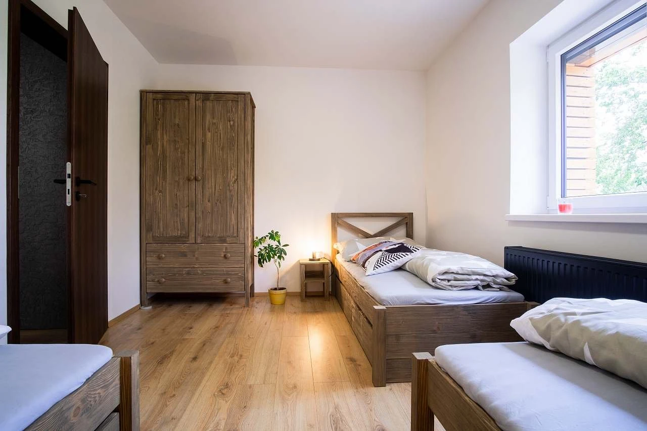 - Hlavní chalupa: 3 ložnice + obývací pokoj s rozkládací pohovkou.