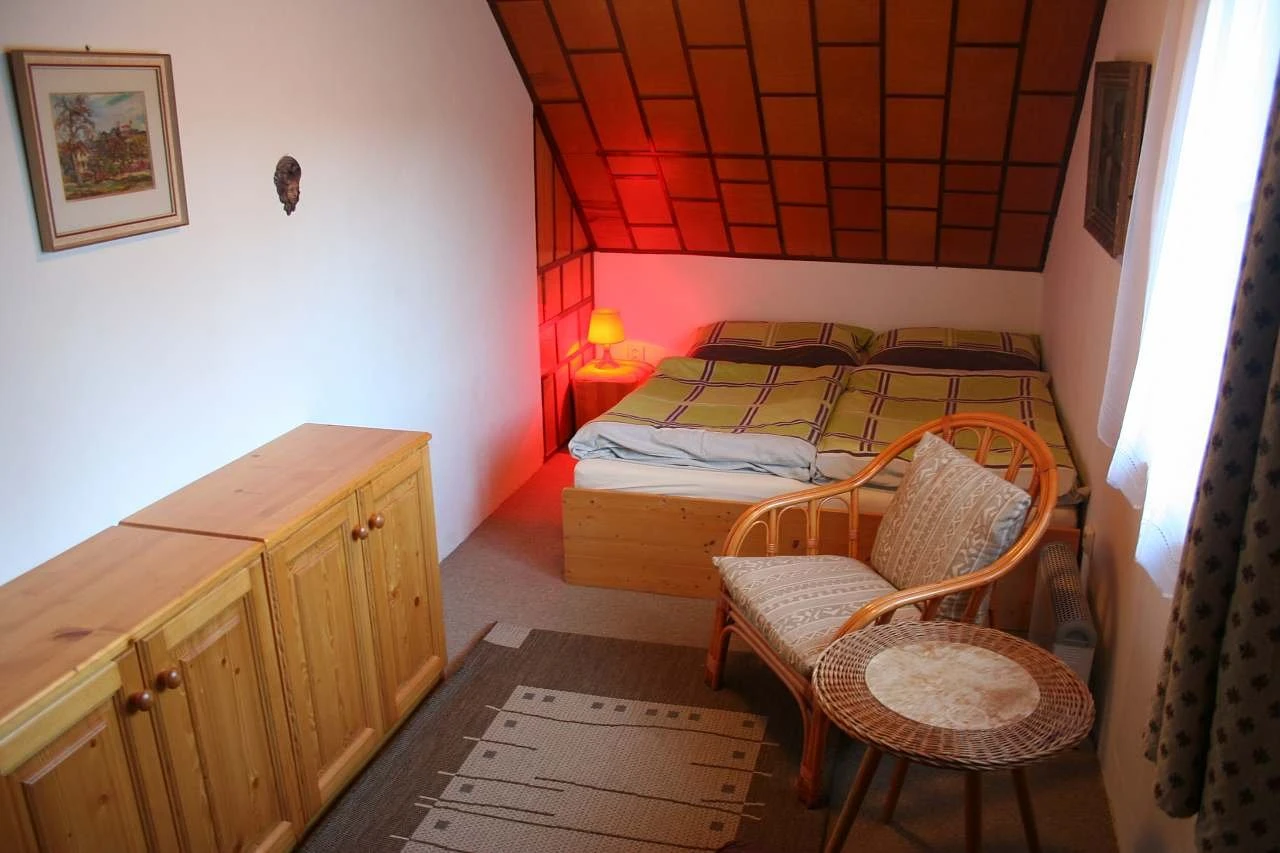 - Podkroví: dvě čtyřlůžkové ložnice s lůžkovinami a povlečením.