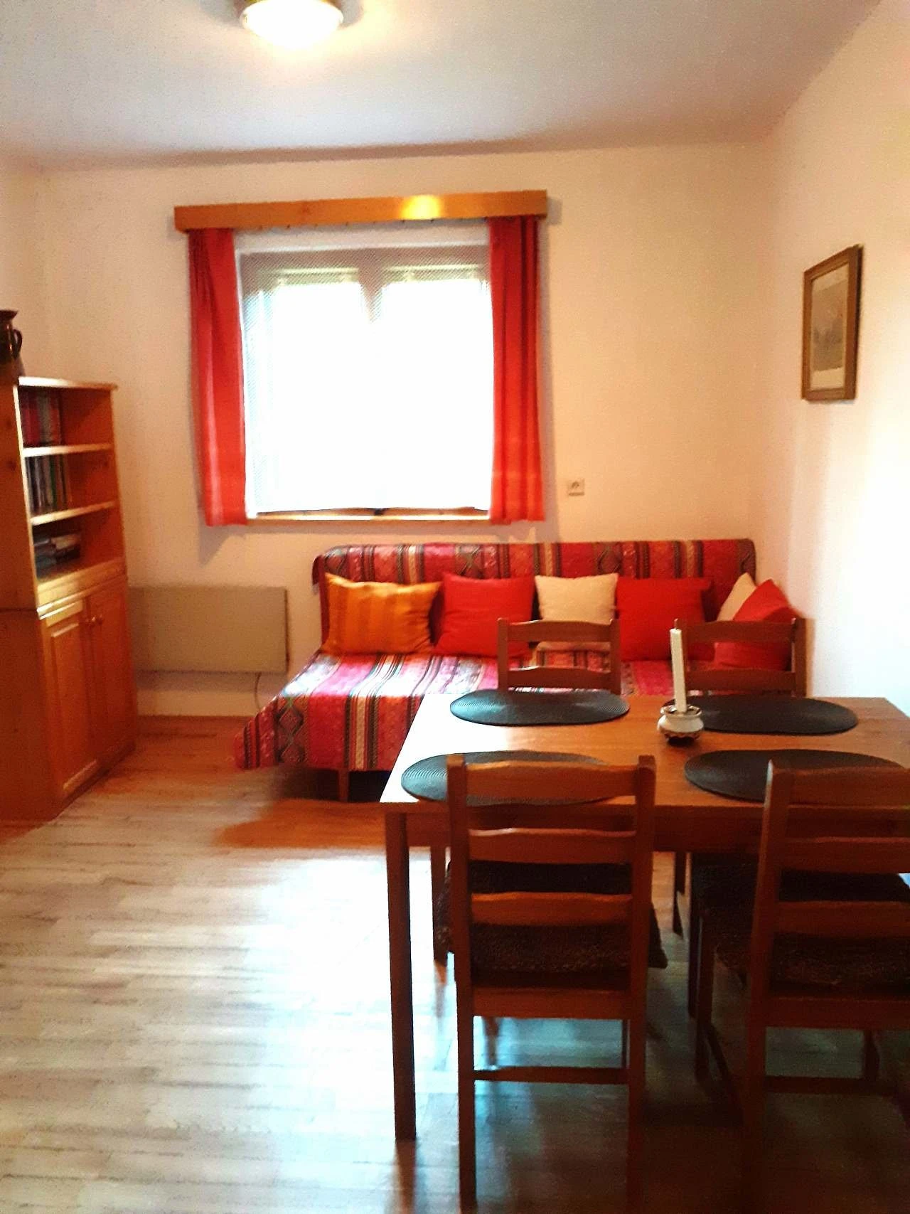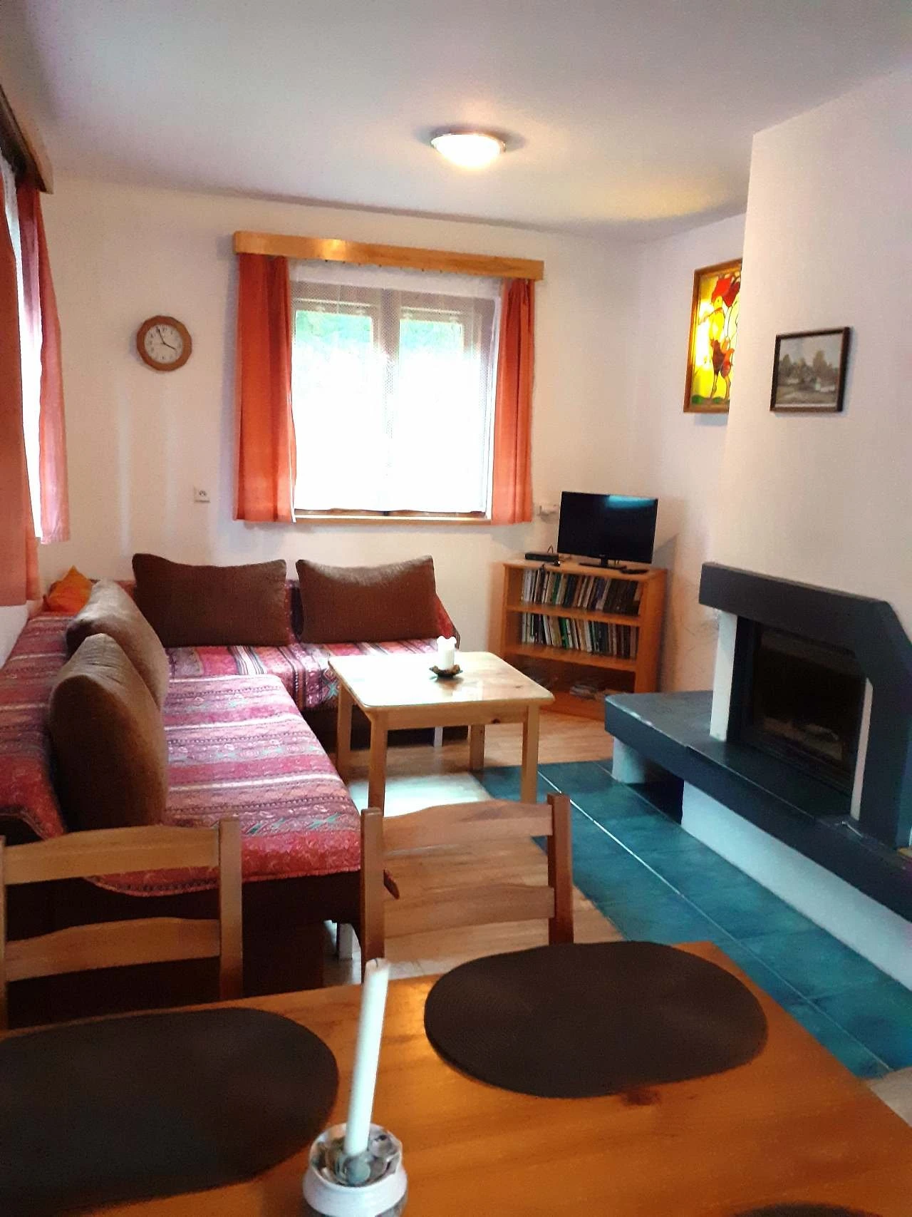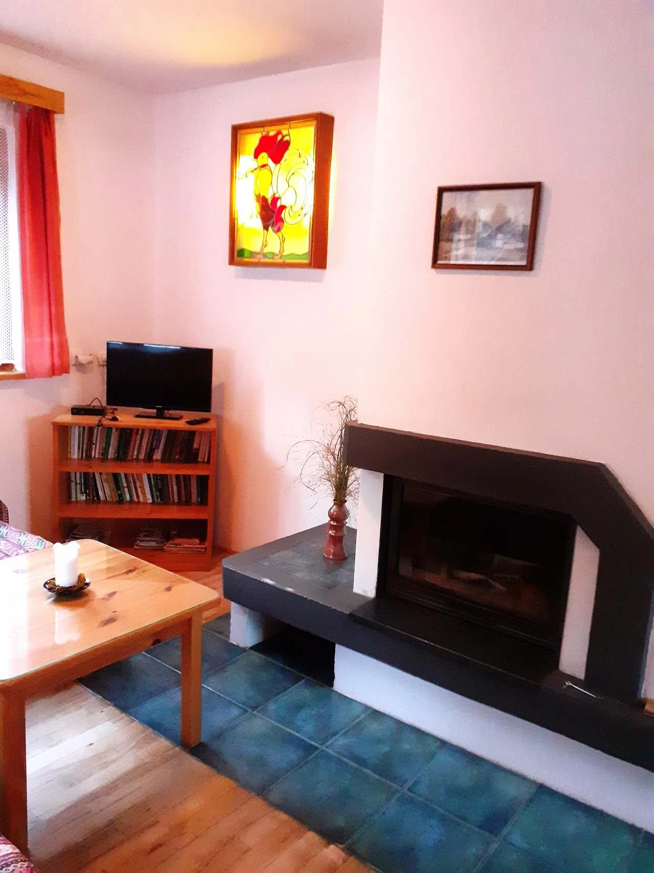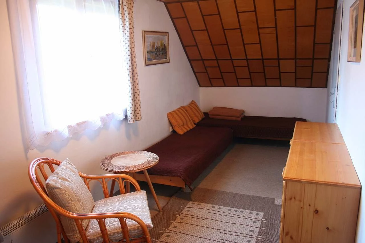 - Obývací pokoj: krbová vložka, barevná TV, rozkládací sedací souprava, jedno lůžko.