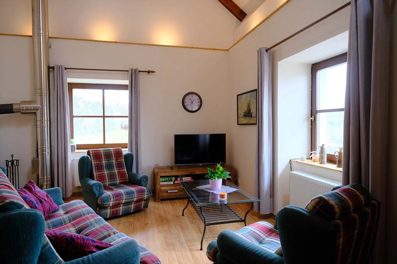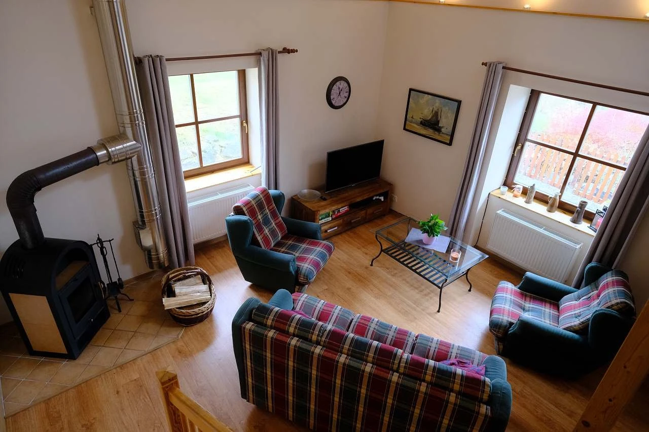 Obývací pokoj: krbová kamna, TV se satelitními programy, DVD přehrávač, Wi‑Fi, společenská místnost.