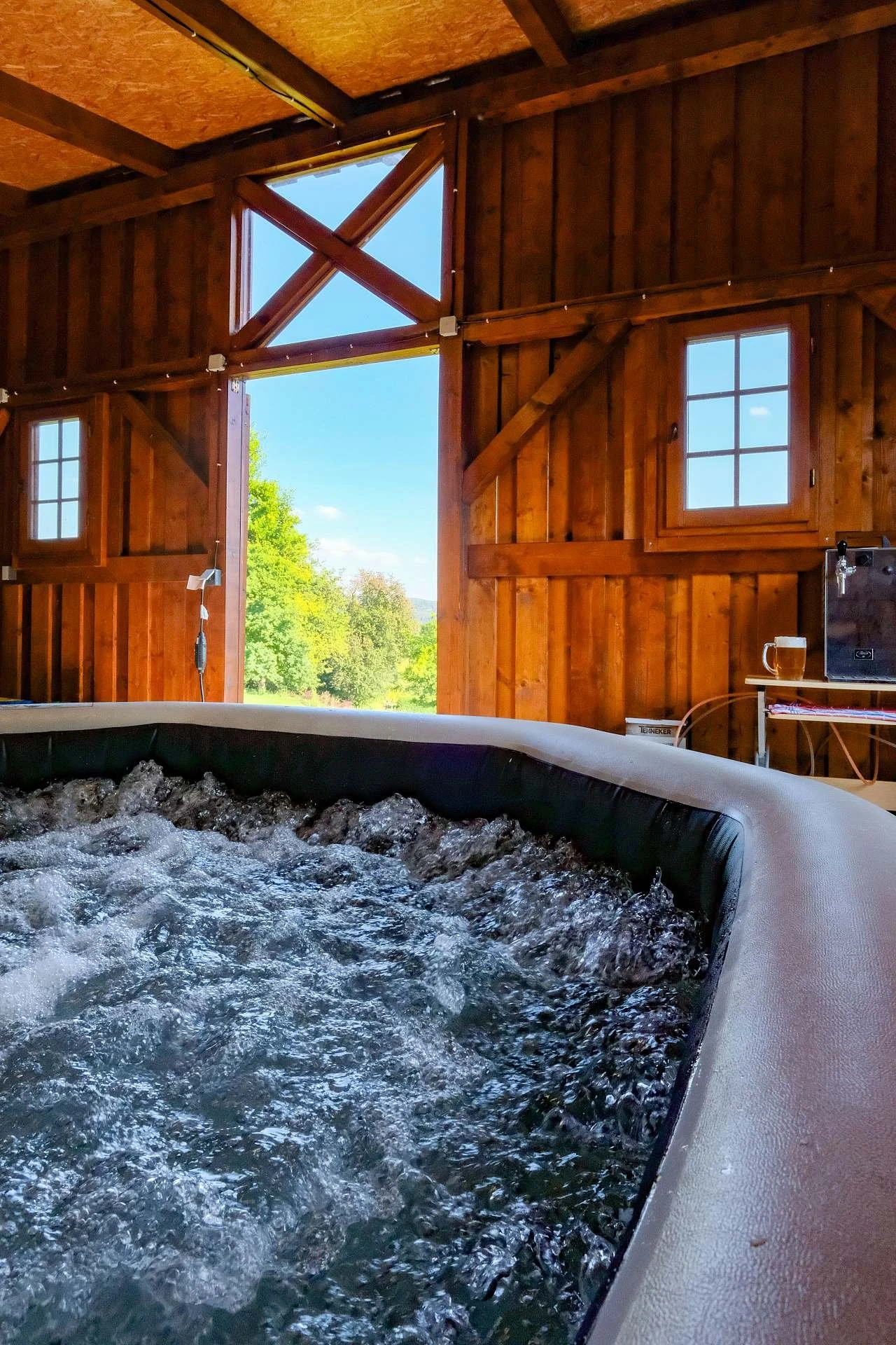 Venkovní vybavení: terasa, zahradní nábytek, gril, ohniště, vyhřívaný bazén, vířivka pro 6 osob, pískoviště, houpačky, trampolína, prolézačky pro děti.
