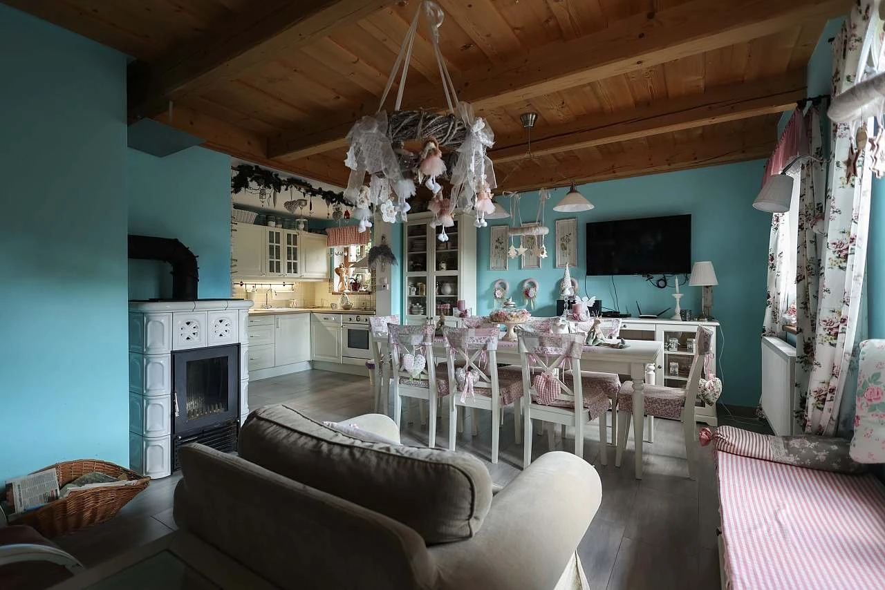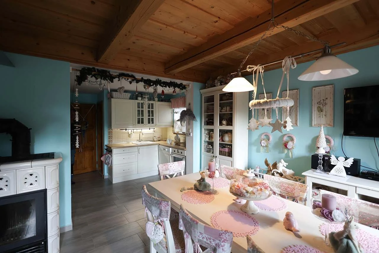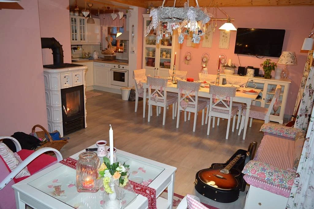 Součástí chalupy je společenská místnost / obývací pokoj s jídelním koutem, krbovými kamny, LCD televizí, DVD přehrávačem a satelitním příjmem.