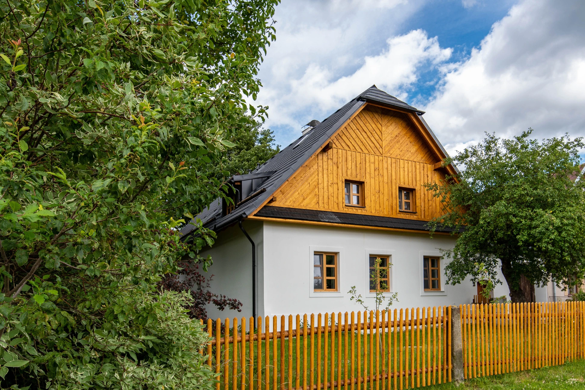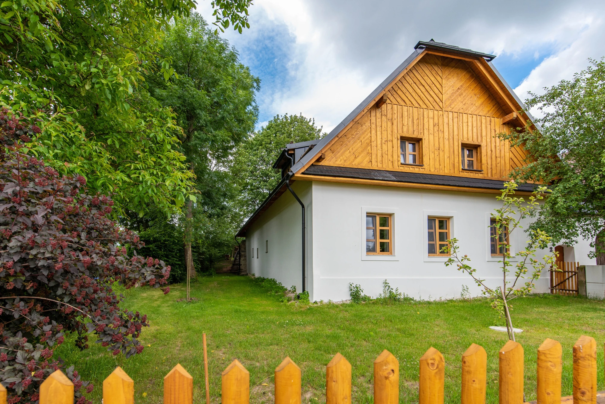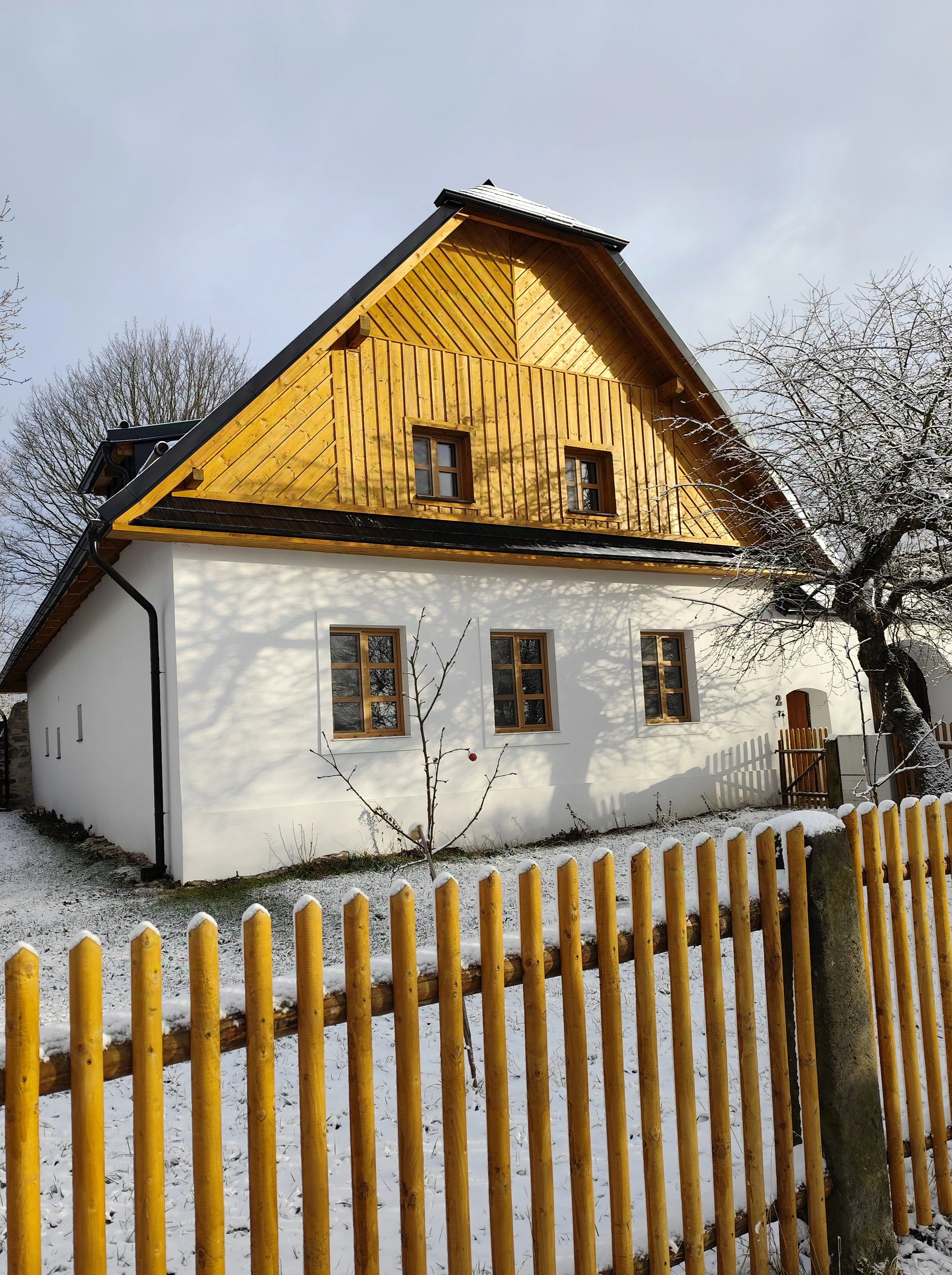 - Dostatek parkovacích míst: zadní parkoviště (3 místa), u vrat chalupy (1 místo) a 3 místa u obecního plotu.