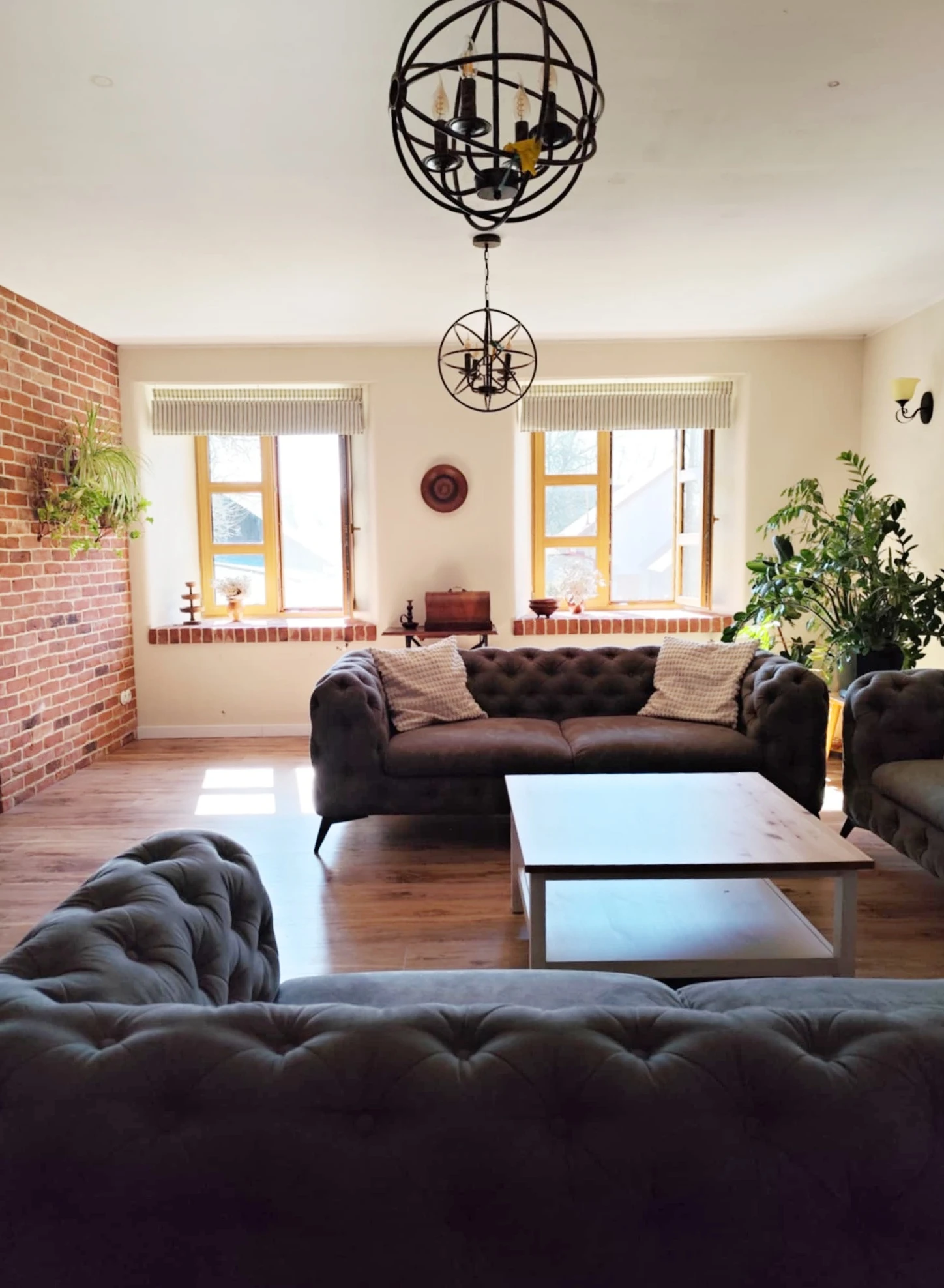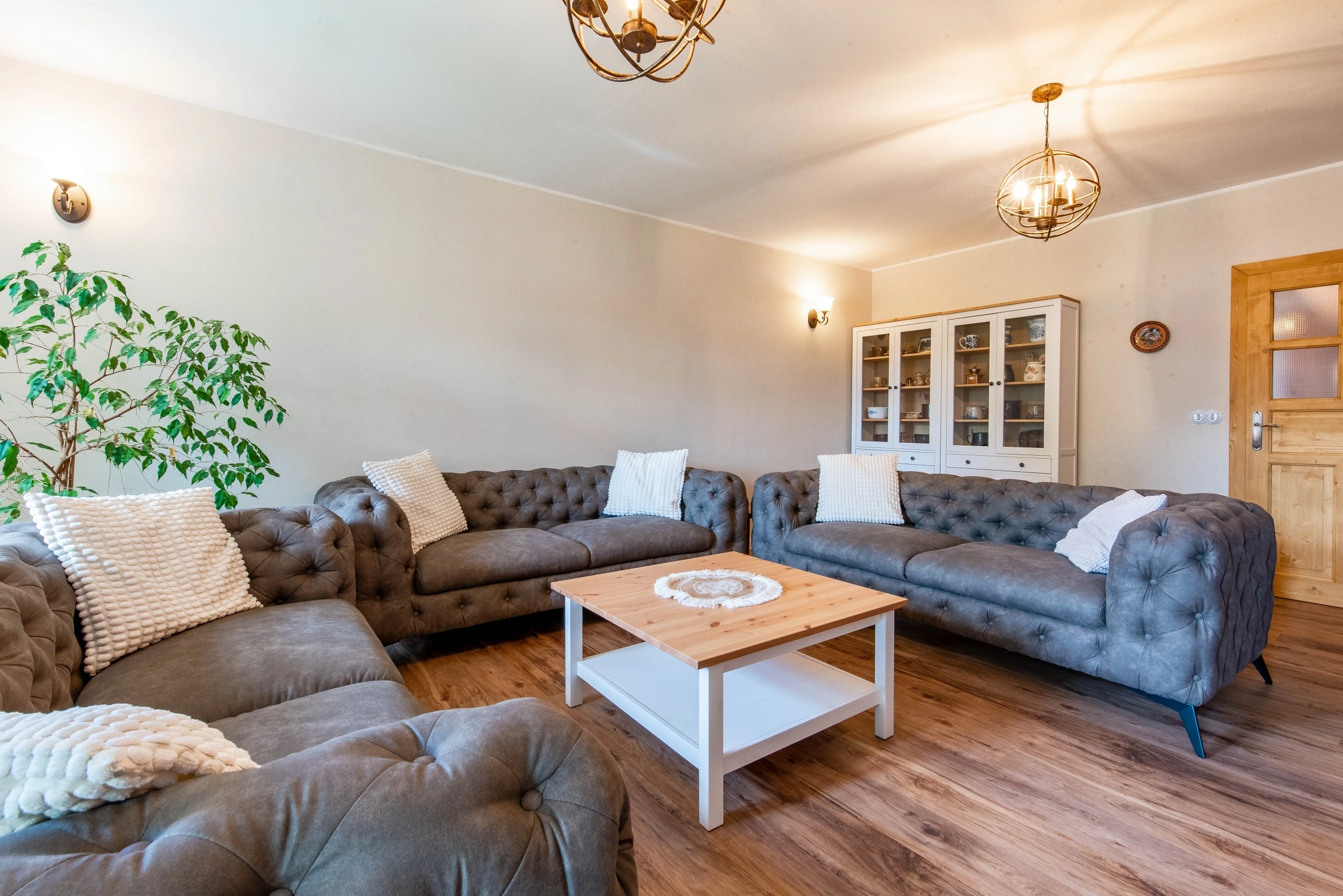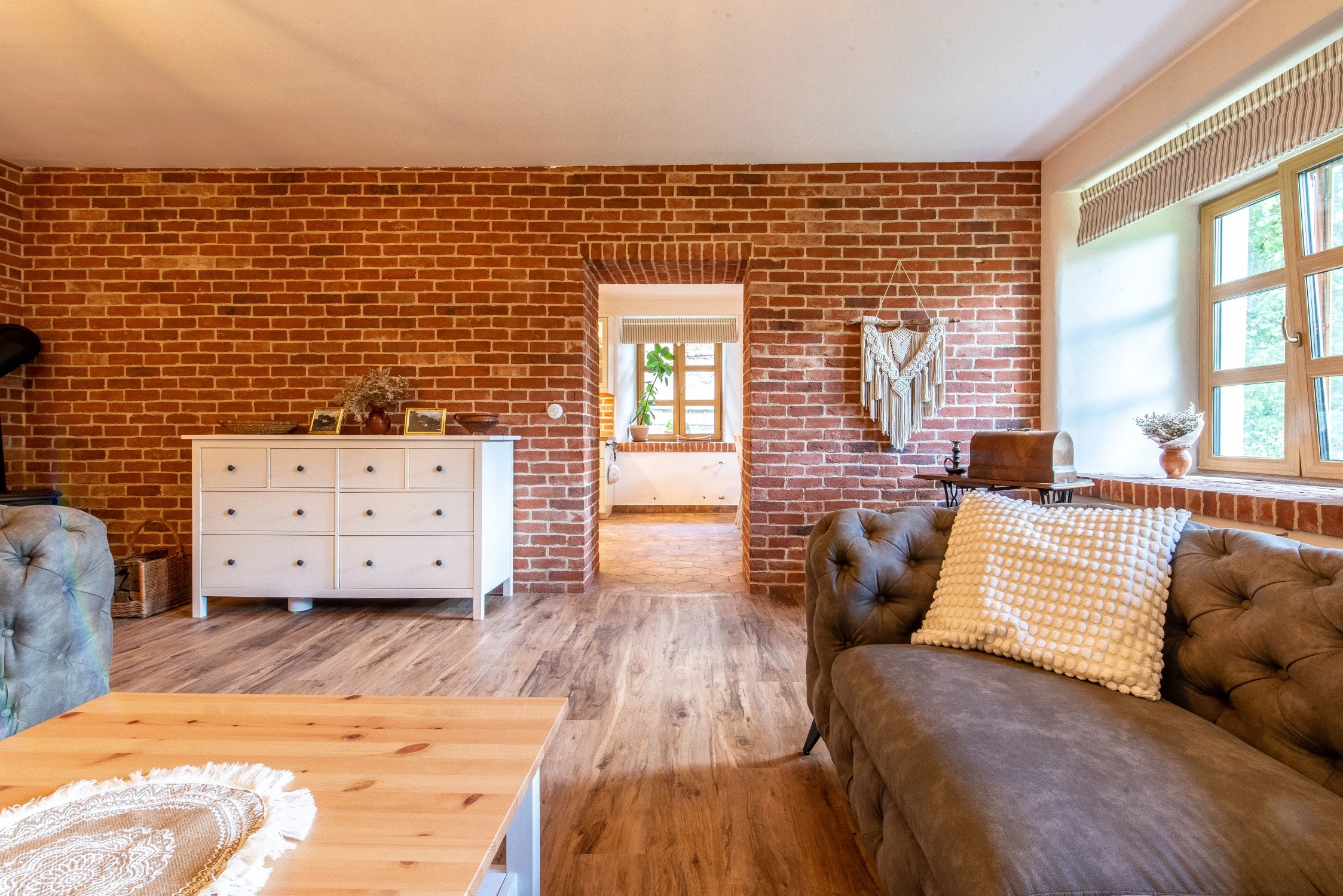 - Obývací pokoj s gauči, televizí (Oneplay+Netflix), krbovými kamny a venkovskou výzdobou.