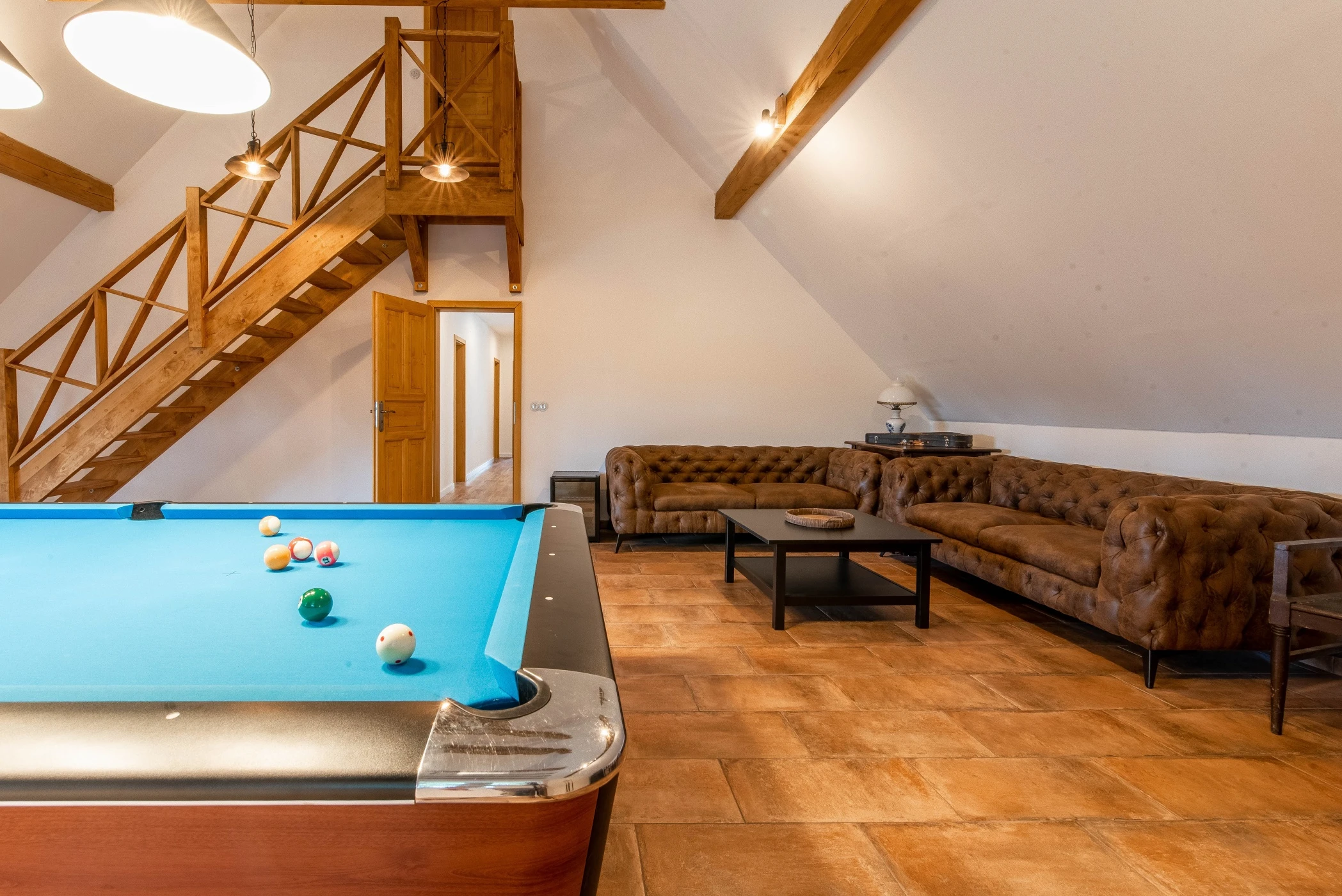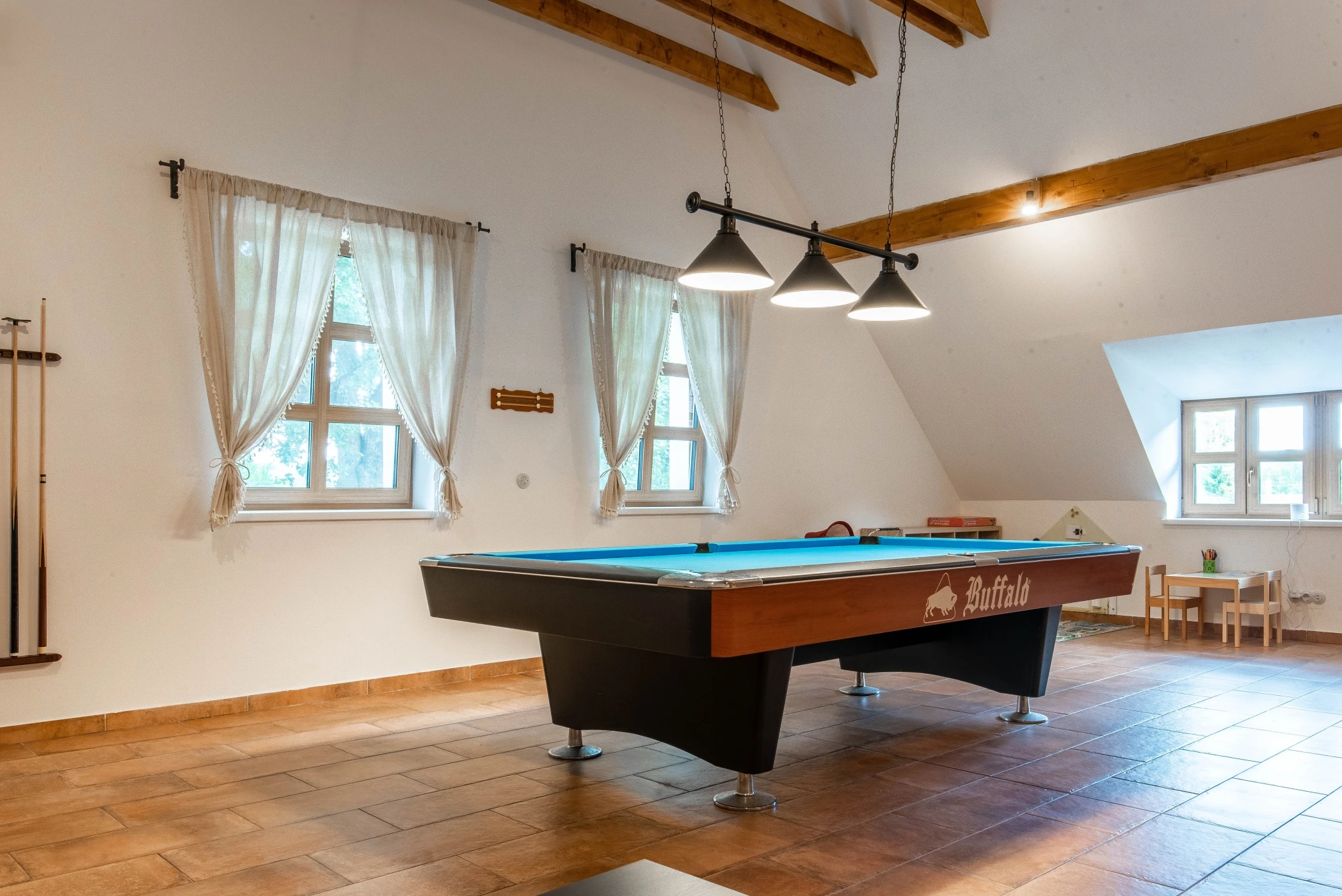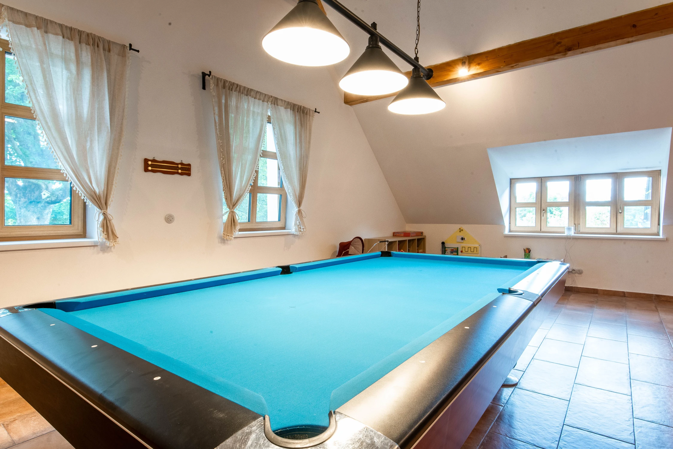- Herní místnost v patře s kulečníkovým stolem, velkokapacitním posezením a dětským hracím koutkem.