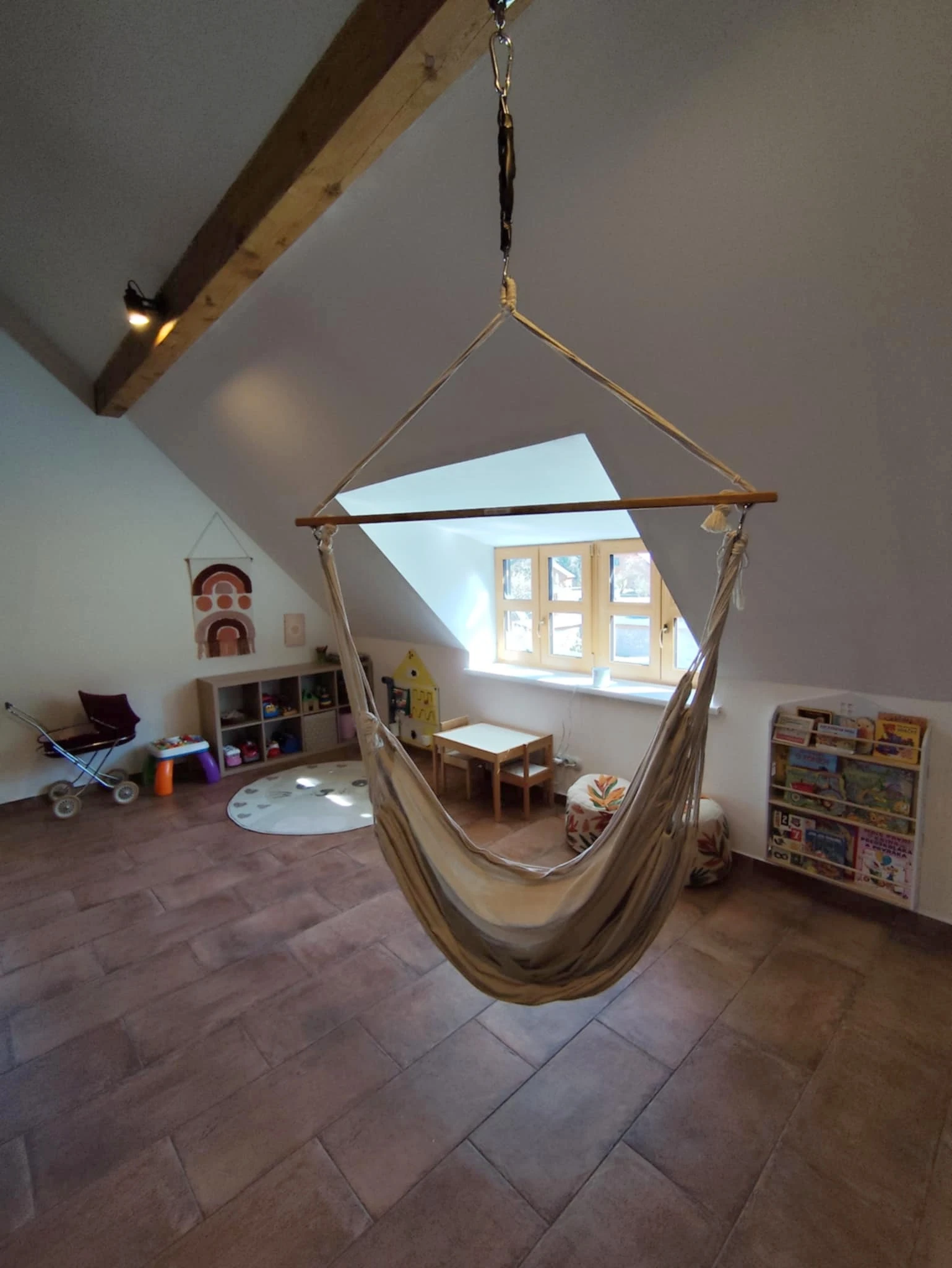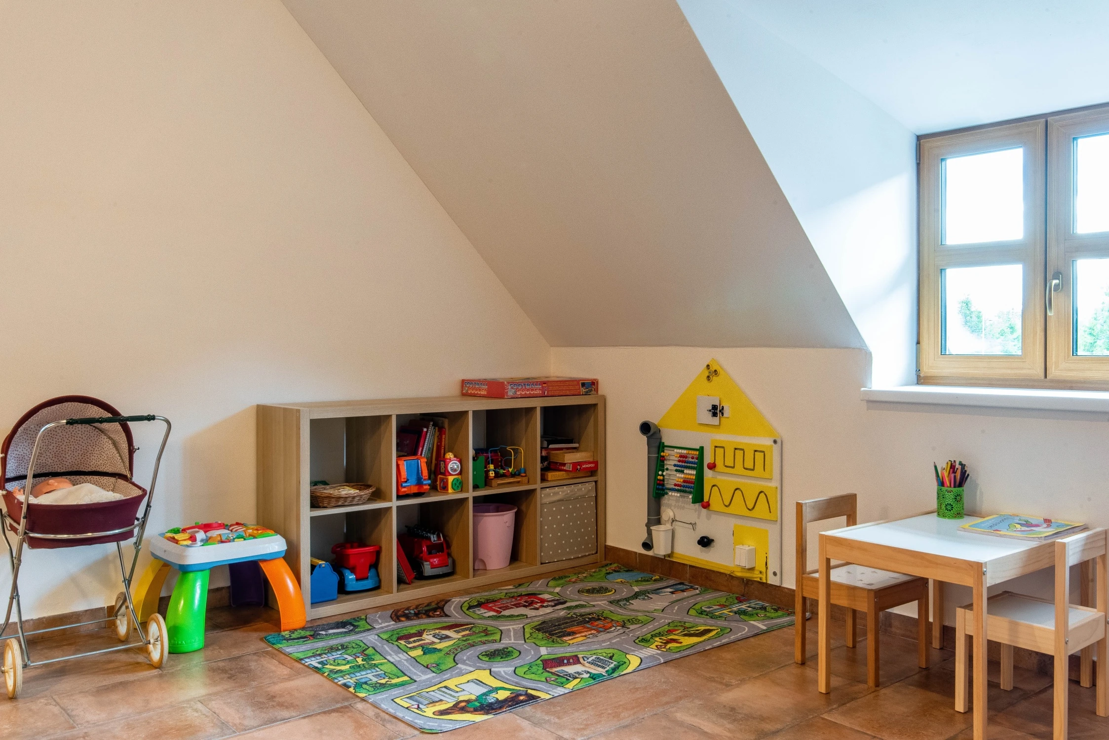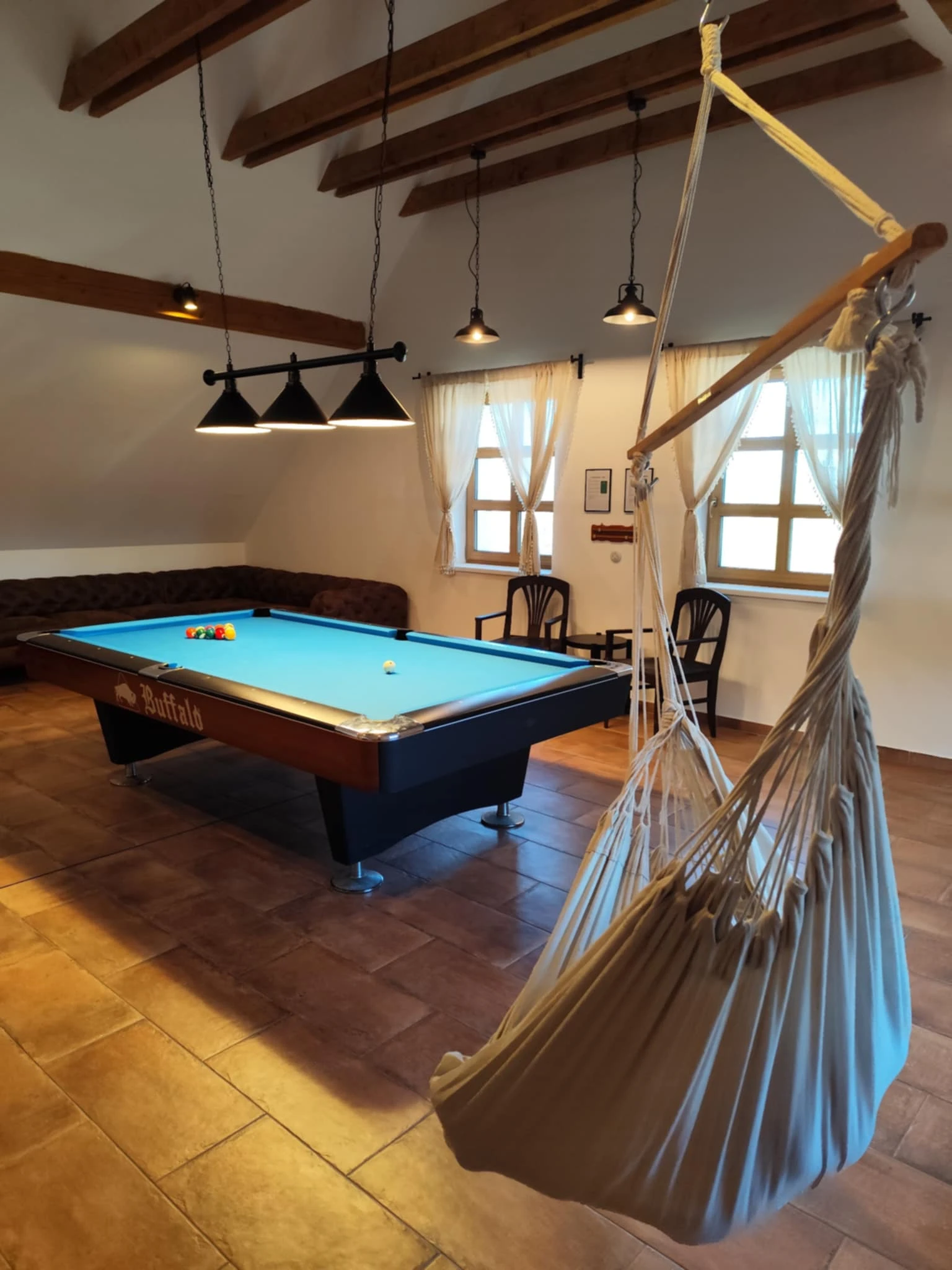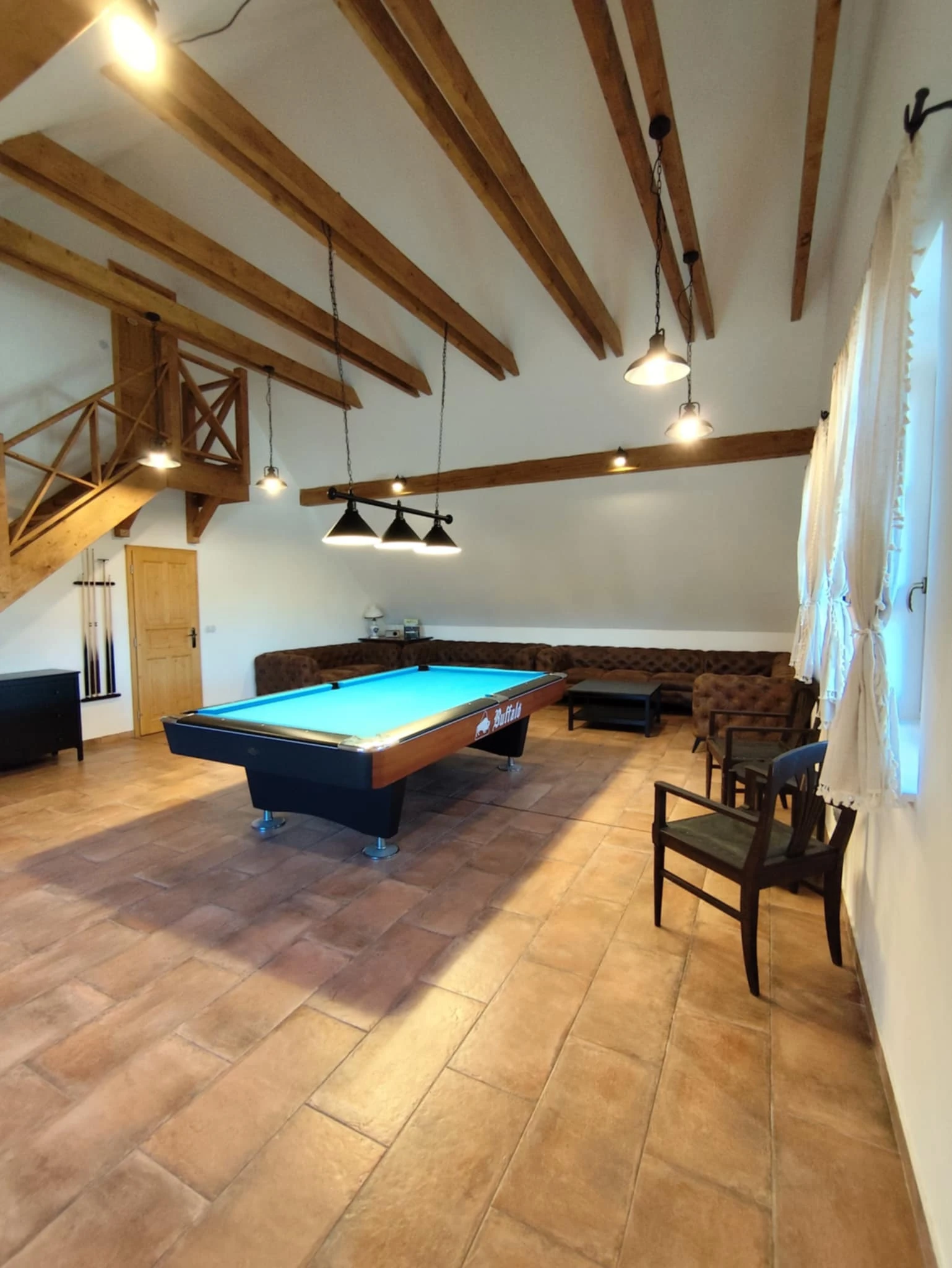 - Herní místnost v patře s kulečníkovým stolem, velkokapacitním posezením a dětským hracím koutkem.