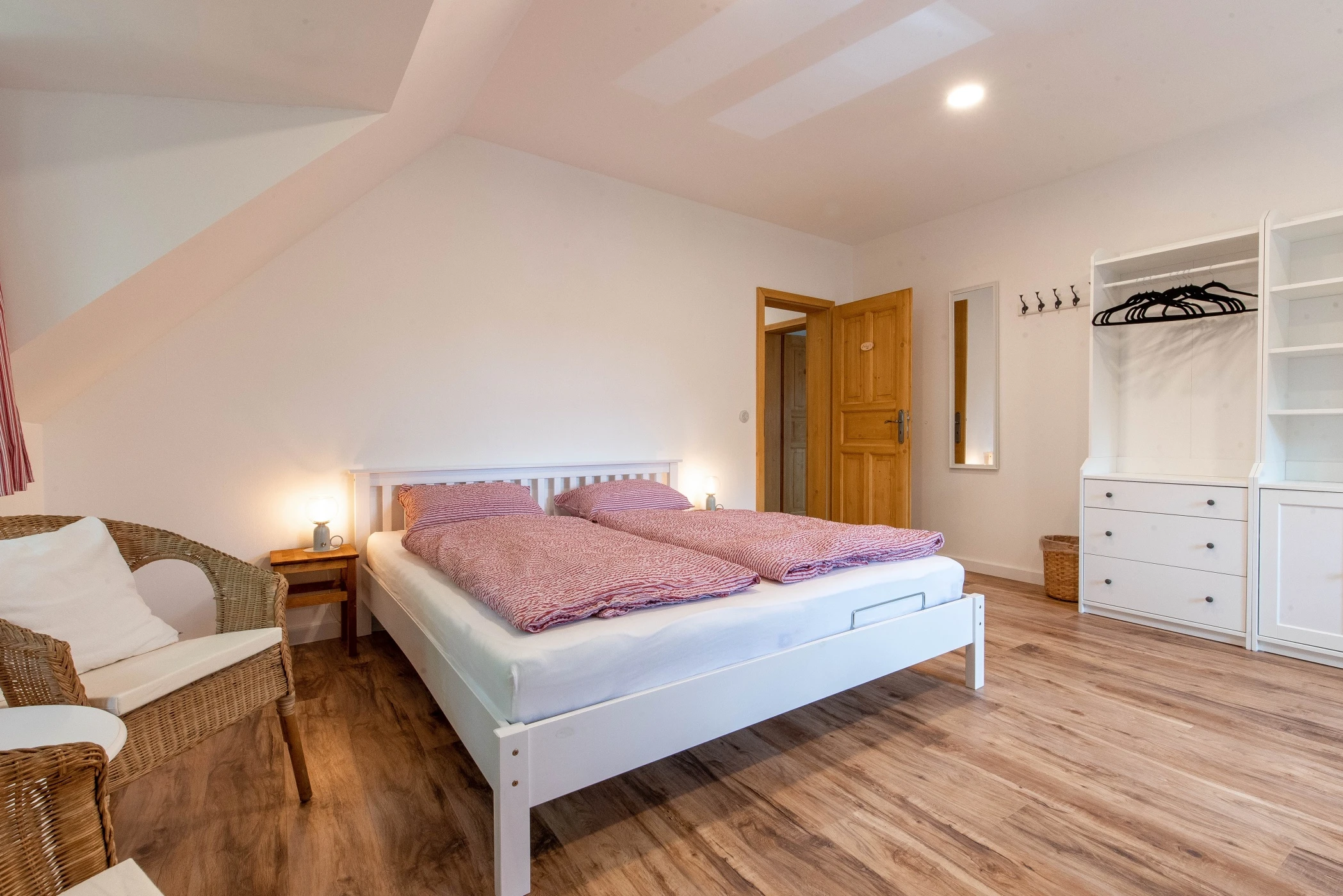 - Každý pokoj obsahuje postele, noční stolky, skříně, věšáky, zrcadlo a křesílka s odkládacím stolkem.