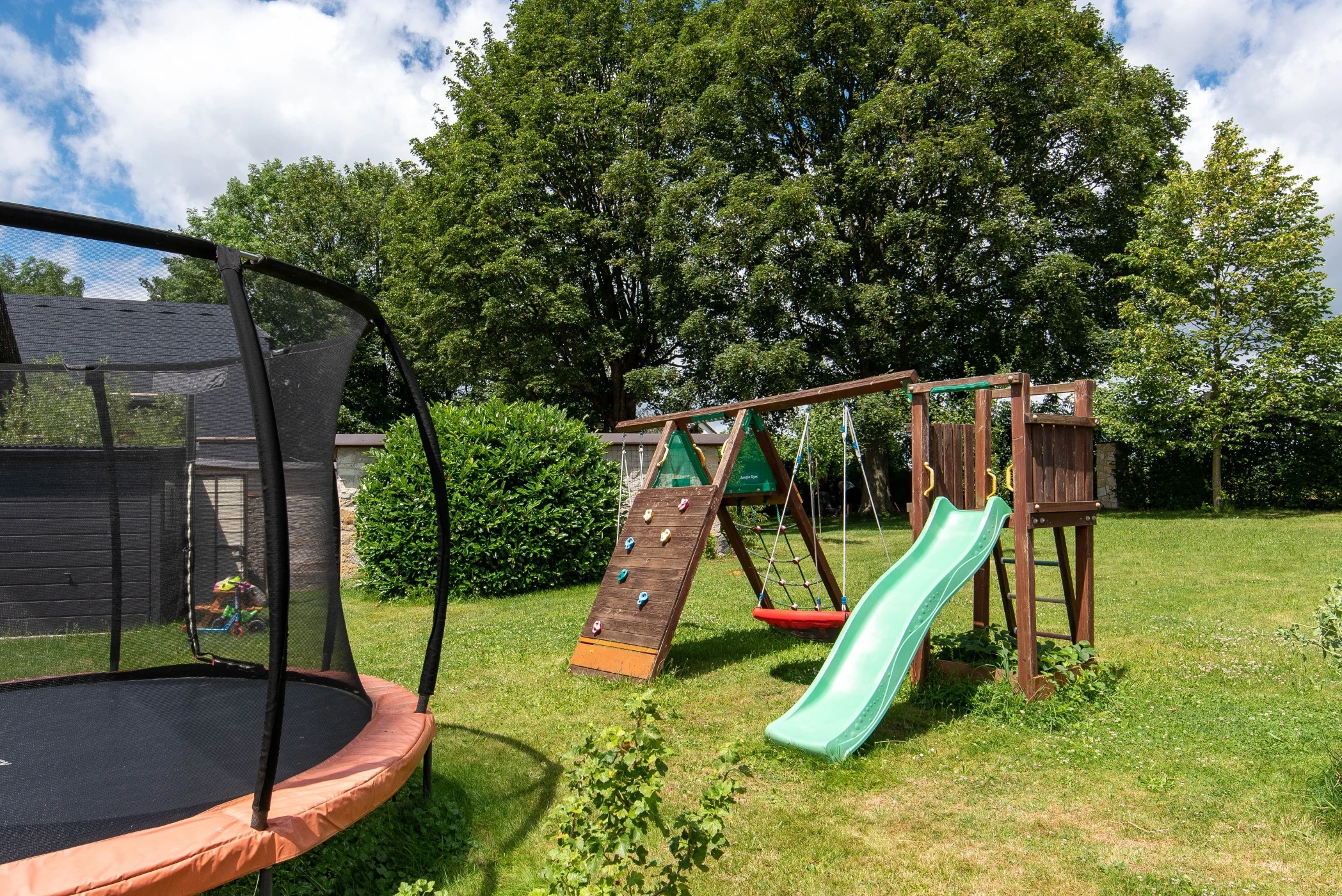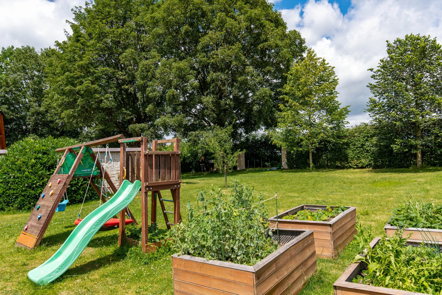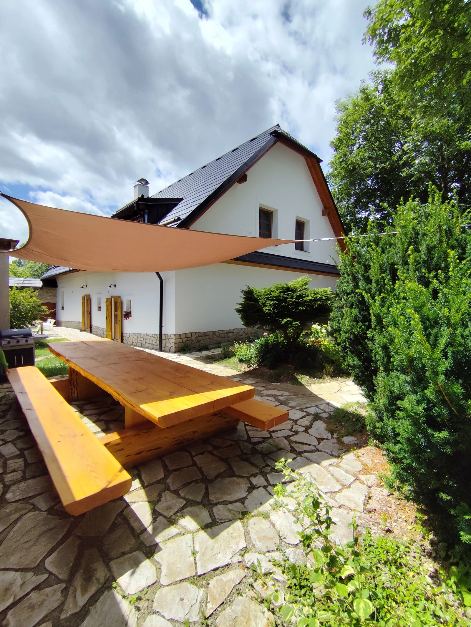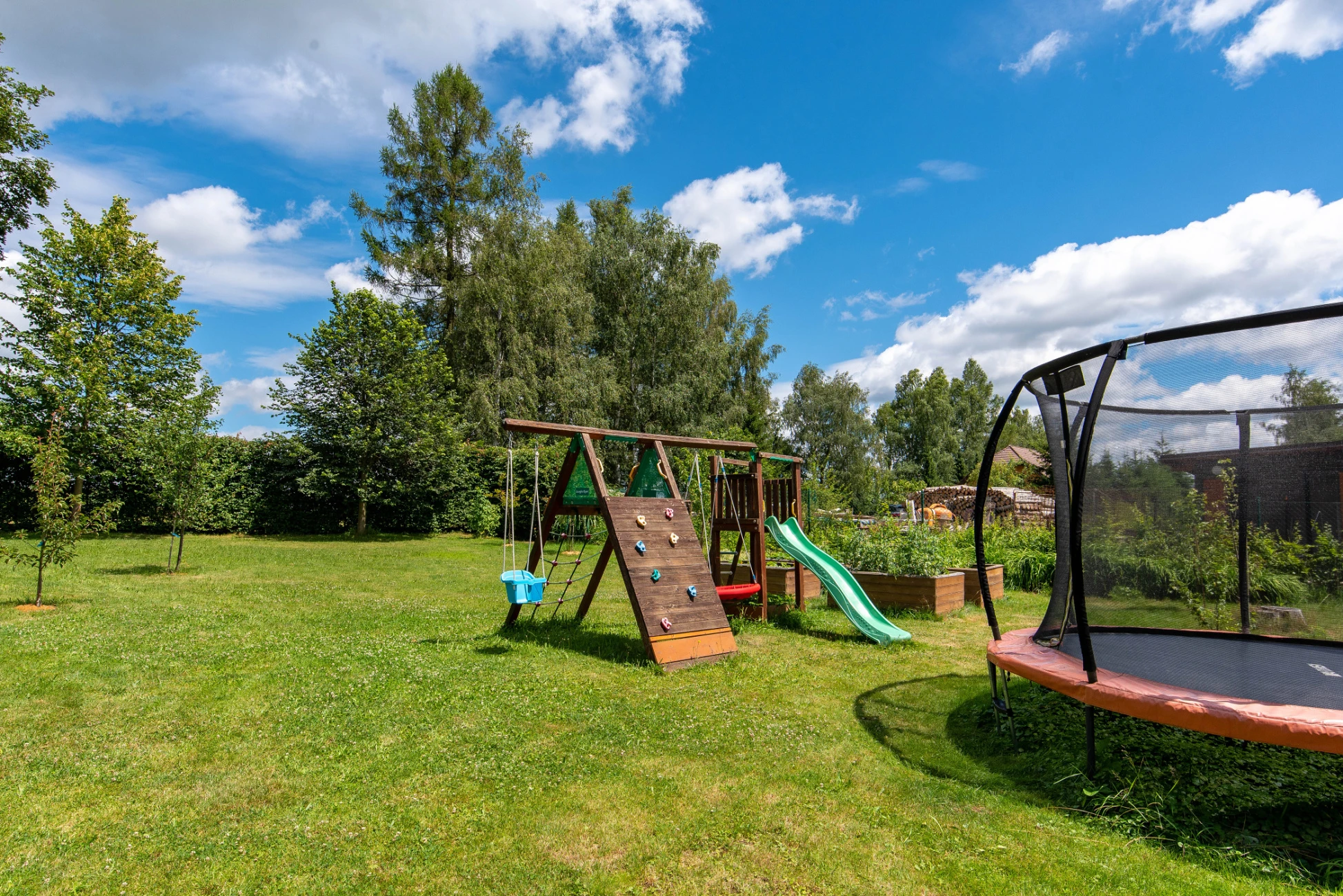 Součástí objektu je uzavřený venkovní dvůr a rozlehlá zahrada, která poskytuje prostor pro odpočinek i aktivity. Hosté mohou využít dvě venkovní posezení, dětské hřiště s houpačkami, trampolínu a prostor pro venkovní hry. V objektu je také možné ubytování menších domácích mazlíčků.
