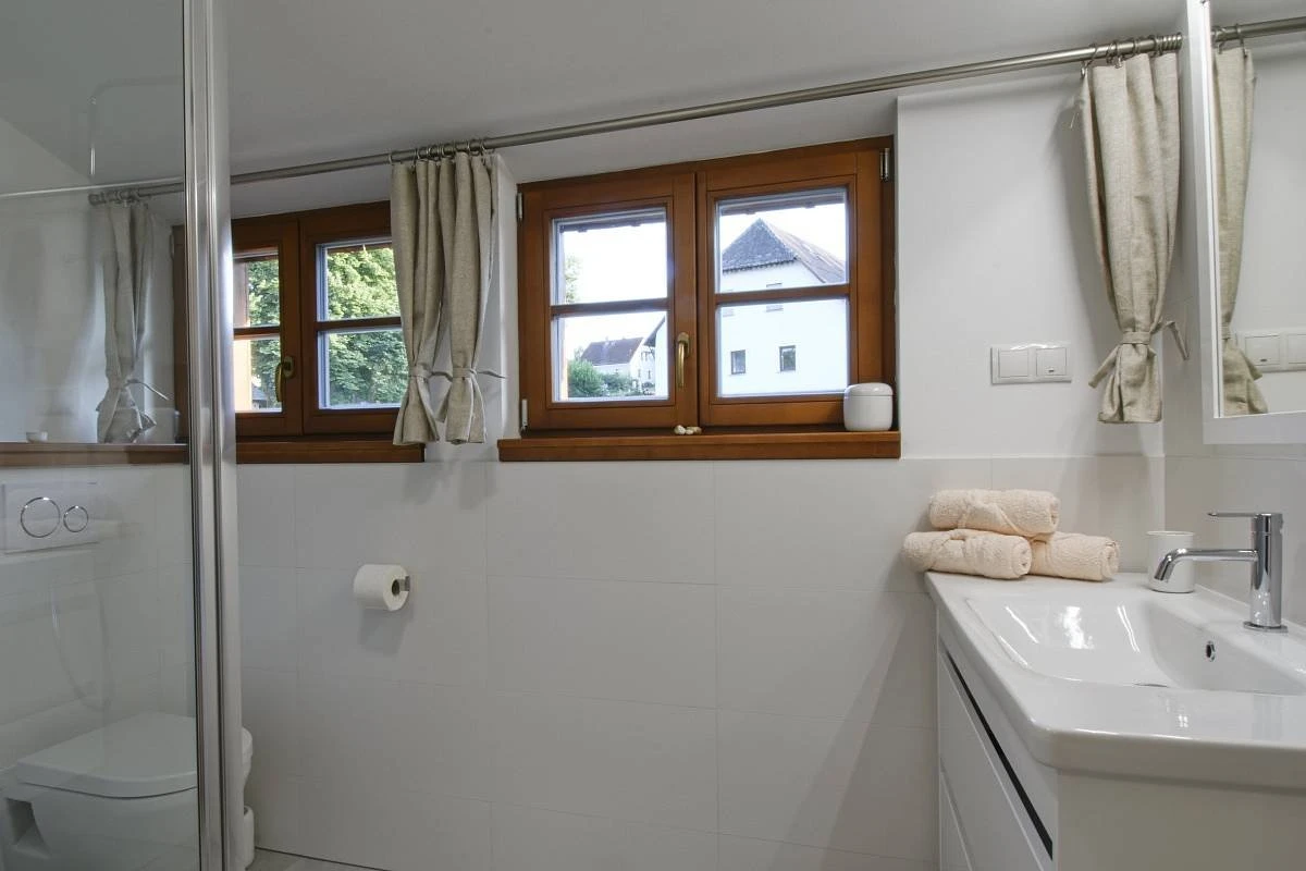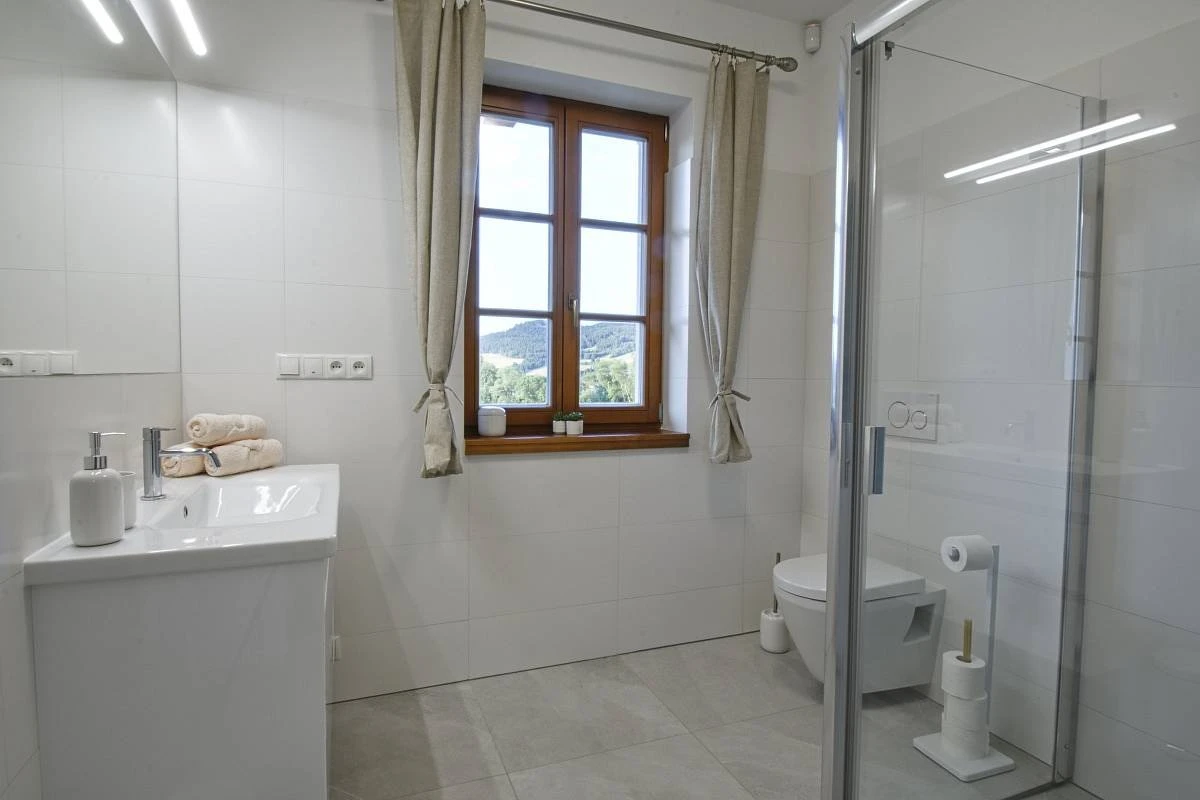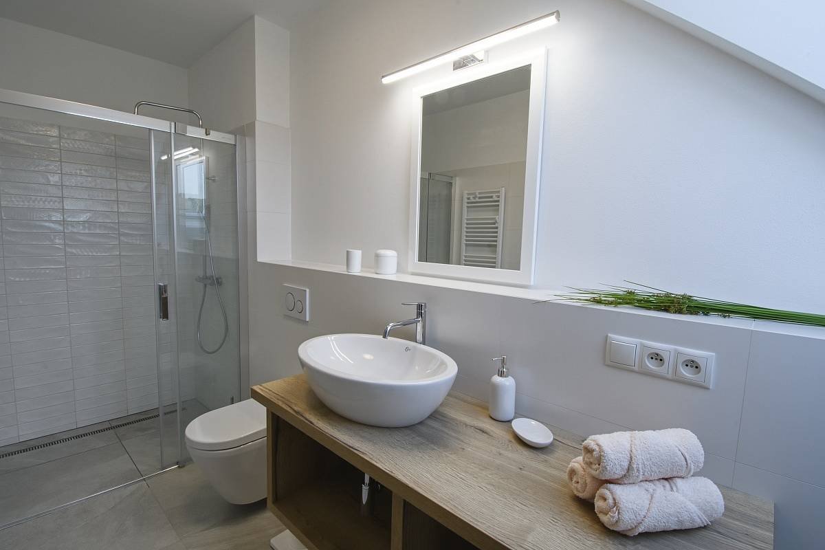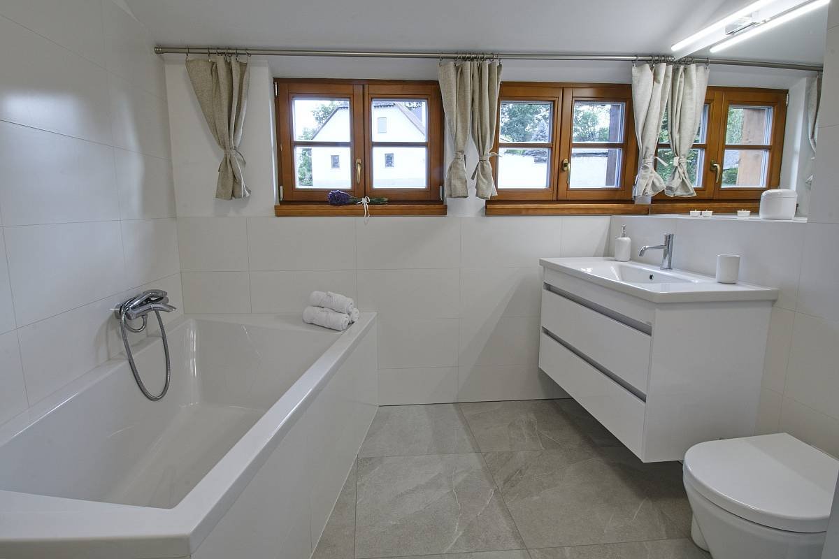 - Pokoj 2: 1 x dvoulůžko, sprcha, vana, umyvadlo, WC