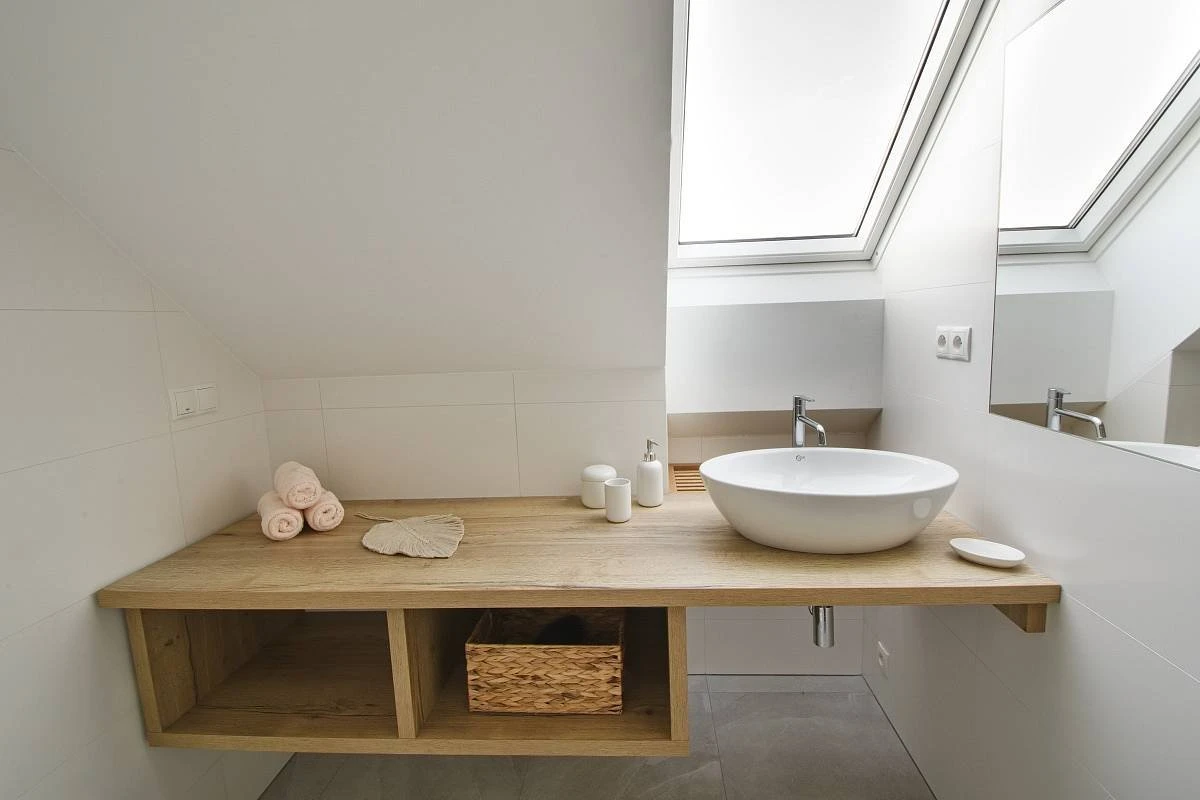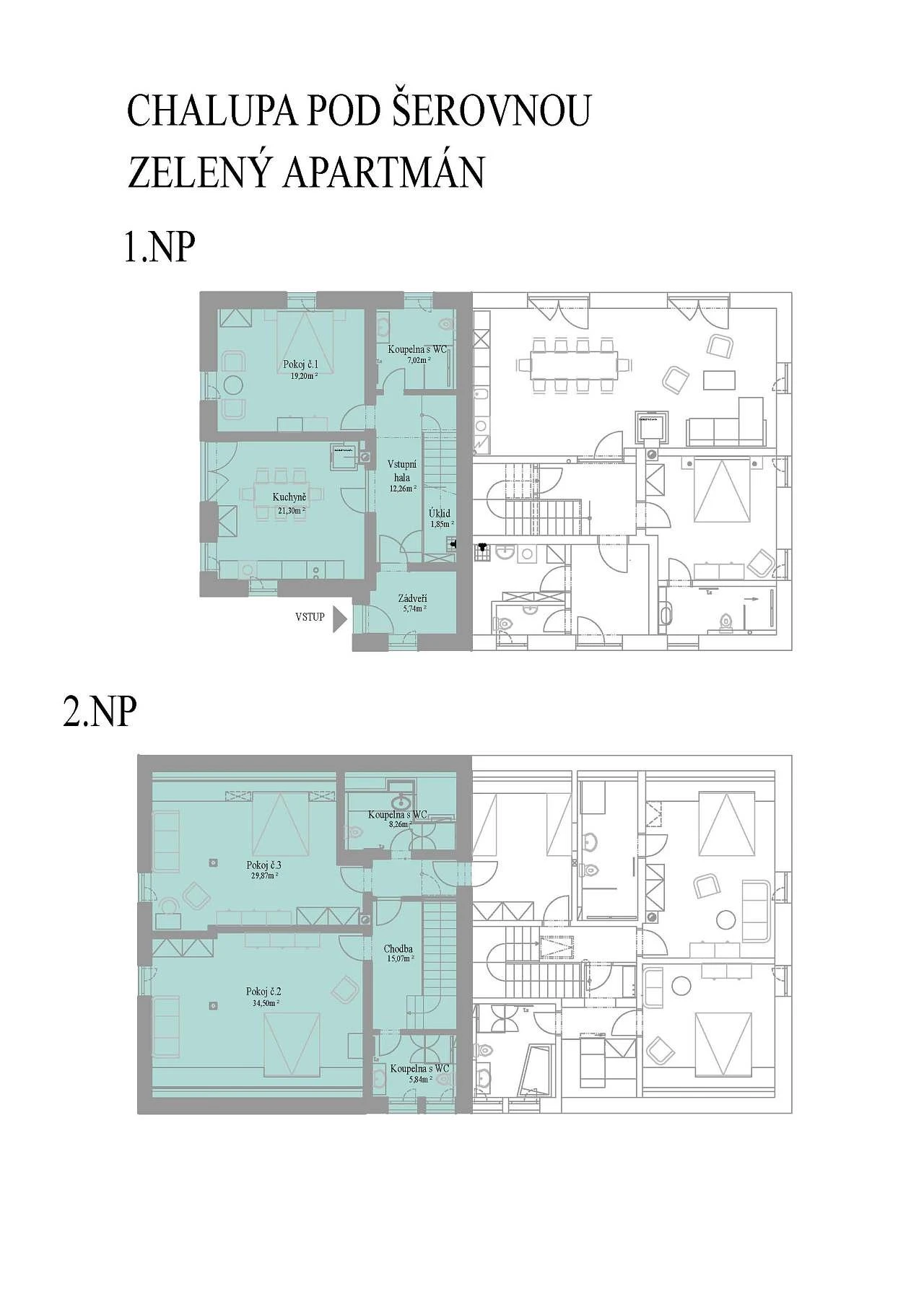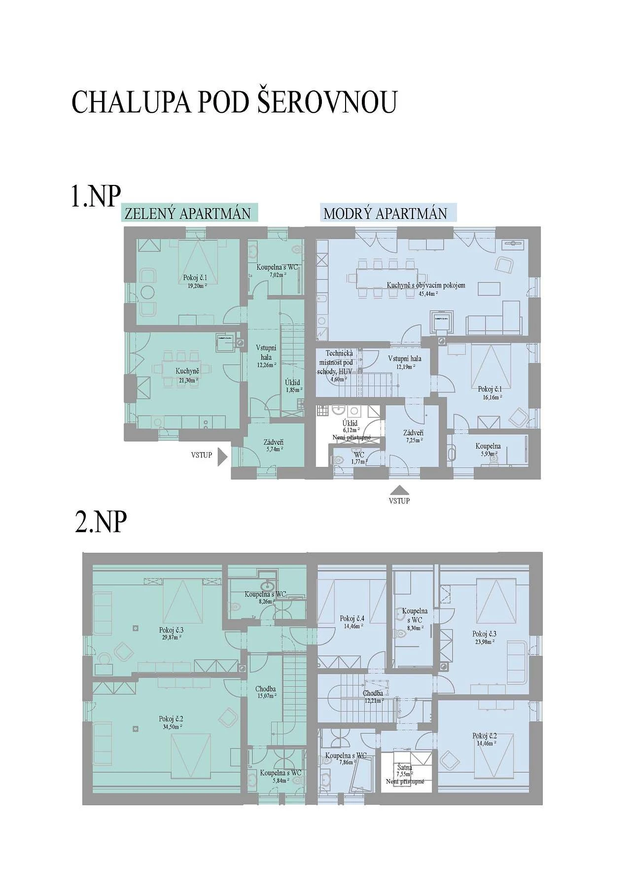 - Pokoj 2: 1 x dvoulůžko, sprcha, vana, umyvadlo, WC