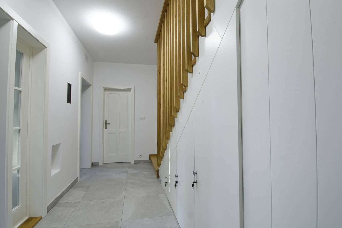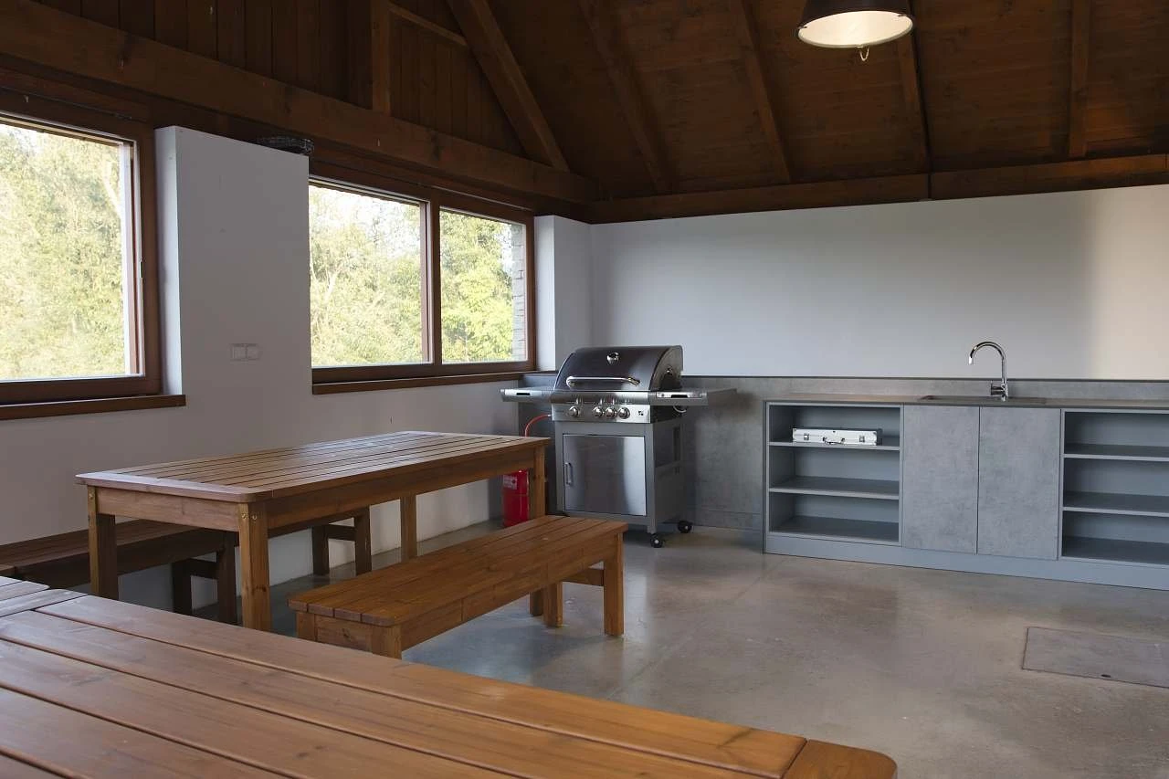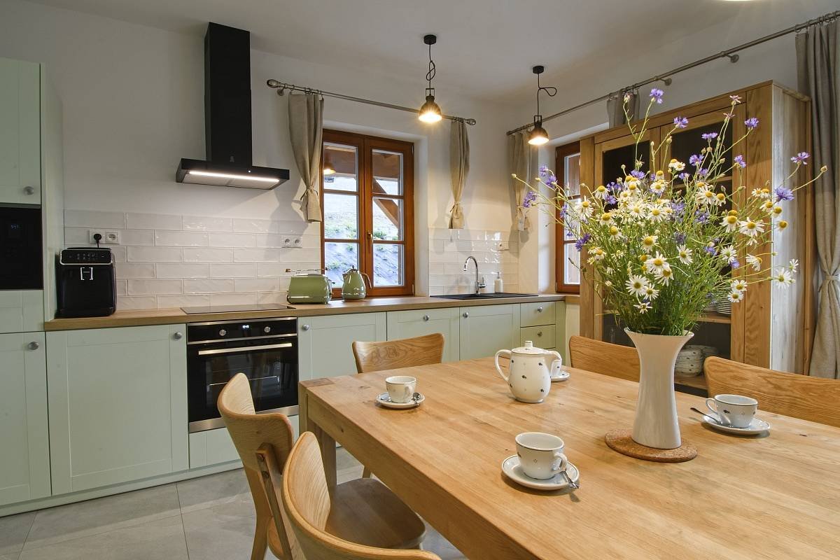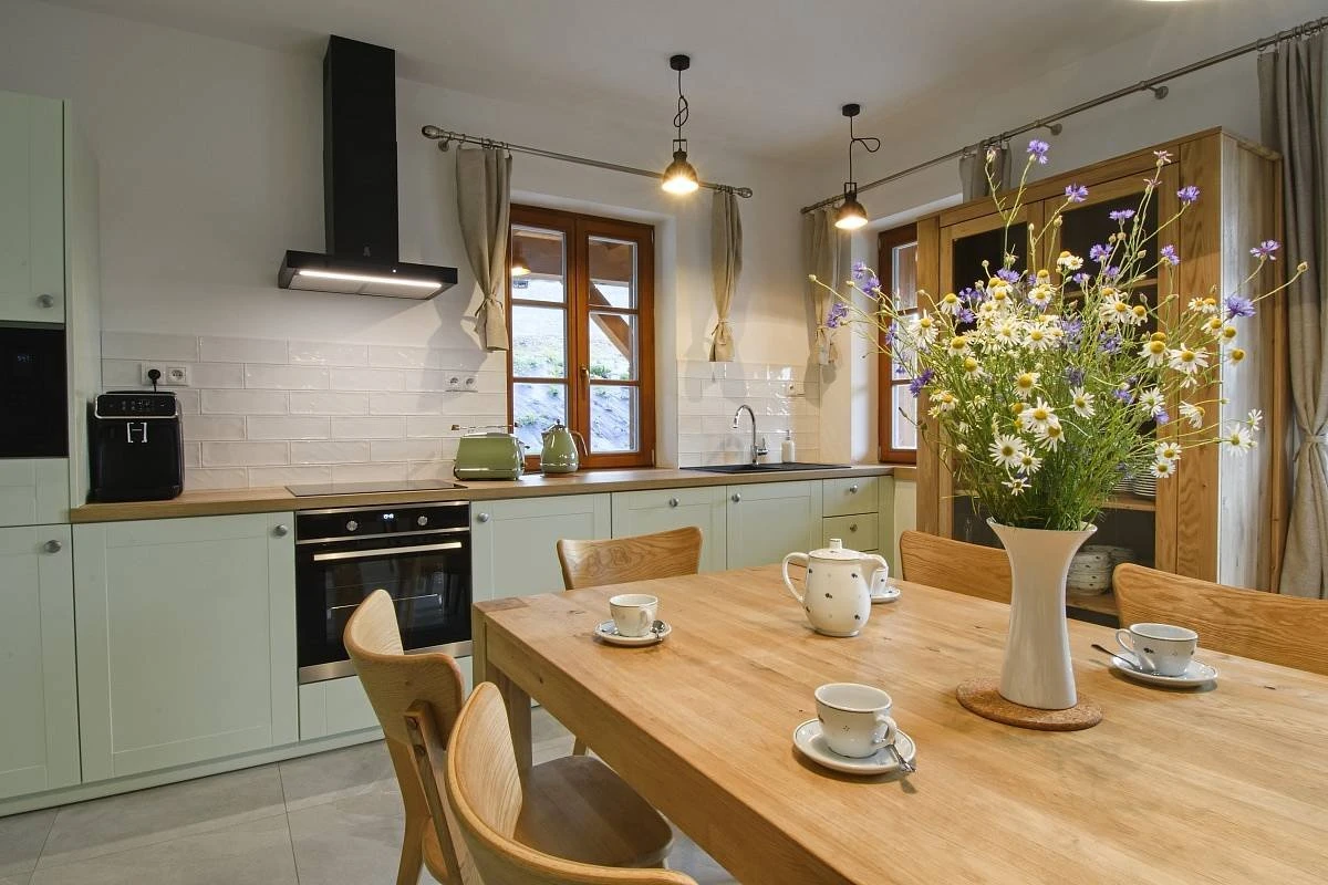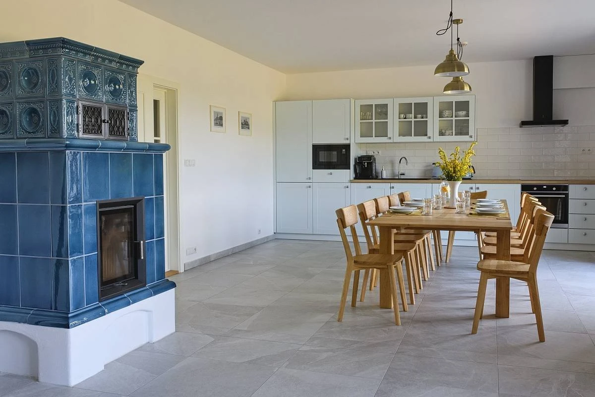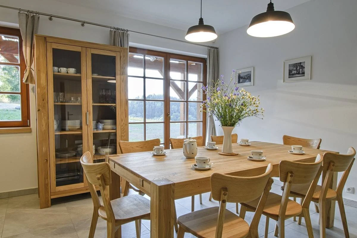 Cena: od 5 600 KčKapacita: 8+1 osobPočet ložnic: 4DispozicePřízemí:Kuchyně s jídelnou a společenskou místností1 ložnice se samostatným sociálním zařízenímSamostatná toaletaVýchod na venkovní posezení s výhledem do krajinyPatro:2 ložnice s vlastním sociálním zařízením1 dvoulůžkový pokoj sdílející sociální zařízení s vedlejším pokojemPokojePokoj 1: 1 x dvoulůžko, sprchový kout, umyvadlo, WCPokoj 2: 1 x dvoulůžko, sprcha, vana, umyvadlo, WCPokoj 3: 1 x dvoulůžko, rozkládací pohovka (140 cm, možnost 2 lůžek), sprcha, umyvadlo, WCPokoj 4: 2 x jednolůžkoKuchyněIndukční deska, elektrická trouba, mikrovlnka, elektrický grilLednice s mrazákem, myčka, topinkovač, toustovač, kávovar, rychlovarná konvice, mixérČisticí prostředky k dispoziciKoupelnaVana nebo sprcha, elektrické topné žebříkyPračka, toaletní papír, ručníky, fén, mýdloDalší vybaveníVelký jídelní stůl až pro 12 osobDětská židlička a postýlkaRozkládací sedací soupravaProstorné skříně v ložnicíchTV ve společenské místnosti