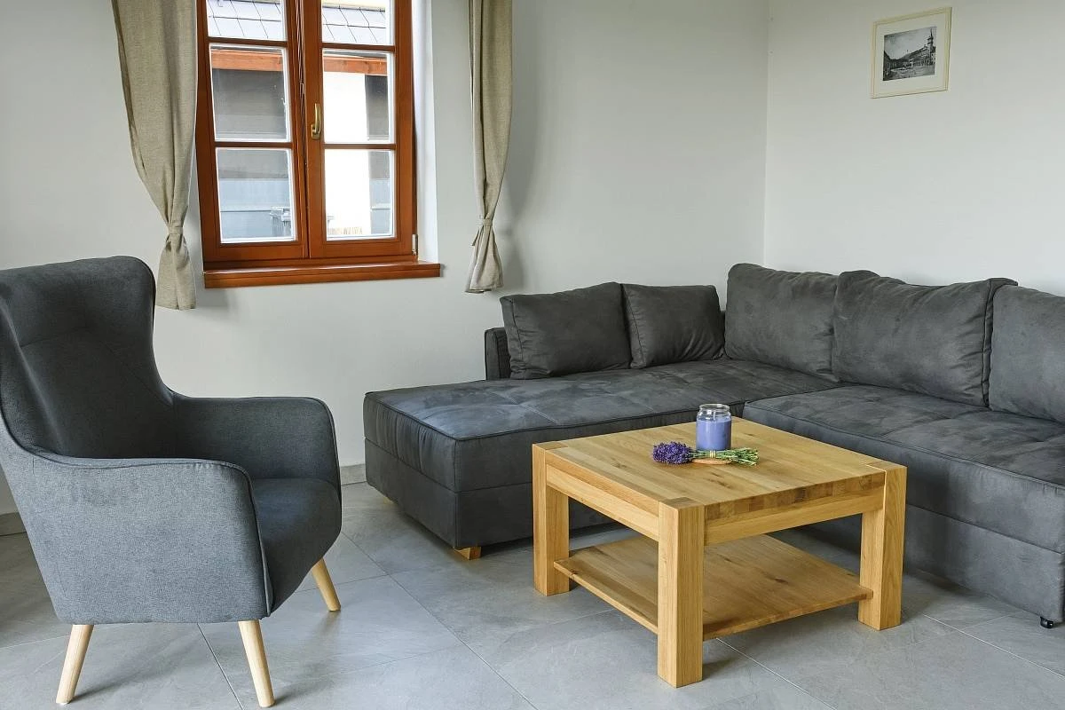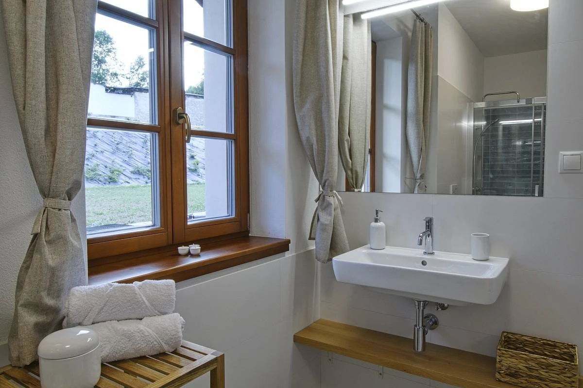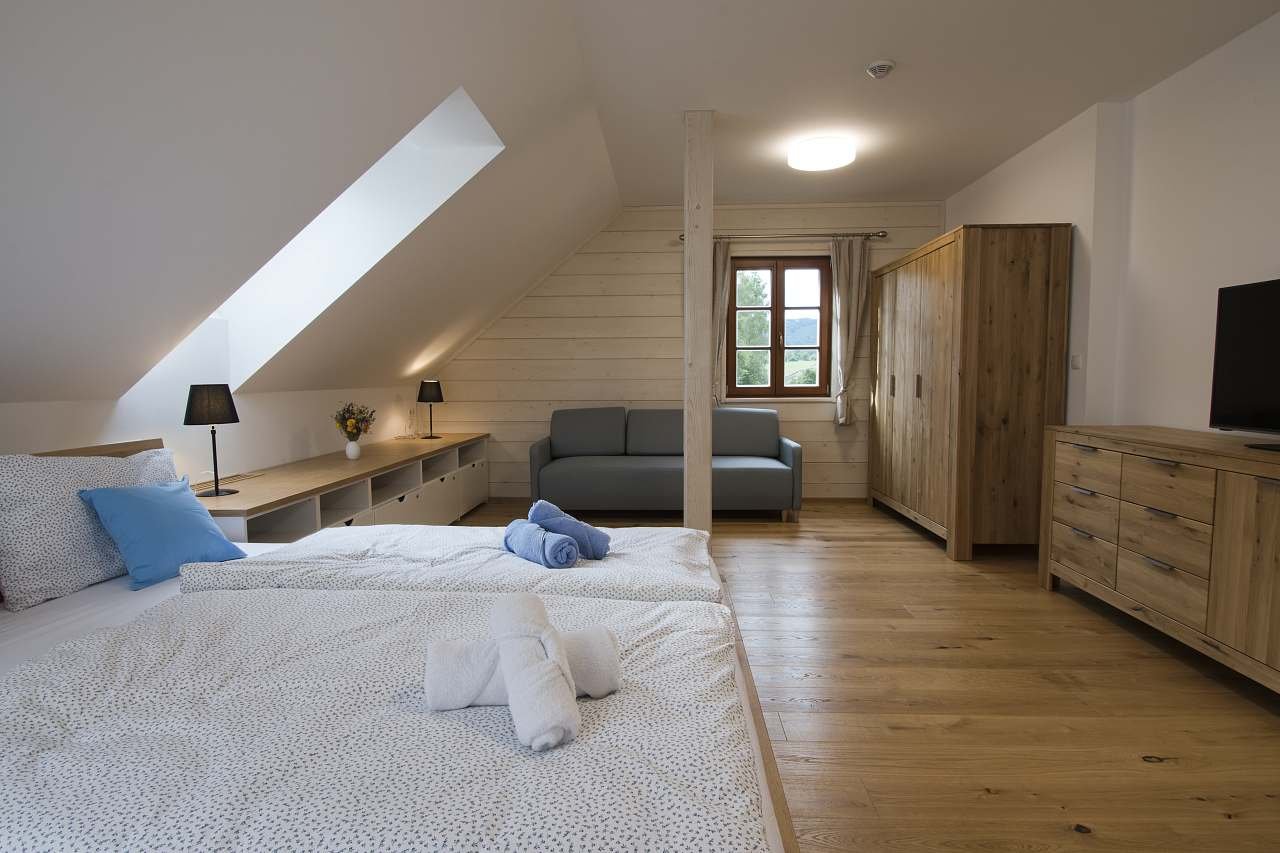- Pokoj 3: 1 x dvoulůžko, rozkládací pohovka (140 cm, možnost 2 lůžek), TV, sprchový kout, umyvadlo, WC