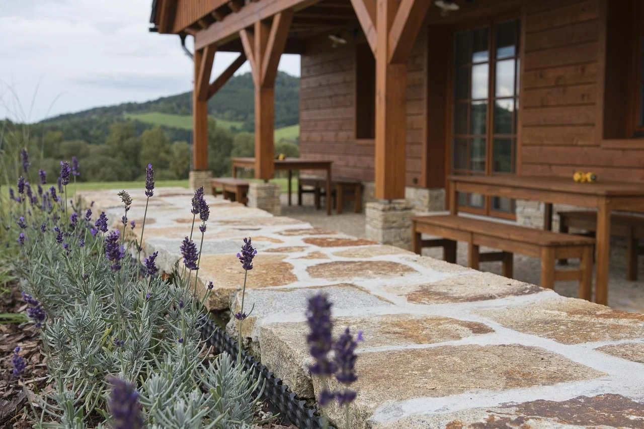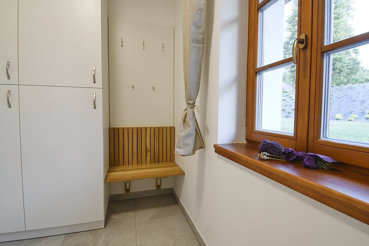 - Východ na krytou terasu s posezením a výhledem do krajiny