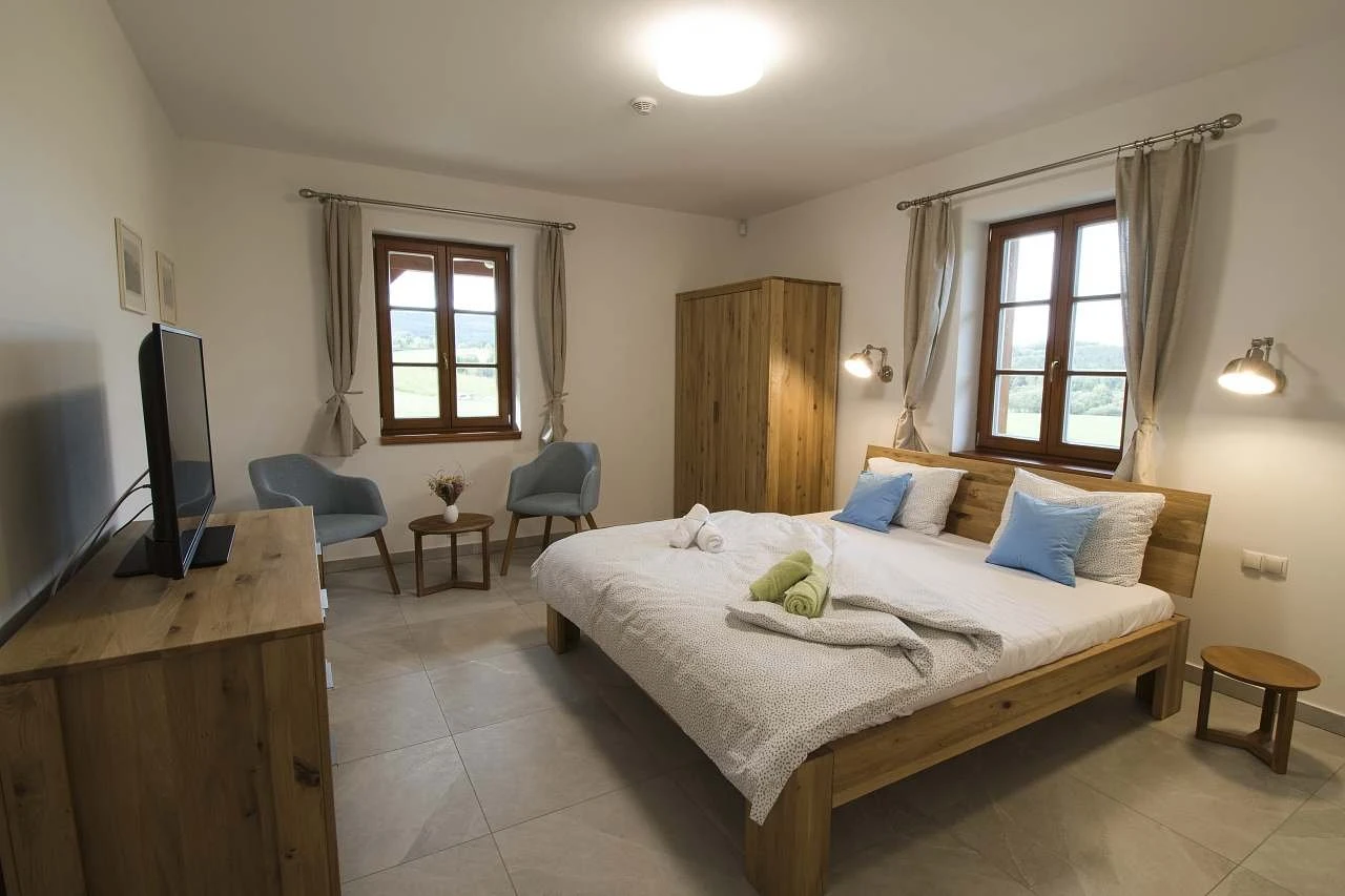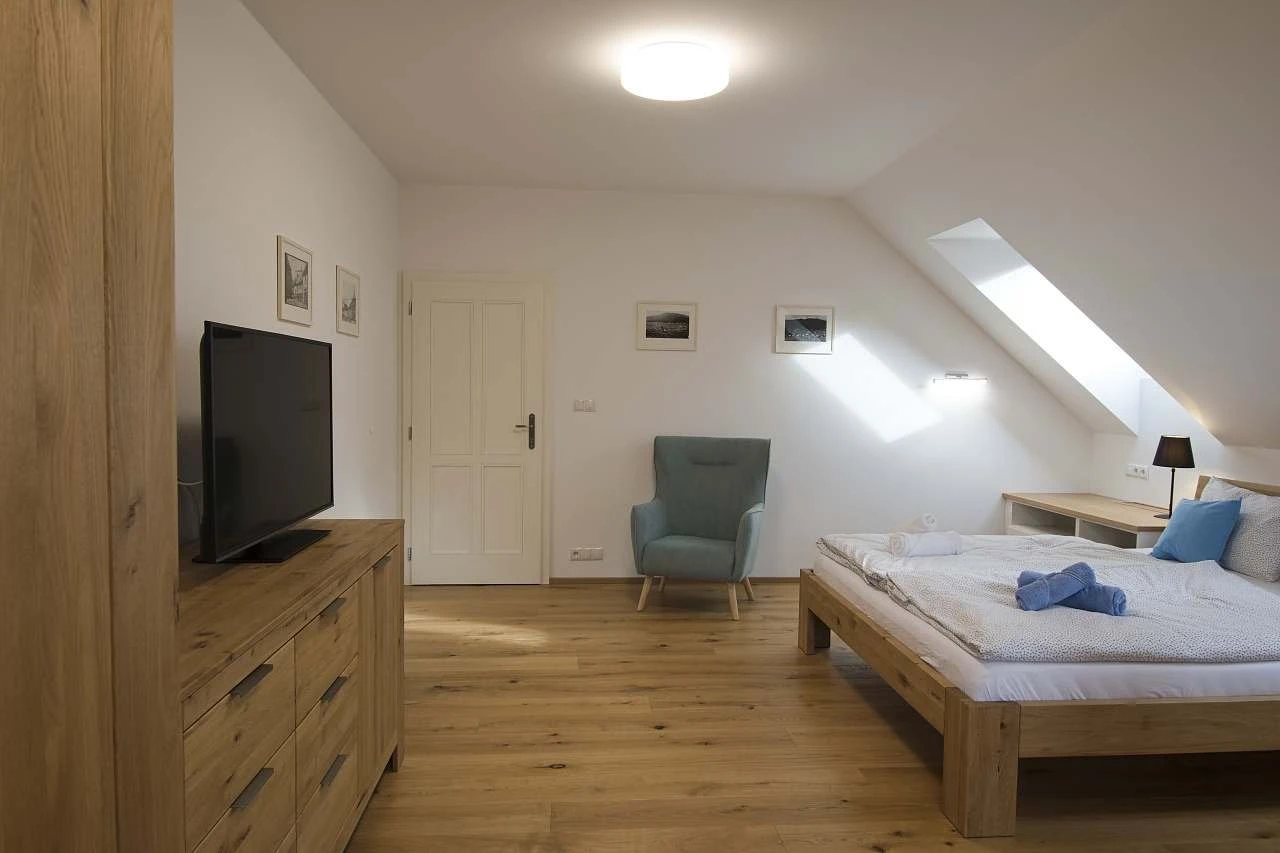 - Pokoj 2: 1 x dvoulůžko, rozkládací pohovka (140 cm, možnost 2 lůžek), TV, sprchový kout, umyvadlo, WC