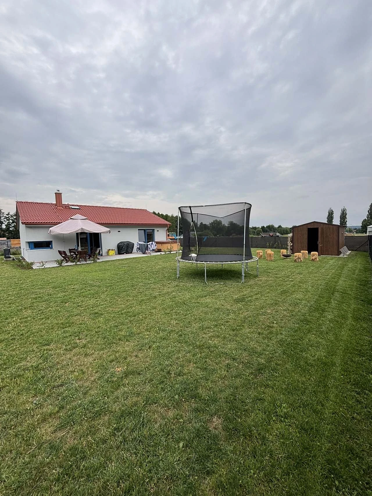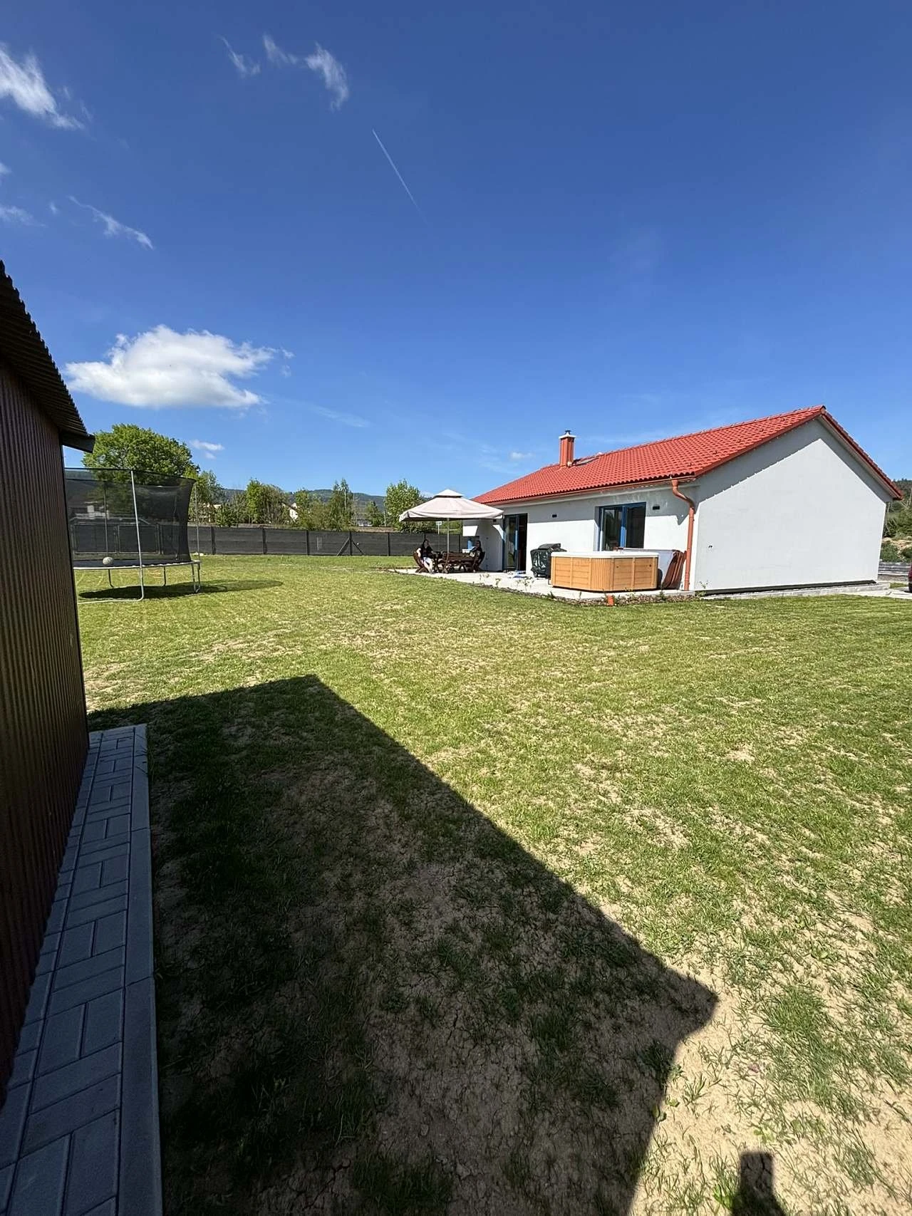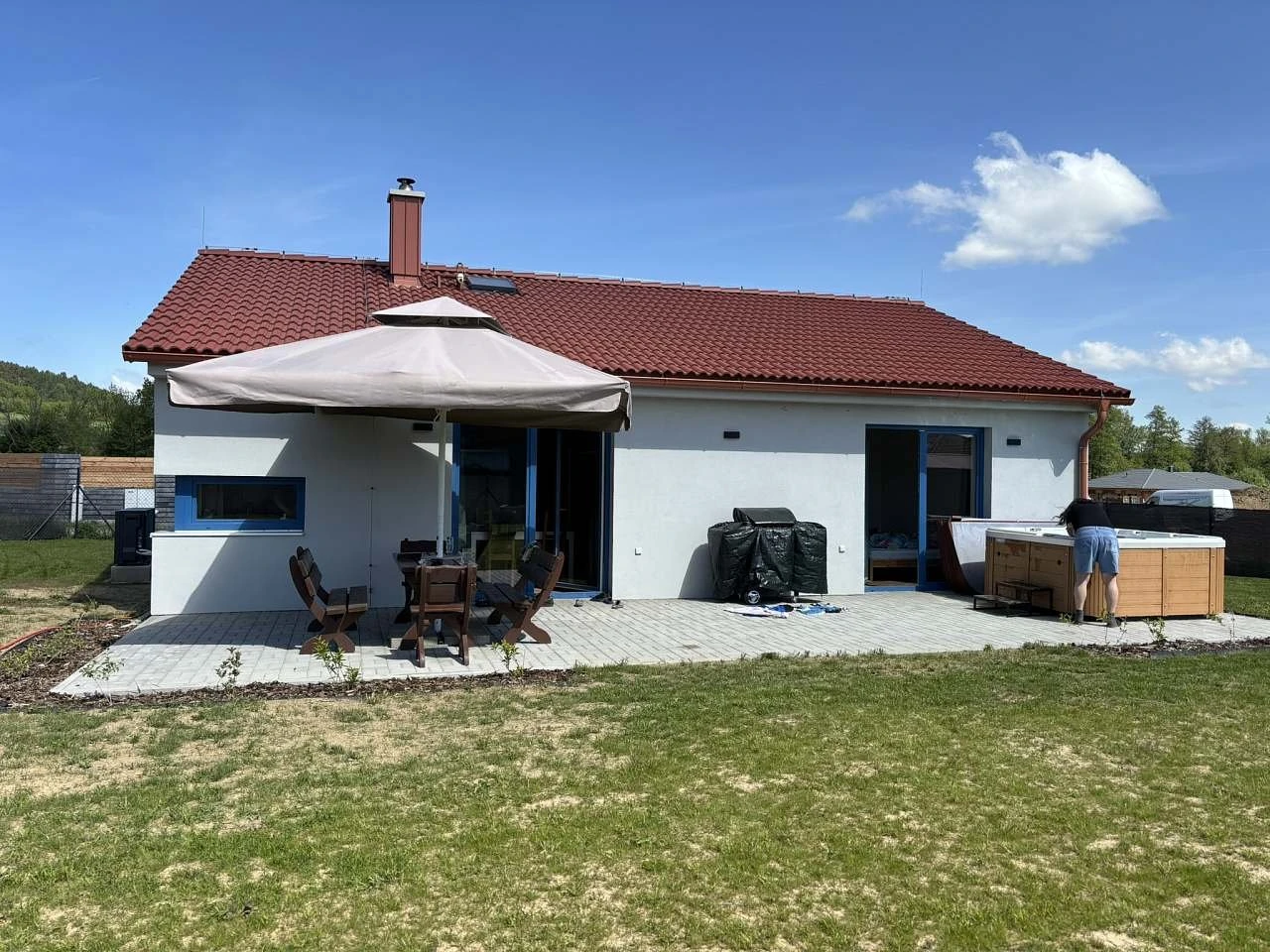 Venkovní vybavení zahrnuje terasu, zahradní nábytek a venkovní plynový gril. Pozemek je oplocený, s vlastním parkováním, nachází se na něm travnatá plocha a objekt leží u potoka.