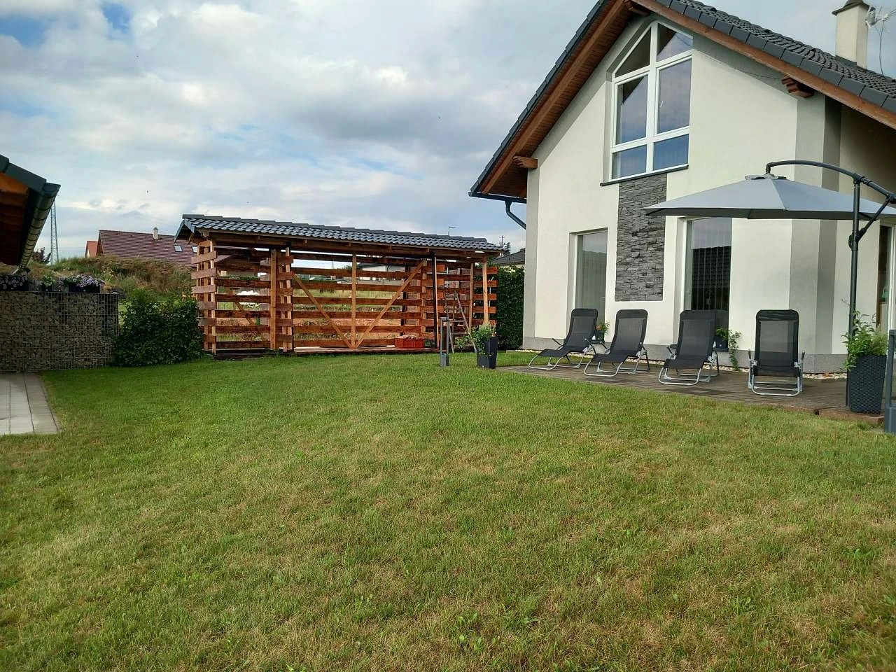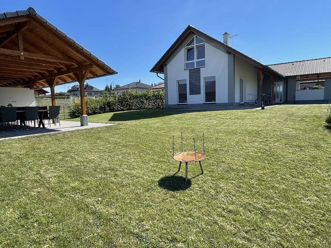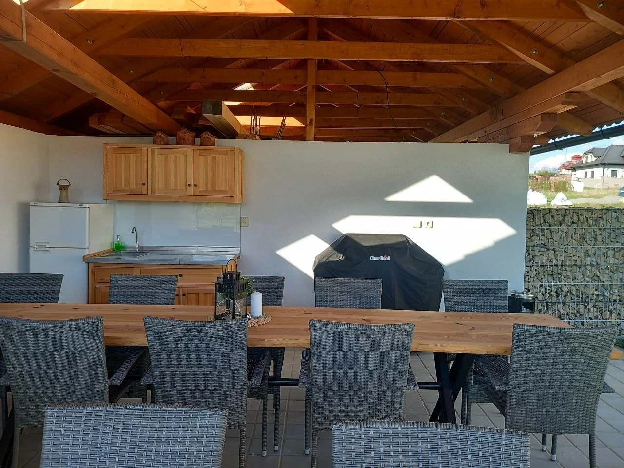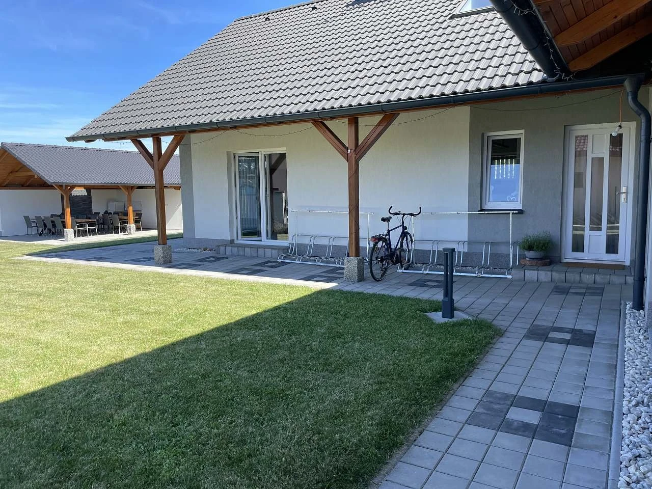 K dispozici je venkovní bazén, oplocený pozemek a zázemí pro děti, včetně houpaček, prolézaček, hraček a dětské postýlky. Na zahradě se nachází kryté posezení s grilem, venkovní kuchyně s lednicí a přenosné ohniště. Součástí vybavení jsou také kryté stojany na kola (až pro 10 kol) a uzamykatelná místnost se sociálním zařízením, kterou lze využít jako kolárnu nebo úložný prostor pro kočárky. V bezprostřední blízkosti domu je dětské hřiště.