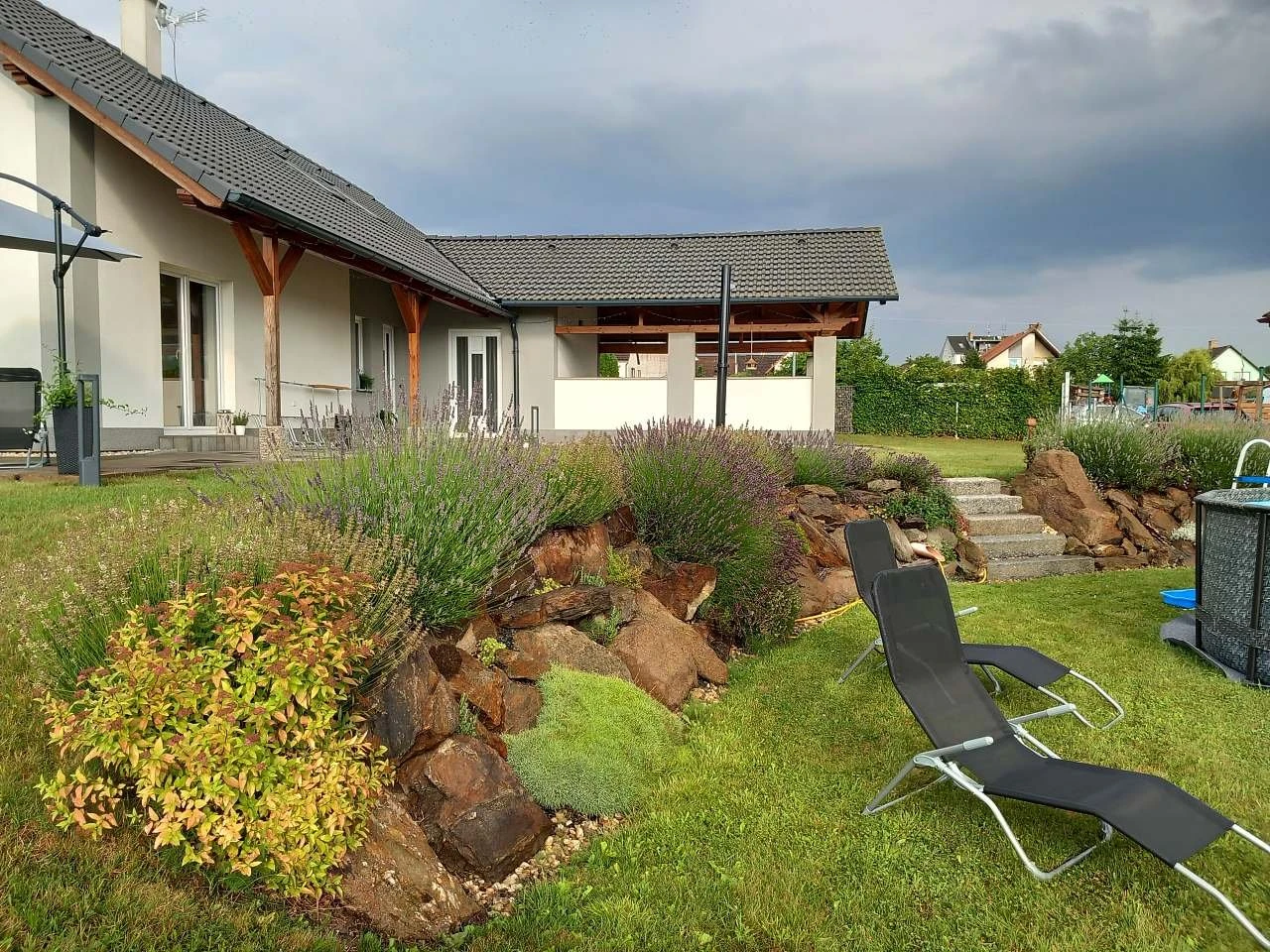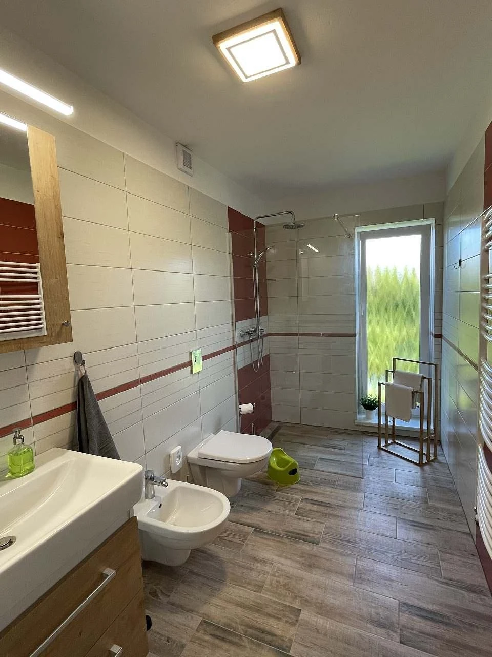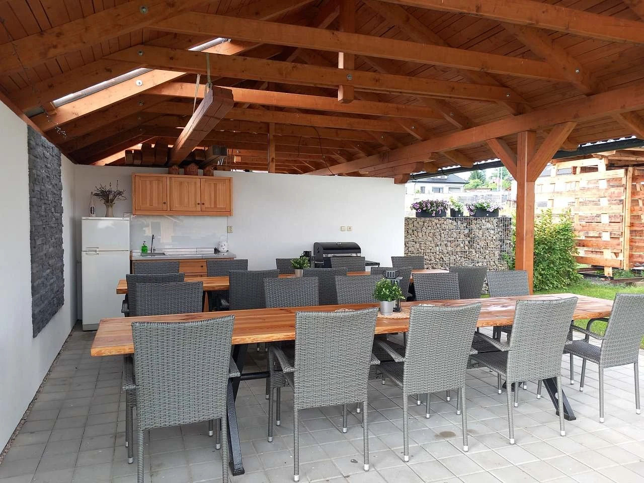 K dispozici je venkovní bazén, oplocený pozemek a zázemí pro děti, včetně houpaček, prolézaček, hraček a dětské postýlky. Na zahradě se nachází kryté posezení s grilem, venkovní kuchyně s lednicí a přenosné ohniště. Součástí vybavení jsou také kryté stojany na kola (až pro 10 kol) a uzamykatelná místnost se sociálním zařízením, kterou lze využít jako kolárnu nebo úložný prostor pro kočárky. V bezprostřední blízkosti domu je dětské hřiště.