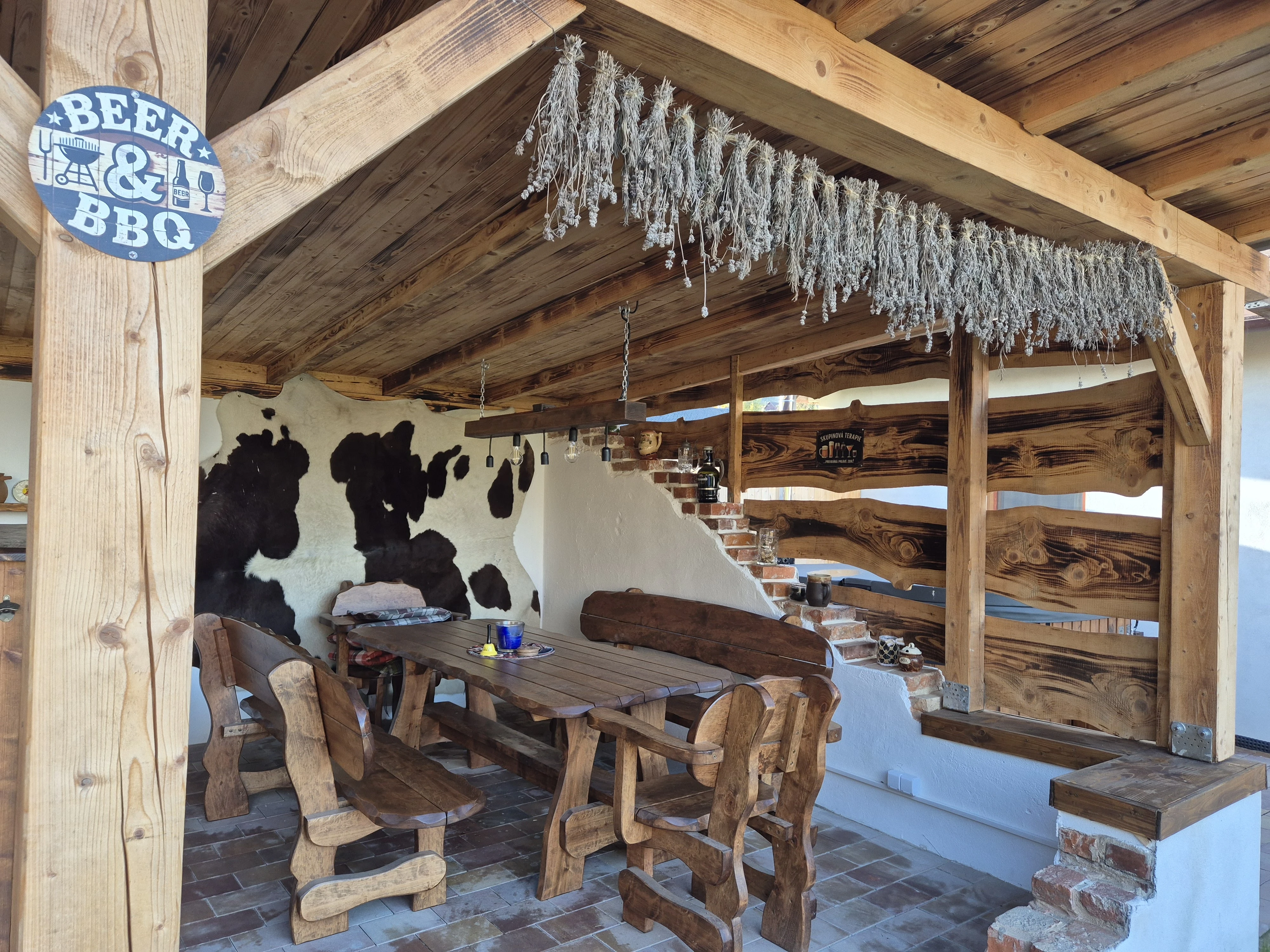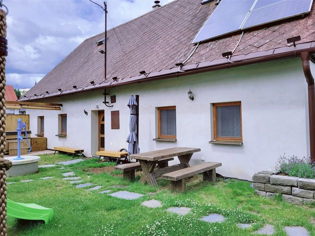 Exteriér: Pozemek je rozsáhlý a krásně upravený, nabízí koupací káď s masážními tryskami a LED osvětlením, altán s posezením a zabudovanou pípou. K dispozici je gril a ohniště pro opékání. Pro děti je připraveno dřevěné hřiště. Objekt disponuje pěti parkovacími místy.