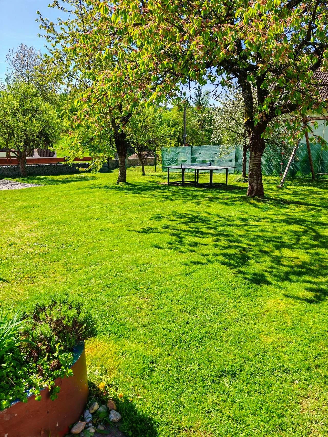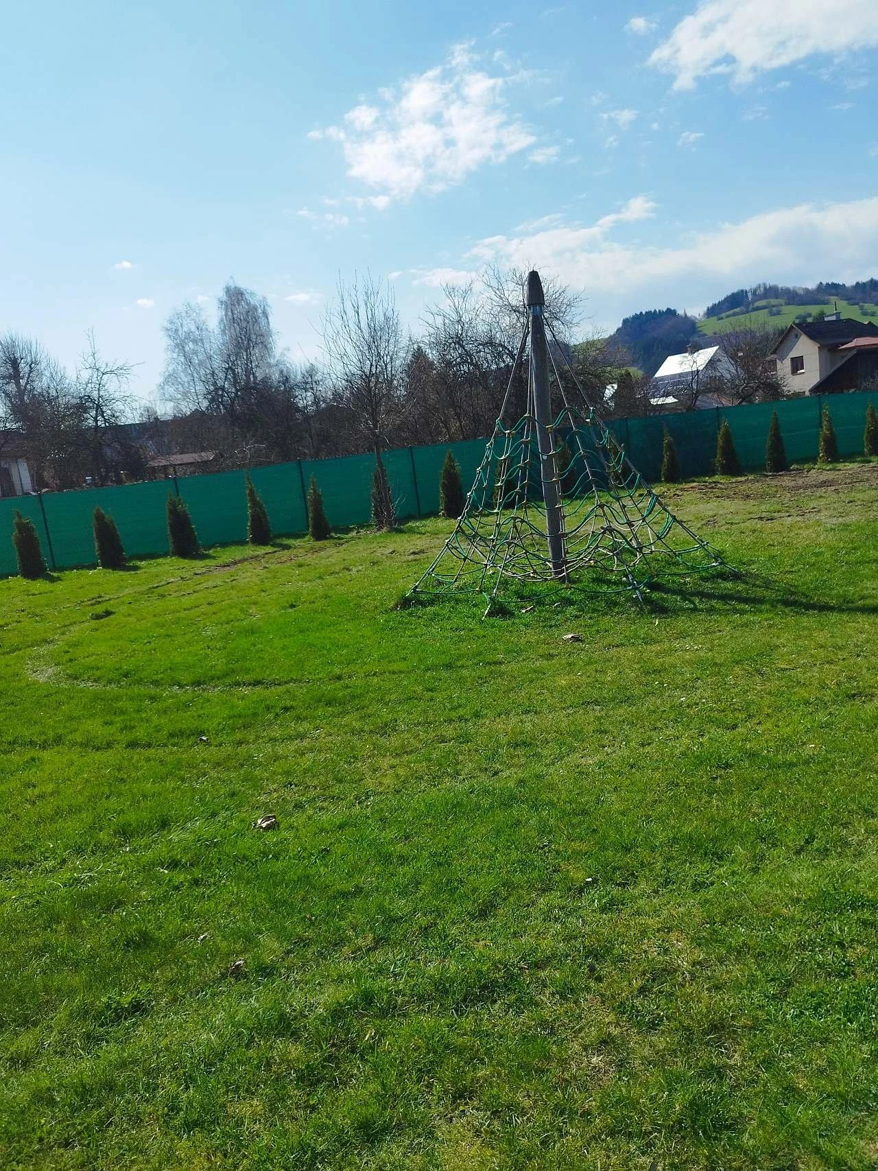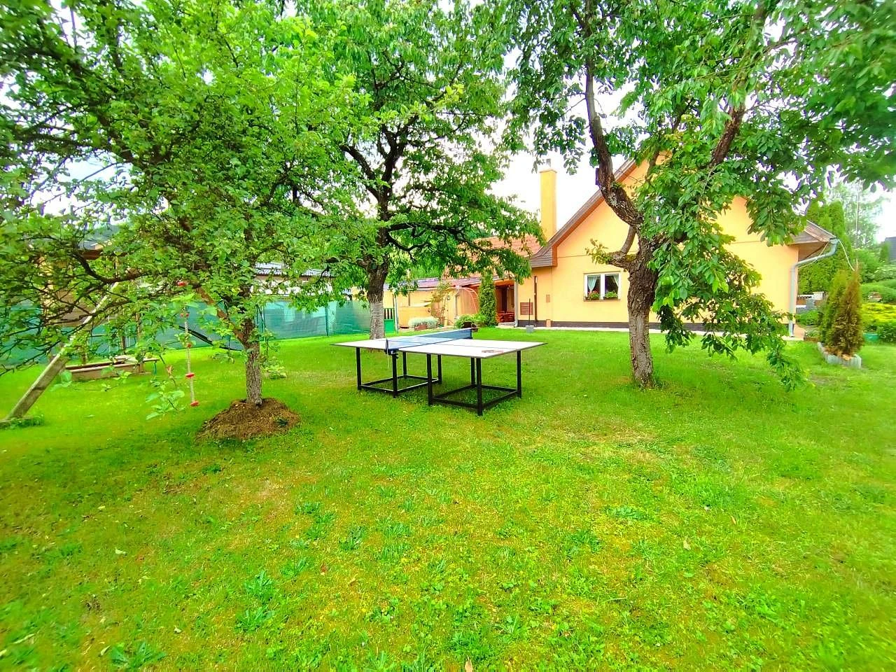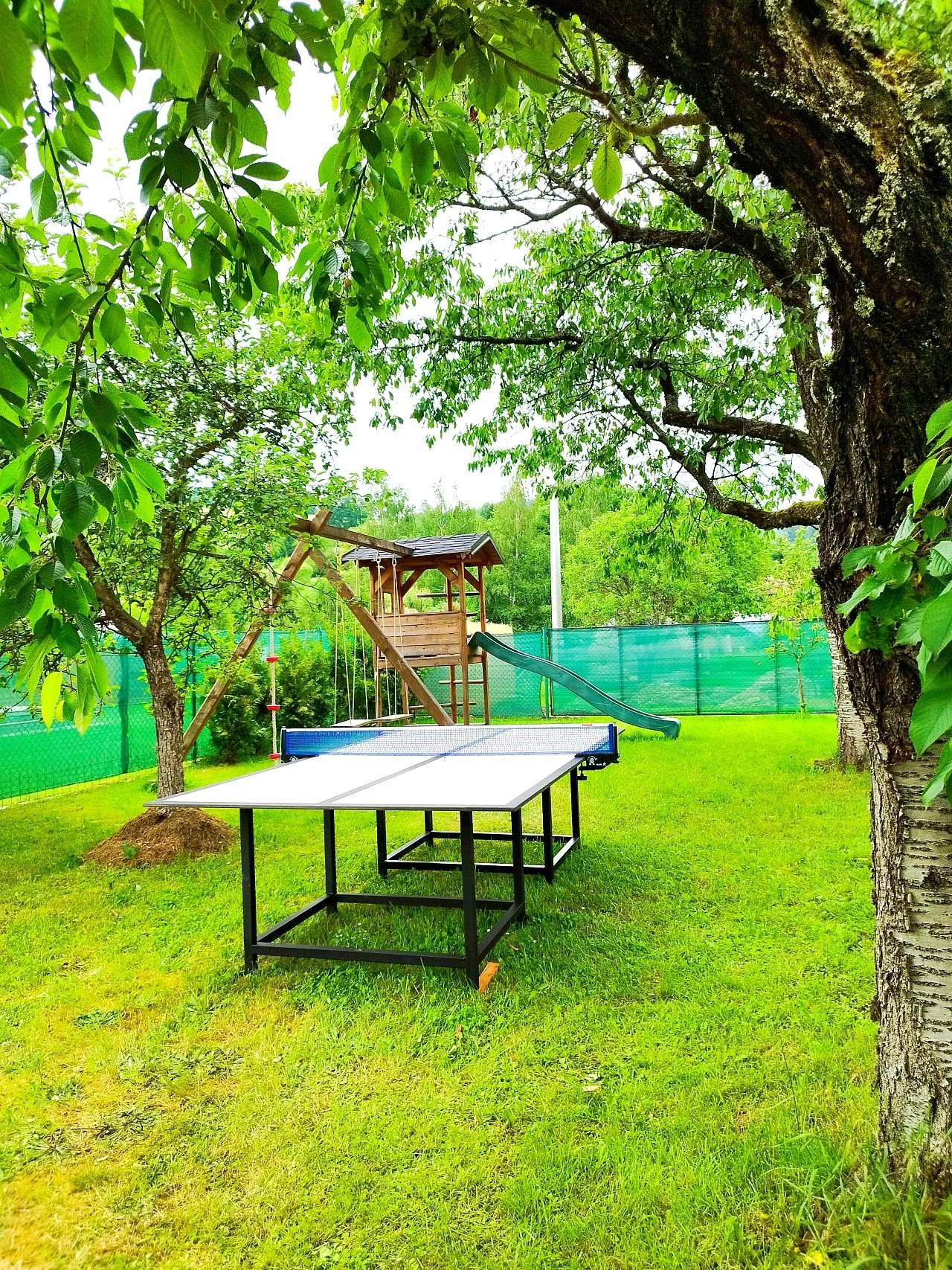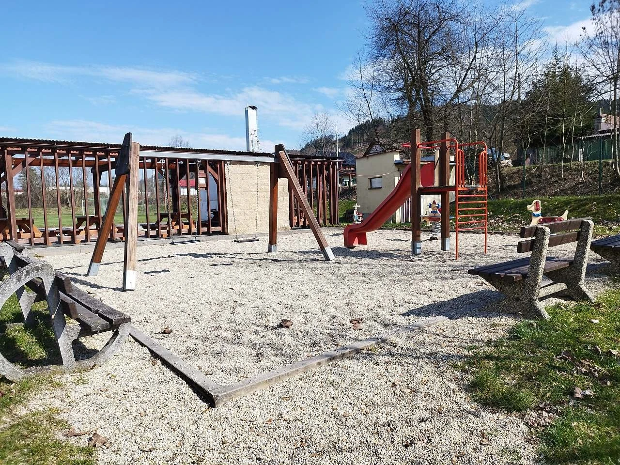 Venkovní část nabízí krytou terasu s posezením a grilem, dětské hřiště (pískoviště, houpačky, skluzavka), dětský koutek a travnatou plochu pro hry. Chalupa je oplocená, s parkováním přímo u objektu, zahradou a zahradním nábytkem.