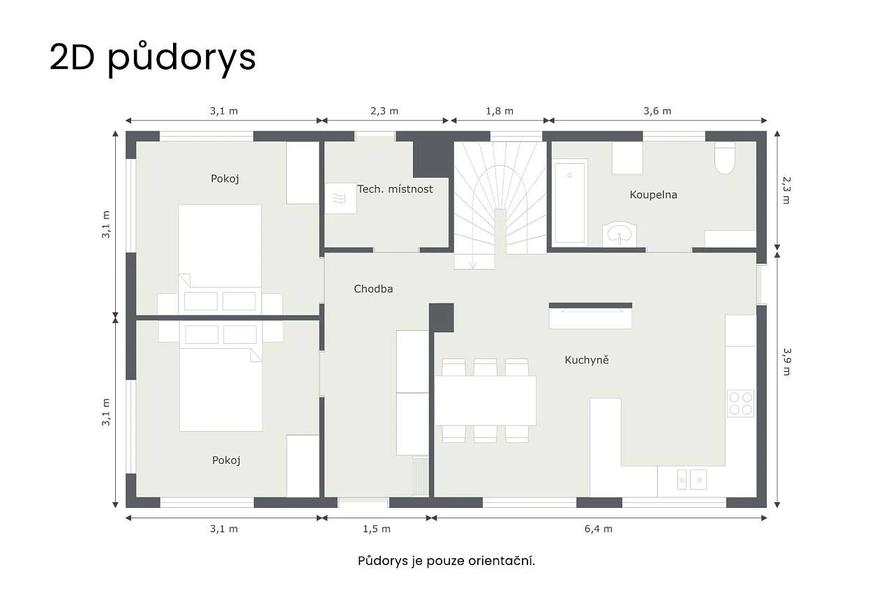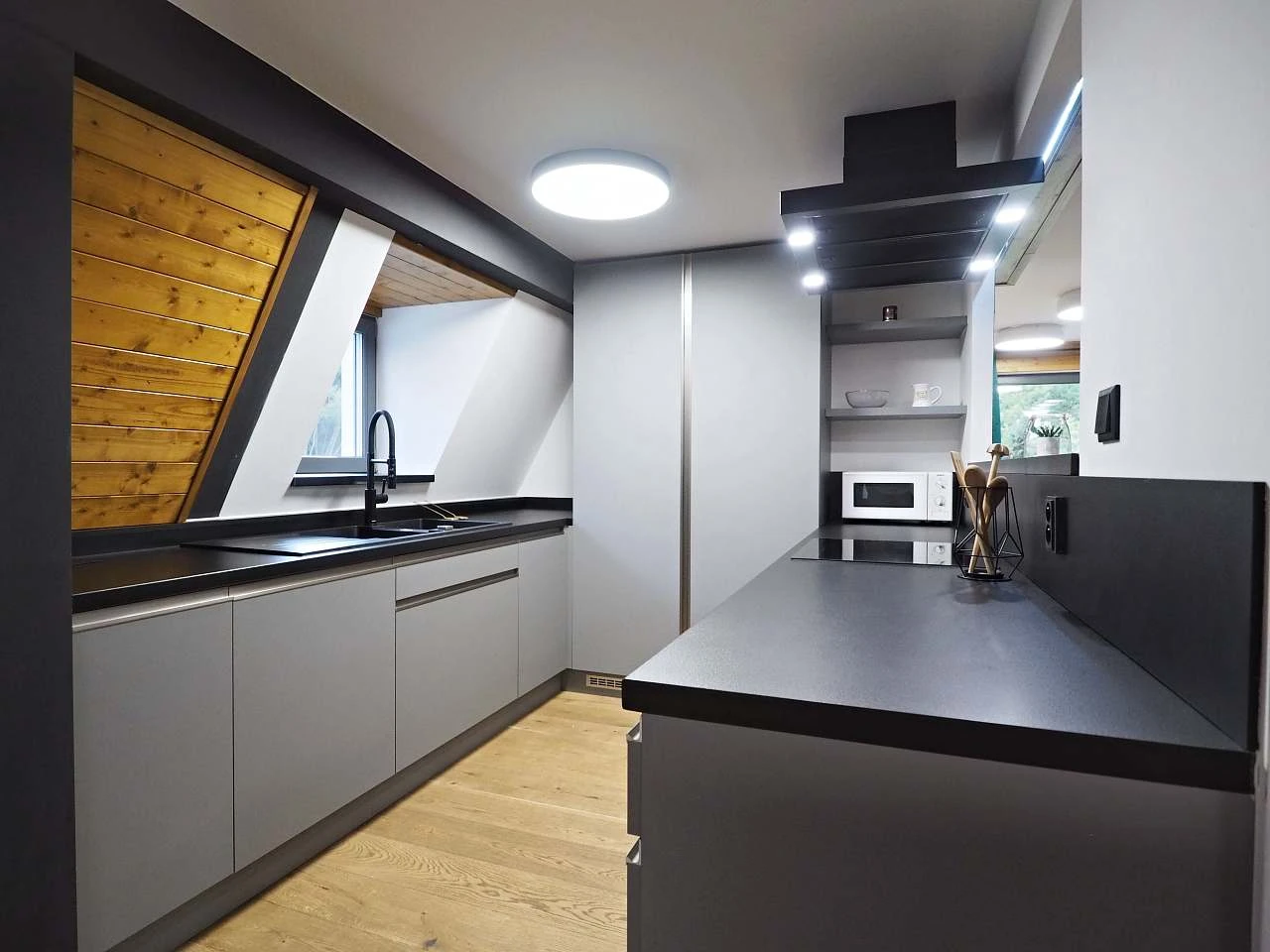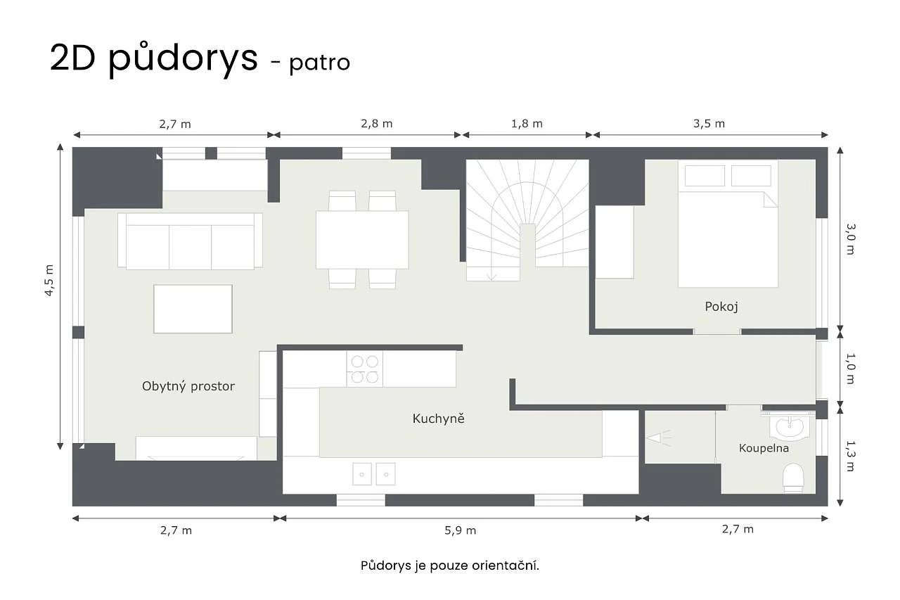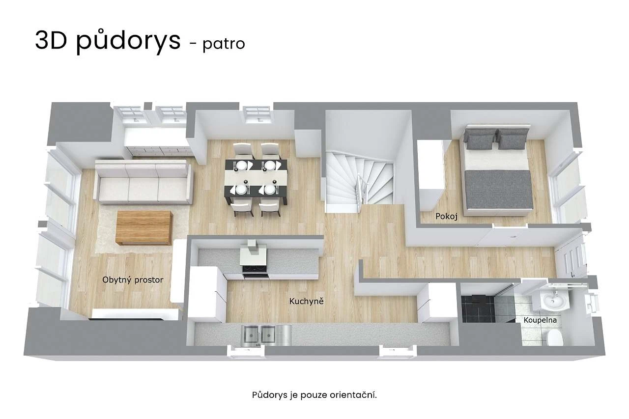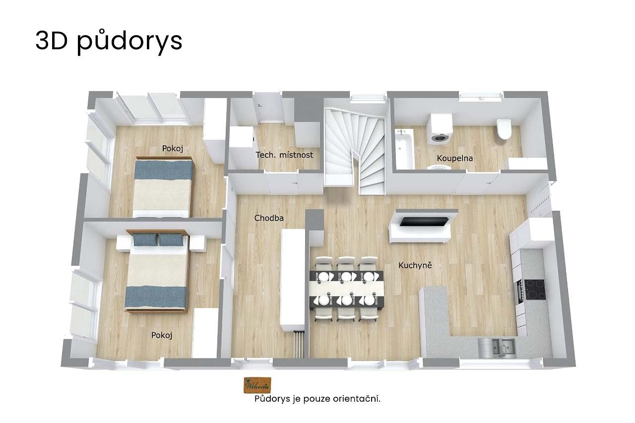 - Prostorný obývací pokoj se spaním pro 2 osoby a propojení s kuchyní v horním patře