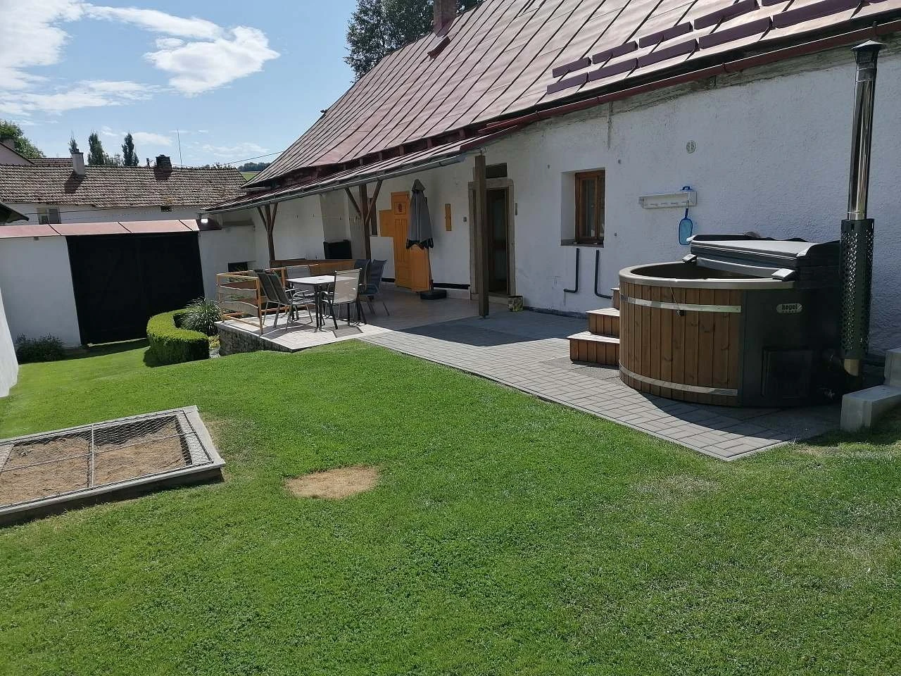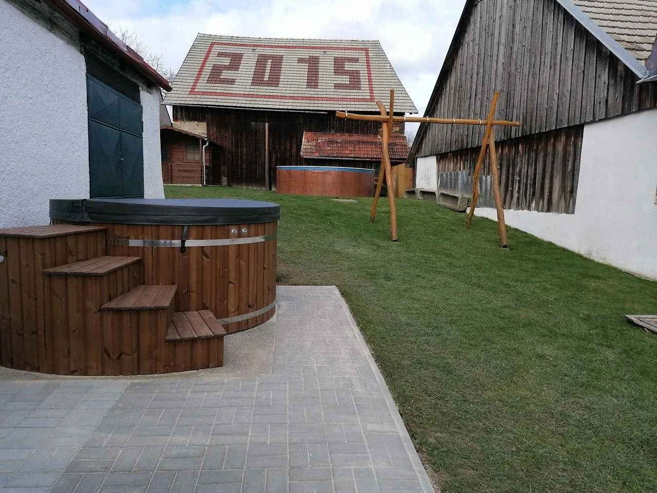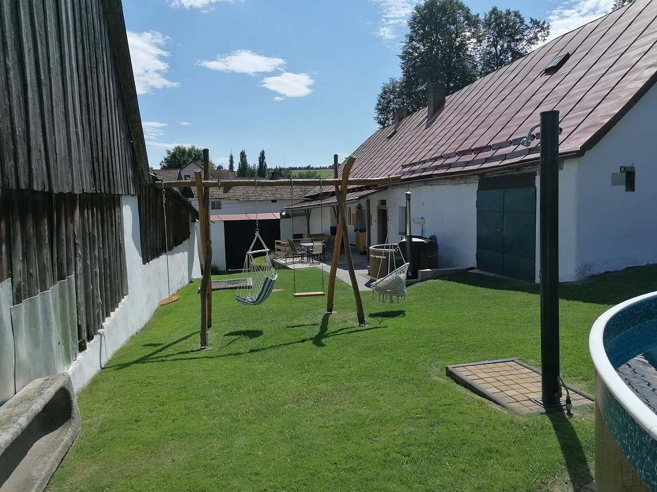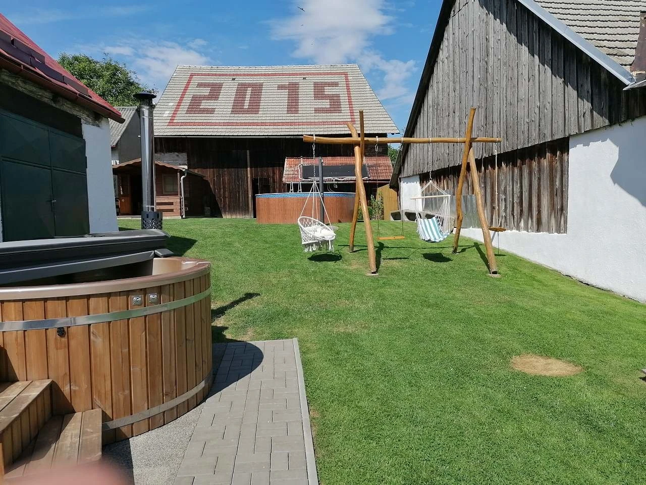Součástí objektu je uzavřený dvůr, udržovaná zahrada, terasa a přilehlá stodola, které poskytují dostatek prostoru pro pobyt venku, hry dětí i sportovní aktivity. K venkovnímu vybavení patří bazén, koupací sud s filtrací a ohřevem na dřevo, venkovní krb a možnost posezení. Dřevo na topení je po dobu pobytu k dispozici. Koupací sud lze využívat opakovaně, přičemž udržení teploty vody nevyžaduje dlouhý opětovný ohřev.