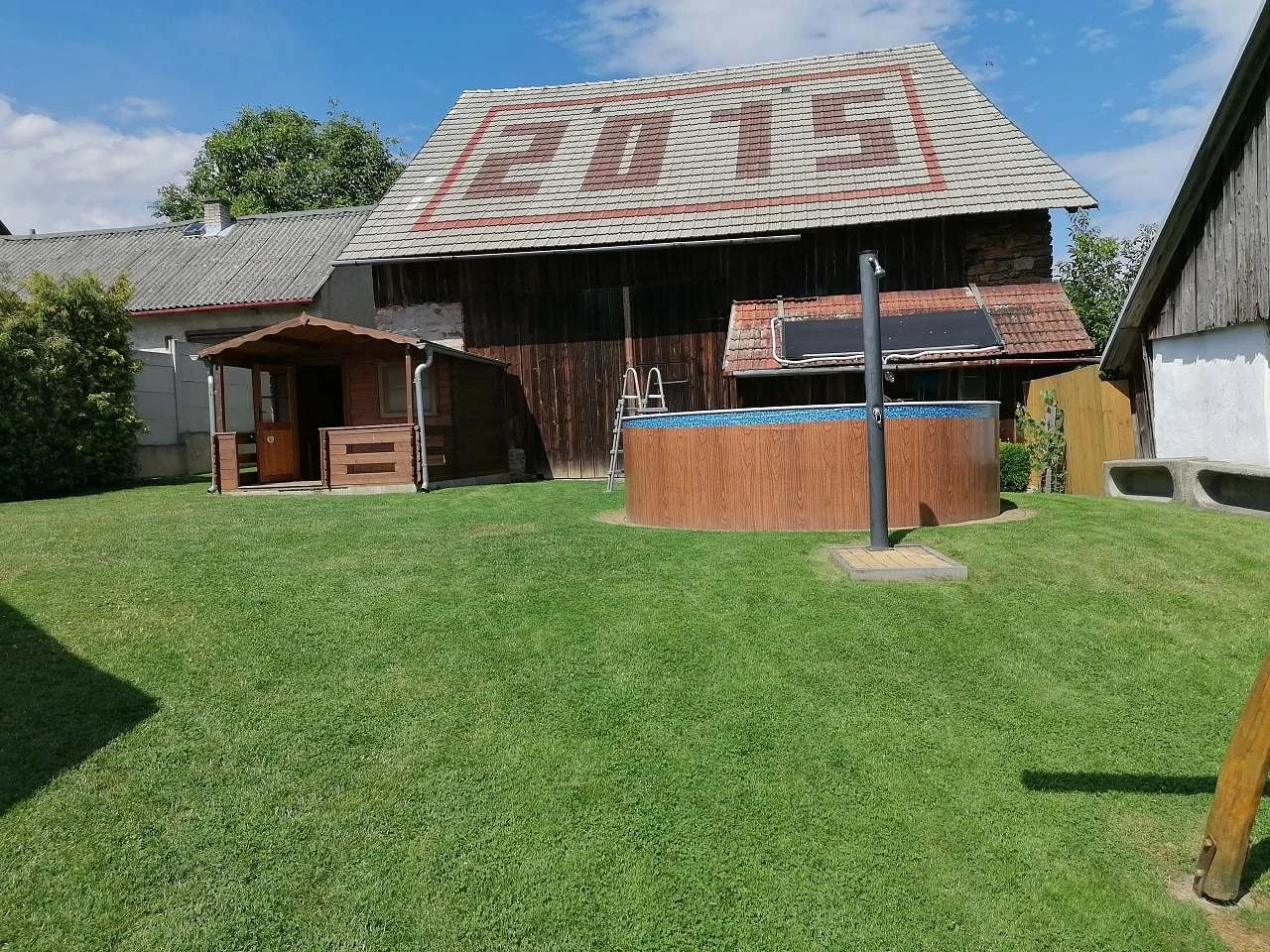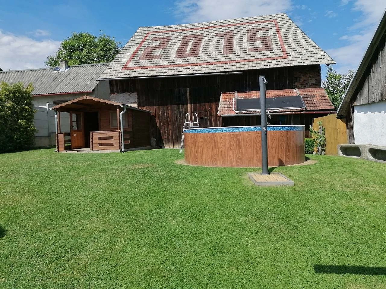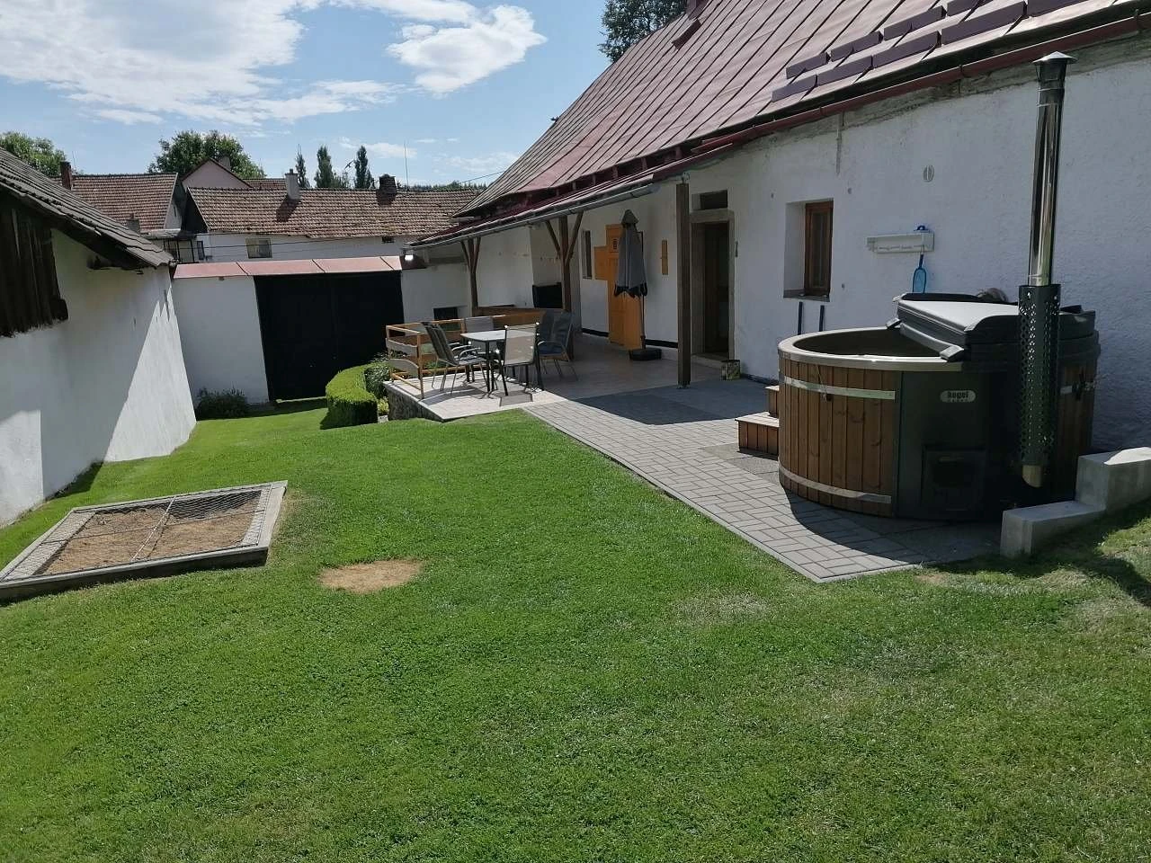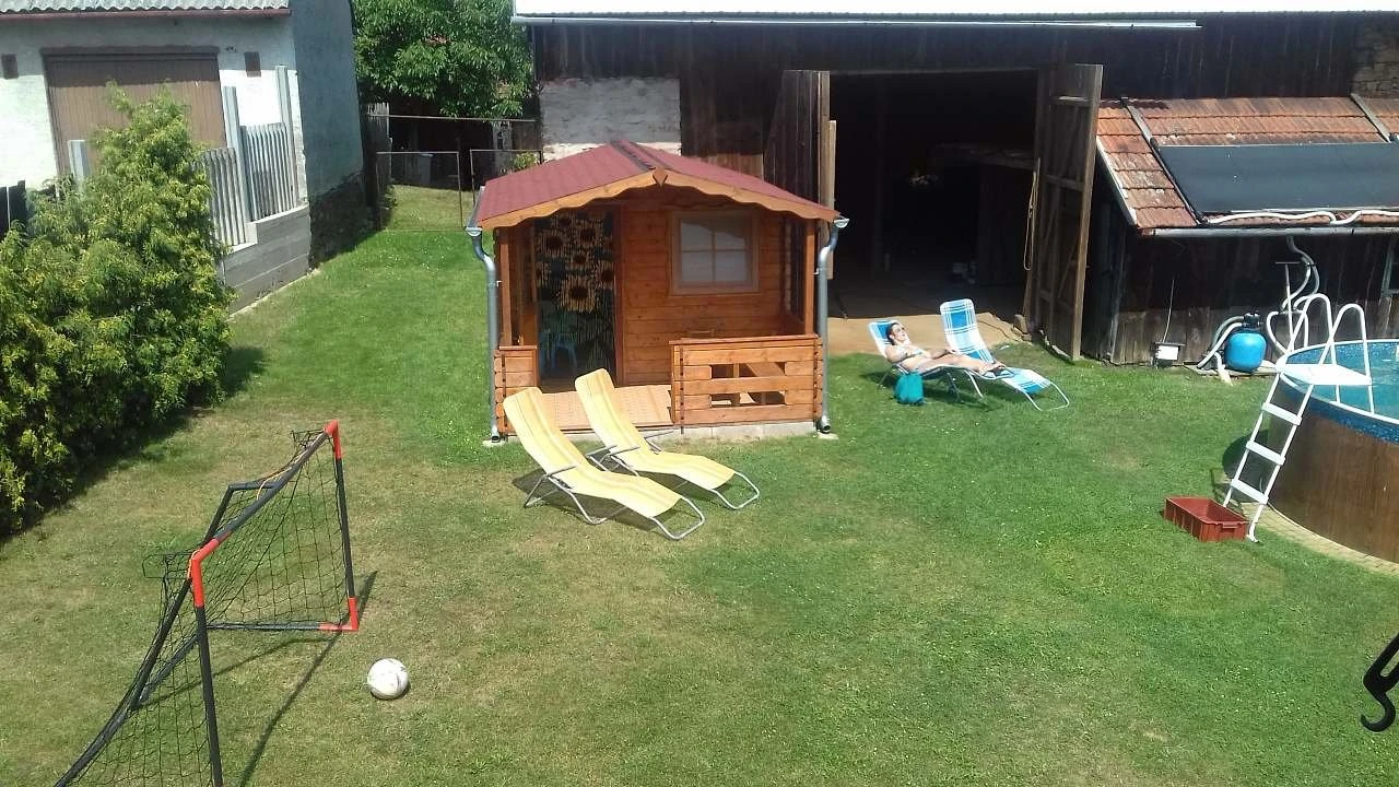 Součástí objektu je uzavřený dvůr, udržovaná zahrada, terasa a přilehlá stodola, které poskytují dostatek prostoru pro pobyt venku, hry dětí i sportovní aktivity. K venkovnímu vybavení patří bazén, koupací sud s filtrací a ohřevem na dřevo, venkovní krb a možnost posezení. Dřevo na topení je po dobu pobytu k dispozici. Koupací sud lze využívat opakovaně, přičemž udržení teploty vody nevyžaduje dlouhý opětovný ohřev.