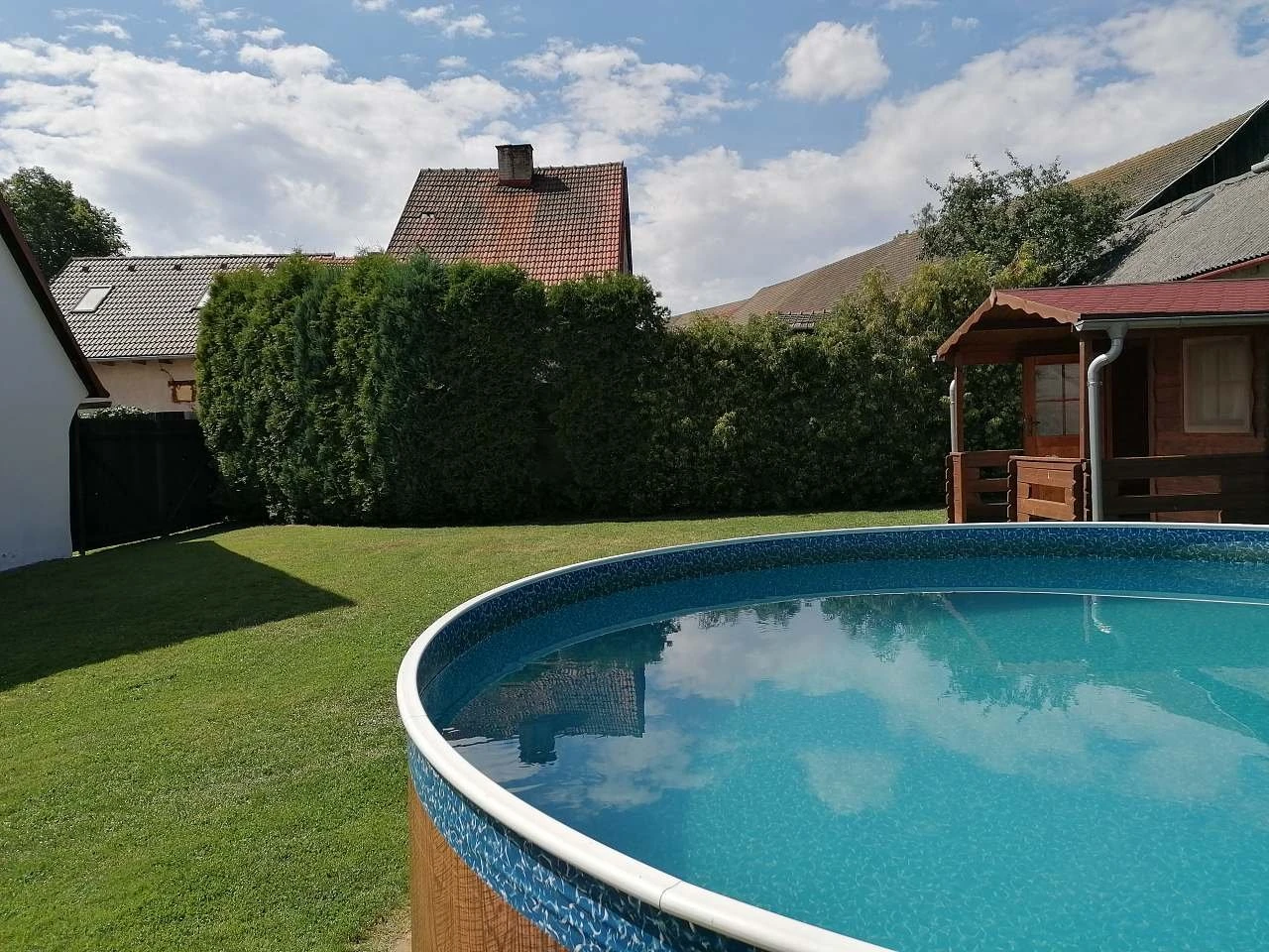Na dvoře se nachází dětská herní chatička s hracím koutkem a dětskou kuchyňkou. Venkovní vybavení dále zahrnuje bazén, koupací sud KEGEL Exclusive s arylátovou vložkou a jacuzzi, solární sprchu, plynový gril, venkovní ohniště s roštem, terasu s posezením a slunečníkem, zahradní nábytek, lehátka, houpačky, pískoviště, basketbalový koš a houpací lavičku.