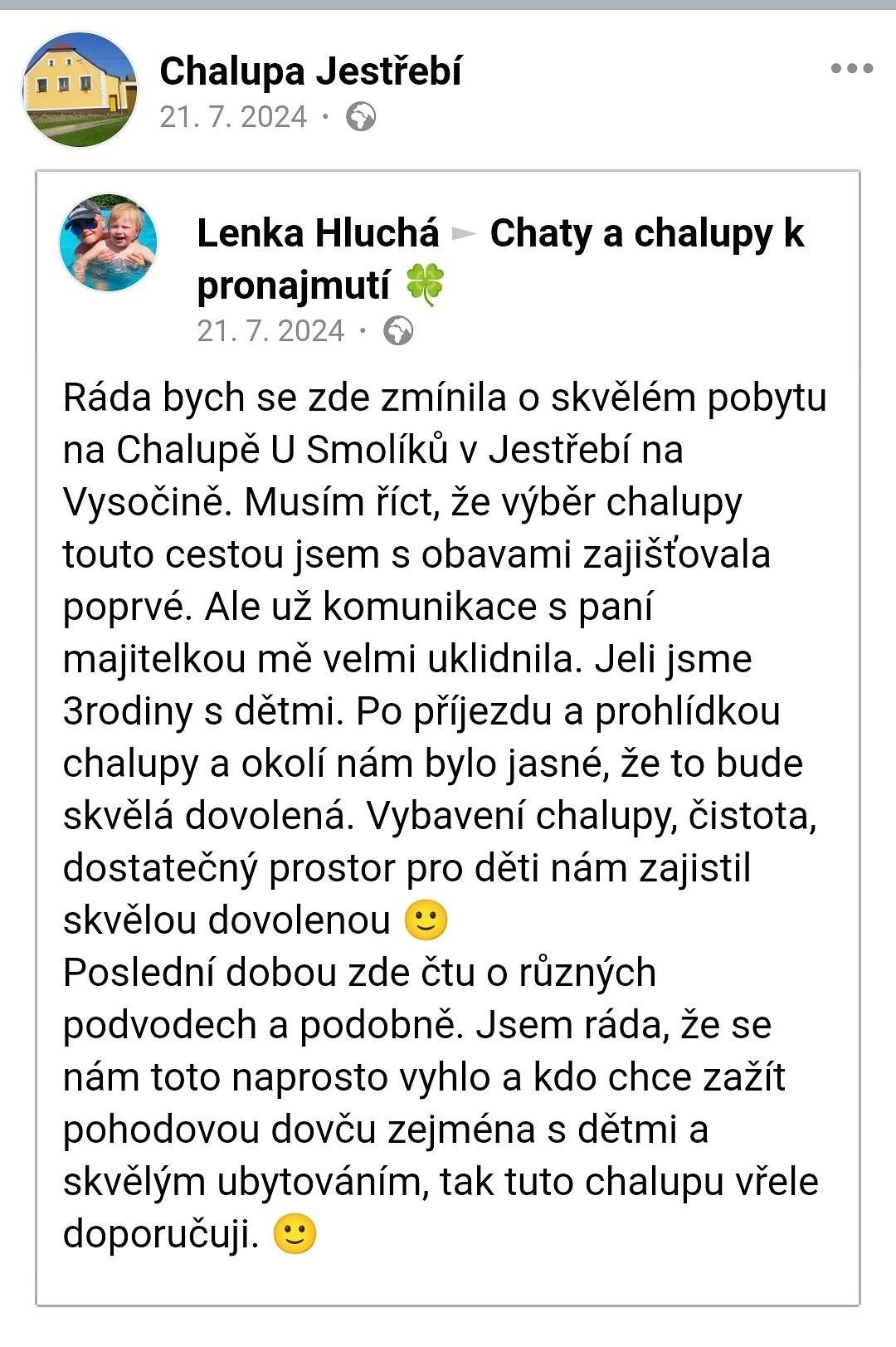 Chalupa u Smolíků se nachází v obci Jestřebí na Vysočině, v klidném prostředí v blízkosti Brtnice a Jihlavy. Objekt je po rekonstrukci a je pronajímán výhradně jako celek, což zajišťuje plné soukromí bez přítomnosti majitele či dalších hostů. Kapacita ubytování je 9 lůžek + 1 přistýlka, k dispozici jsou 3 samostatné ložnice. Chalupa je vhodná pro rodiny s dětmi, skupiny přátel a je umožněn pobyt s domácími mazlíčky. Celý pozemek je oplocen.