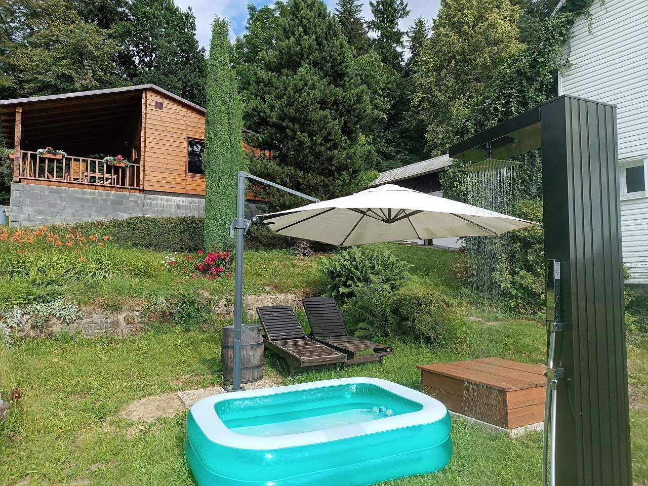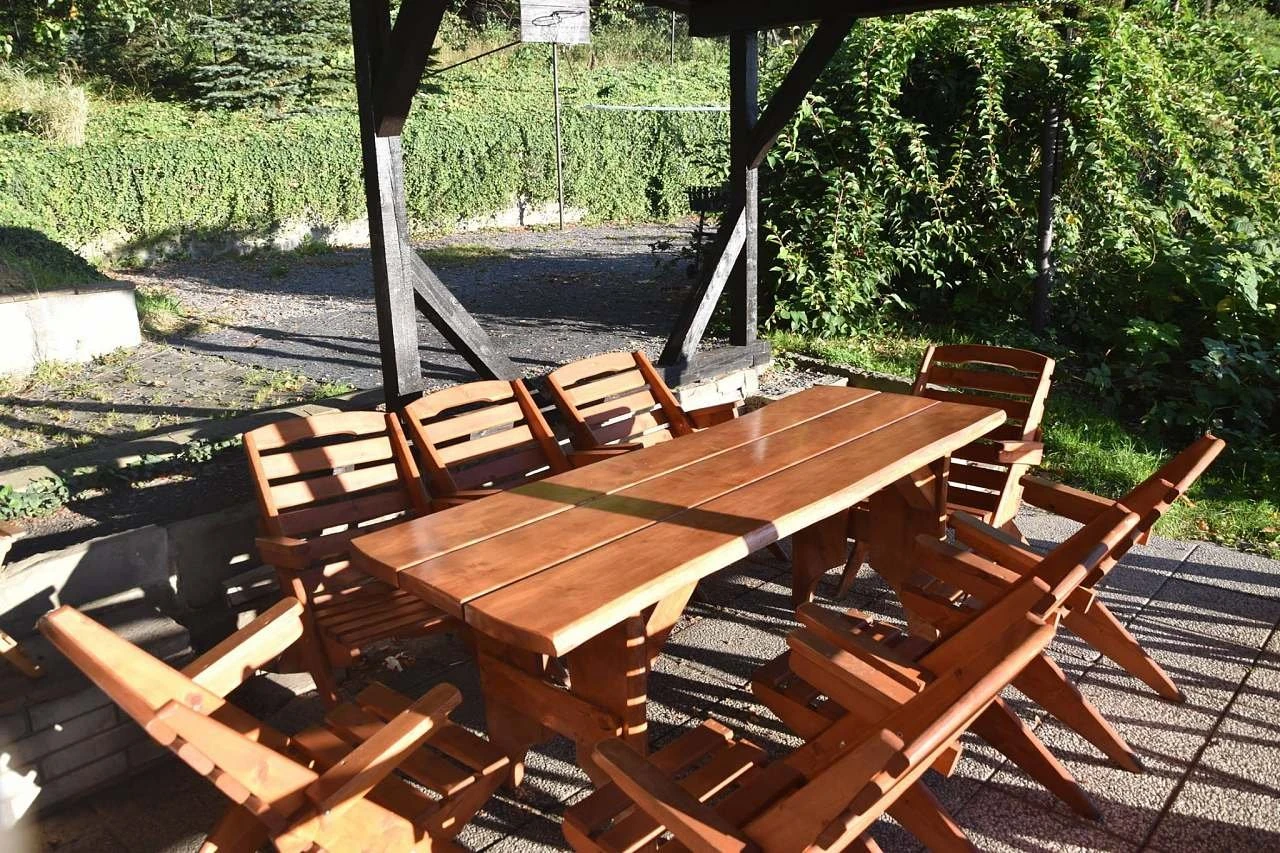 Venkovní část nabízí pergolu s posezením, hřiště na míčové hry, pískoviště, lehátka, houpačku, přenosný gril a táborákové ohniště.