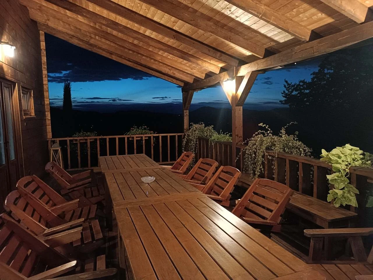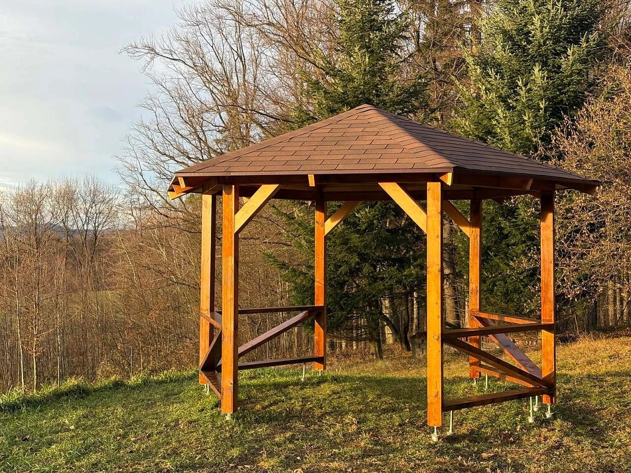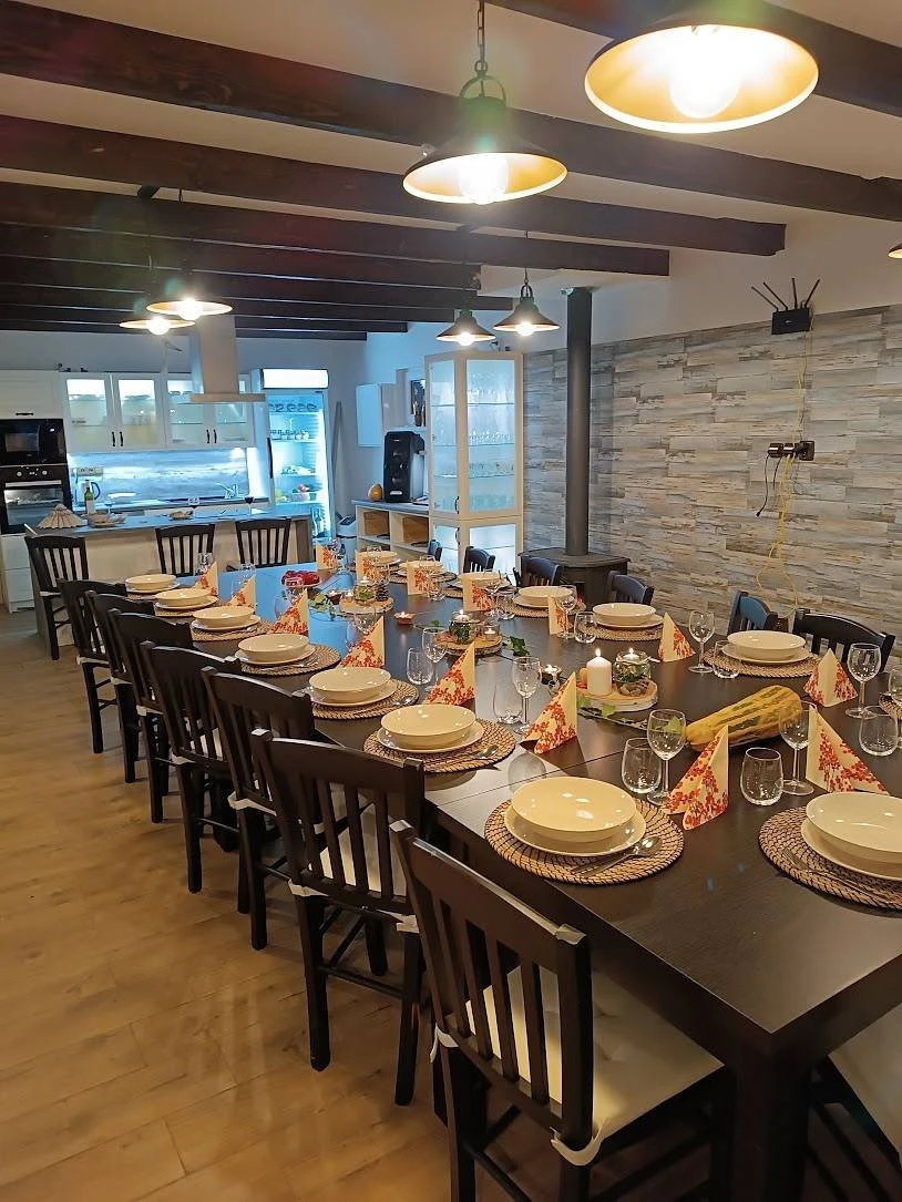 Součástí pronájmu je také samostatná dřevěnka s velkou společenskou místností (5×10 m), vhodná pro stolování až 28 osob. Místnost je vybavena kuchyňskou linkou, indukční deskou, mikrovlnkou, elektrickou troubou, myčkou, chladicí vitrínou a reprozařízením. Vytápění zajišťují krbová kamna, dřevo a úklid jsou zahrnuty v ceně.