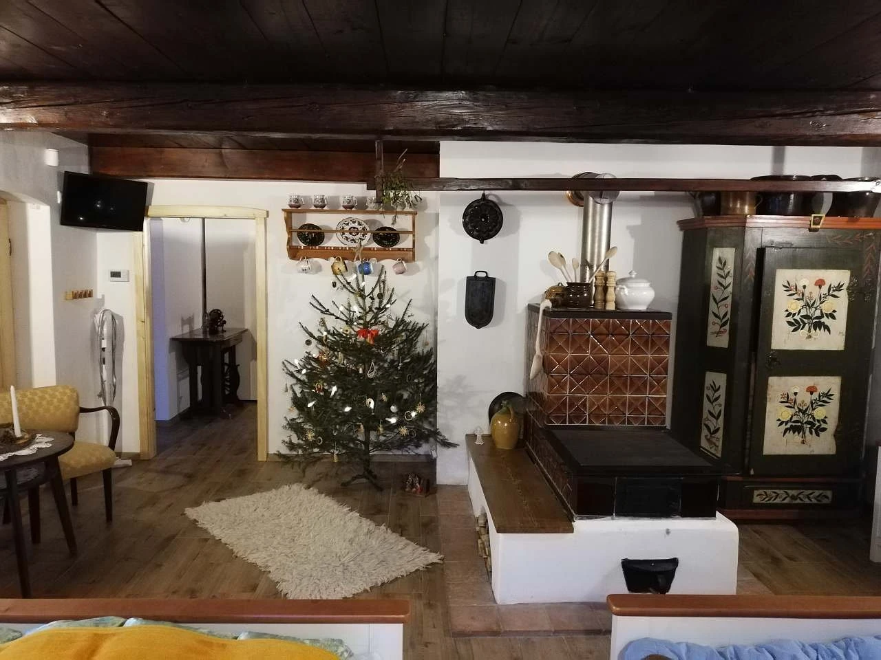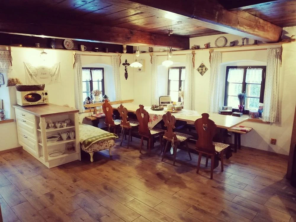 Vedlejší pokoj nabízí ubytování pro 4 osoby a je vybaven kachlovými kamny, malovaným nábytkem a televizorem. Každý pokoj má připojení na WiFi. Celé přízemí je bezbariérové včetně koupelny s infra saunou, sprchovým koutem, WC a dvěma umyvadly.