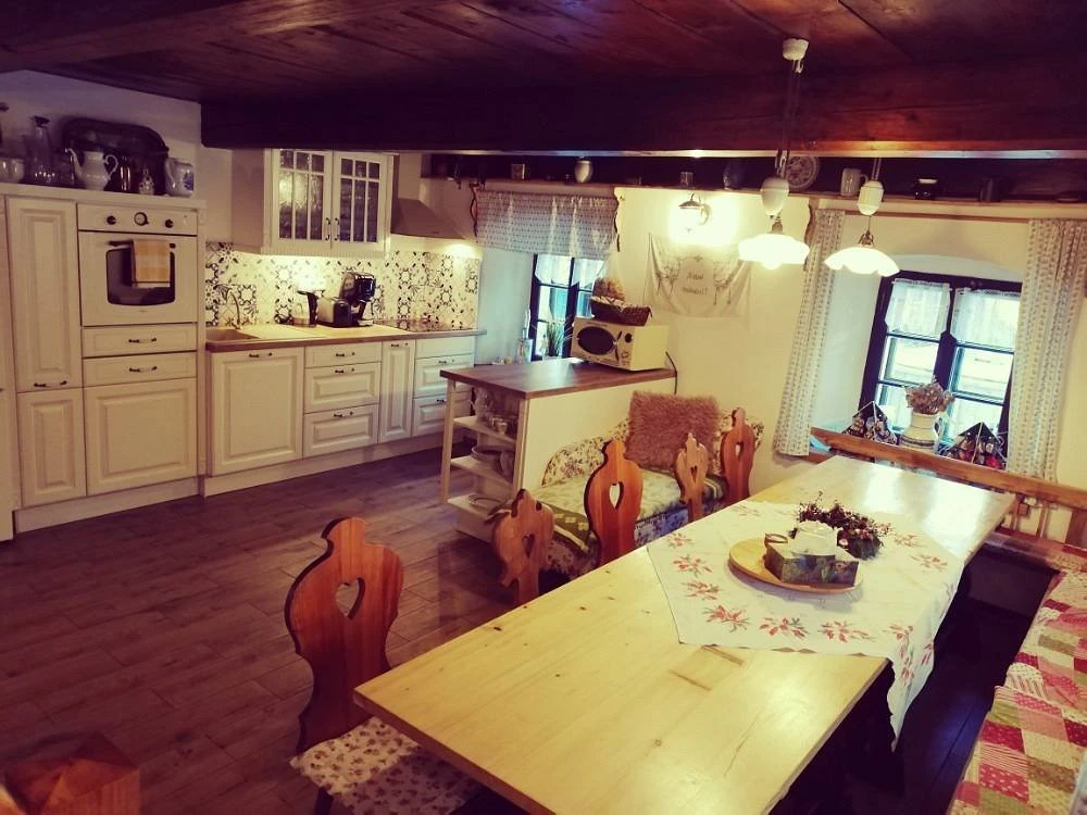 V zádveří chalupy je velký botník s věšáky. Dále se vstupuje do společenské místnosti s kuchyní a jídelním stolem pro 12 osob. Kuchyň je vybavená myčkou, elektrickým sporákem a základními kuchyňskými potřebami (olej, sůl, cukr, koření, kapsle do kávovaru). V místnosti je krb a televizor.
