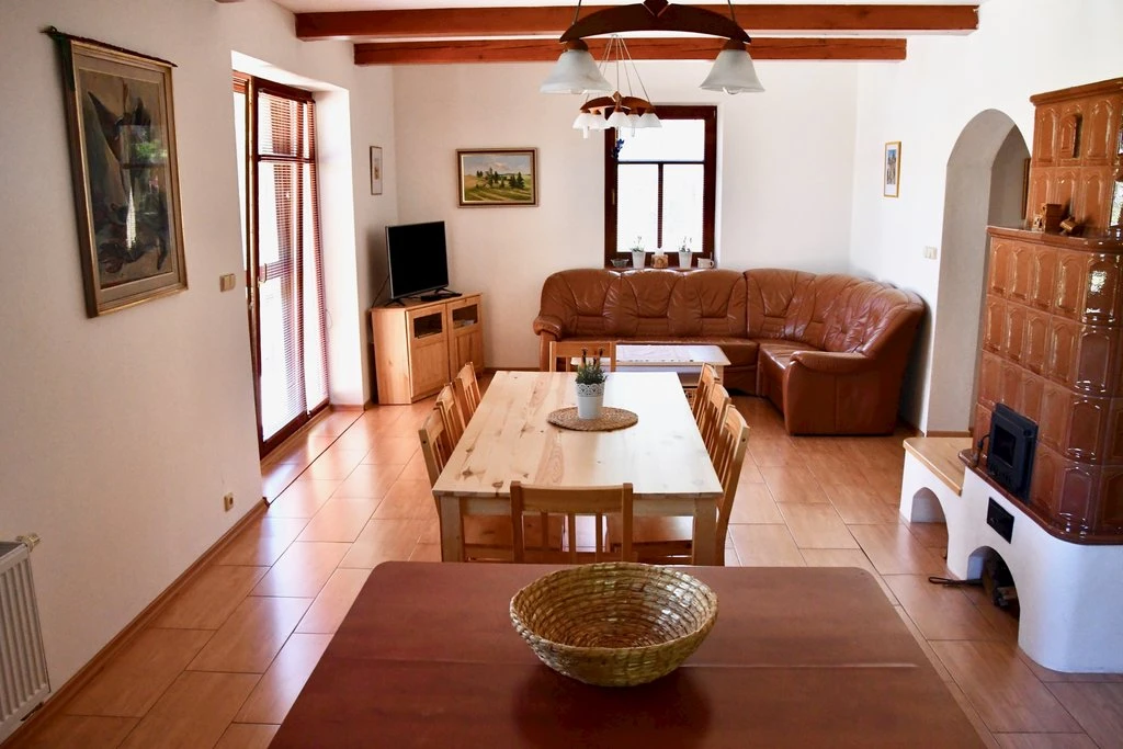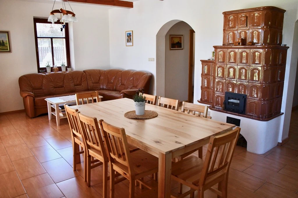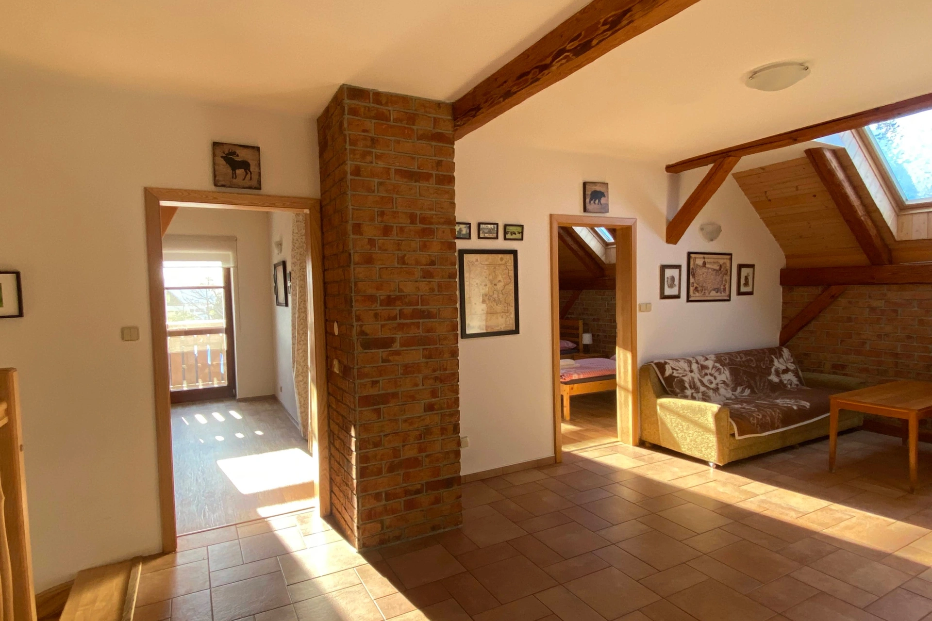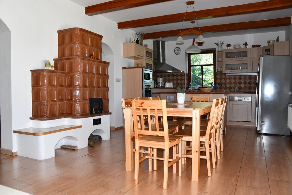 Uvnitř chalupy se nachází obývací prostor s krbem, plně vybavená kuchyň a společenská místnost, která slouží pro společné chvíle i zábavu. Příjemné a funkční zázemí vytváří podmínky pro pohodlný pobyt po celý rok.