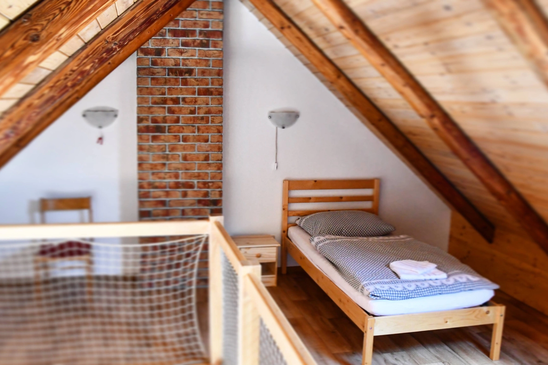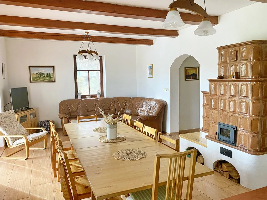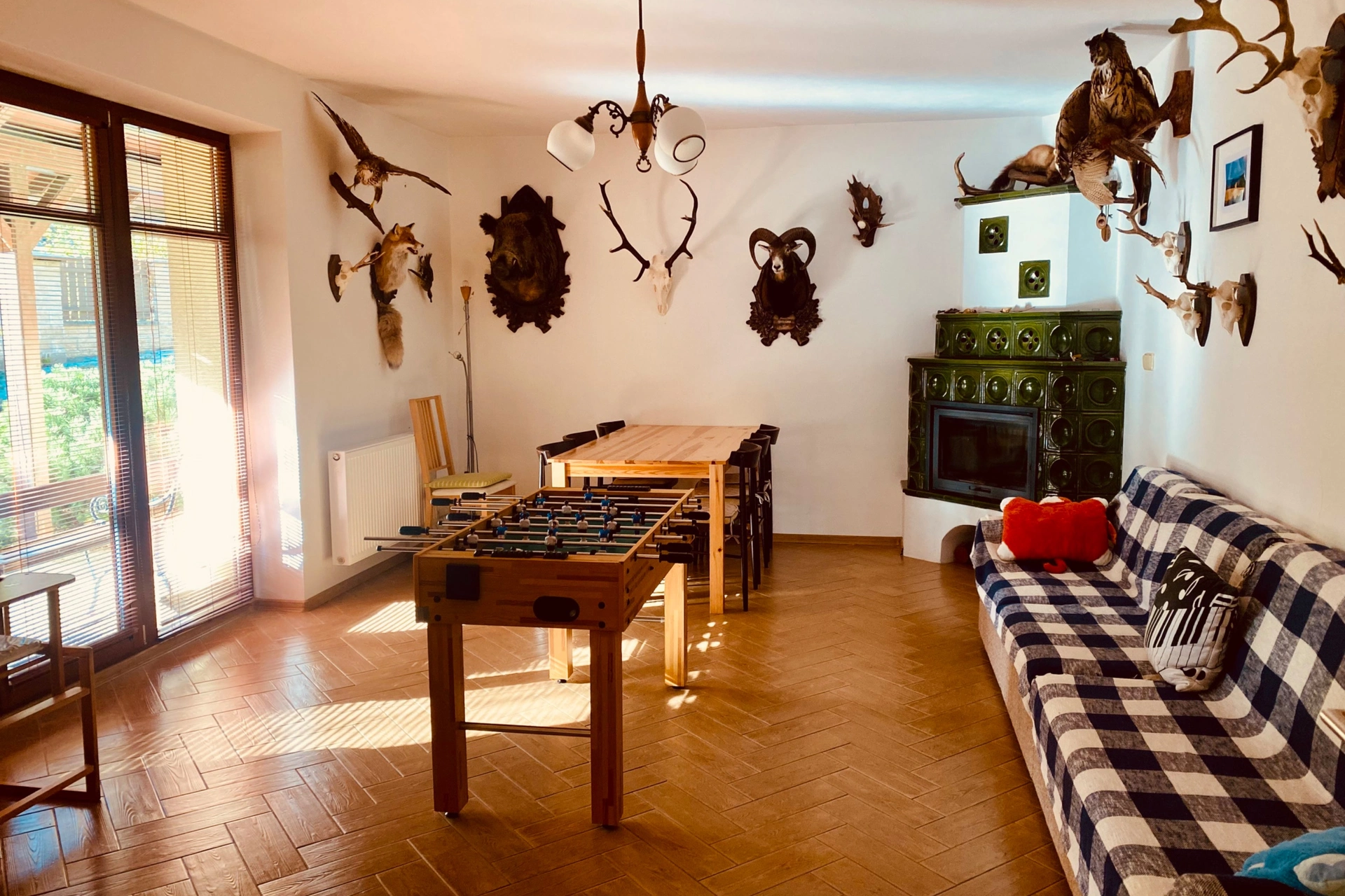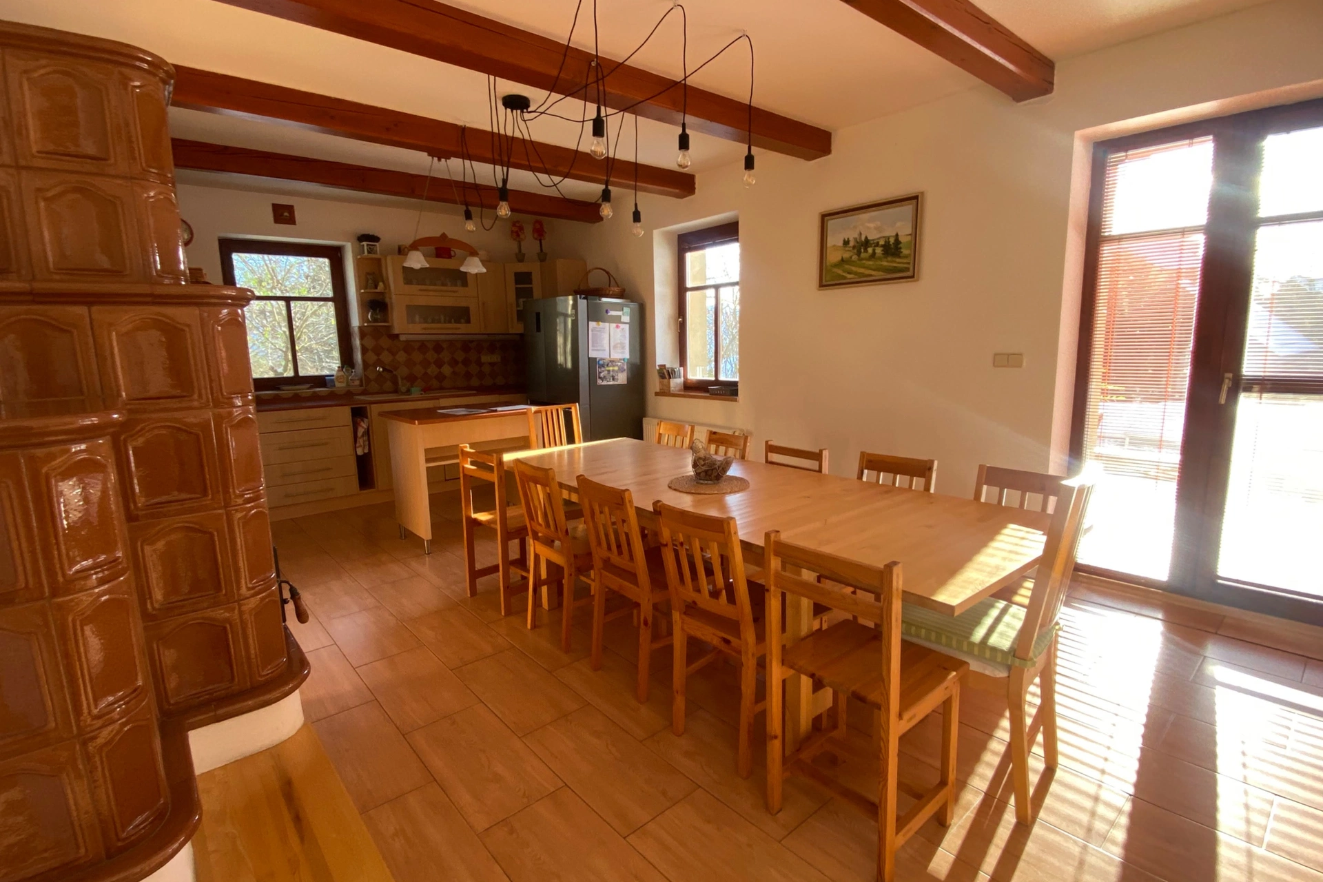 Uvnitř chalupy se nachází obývací prostor s krbem, plně vybavená kuchyň a společenská místnost, která slouží pro společné chvíle i zábavu. Příjemné a funkční zázemí vytváří podmínky pro pohodlný pobyt po celý rok.