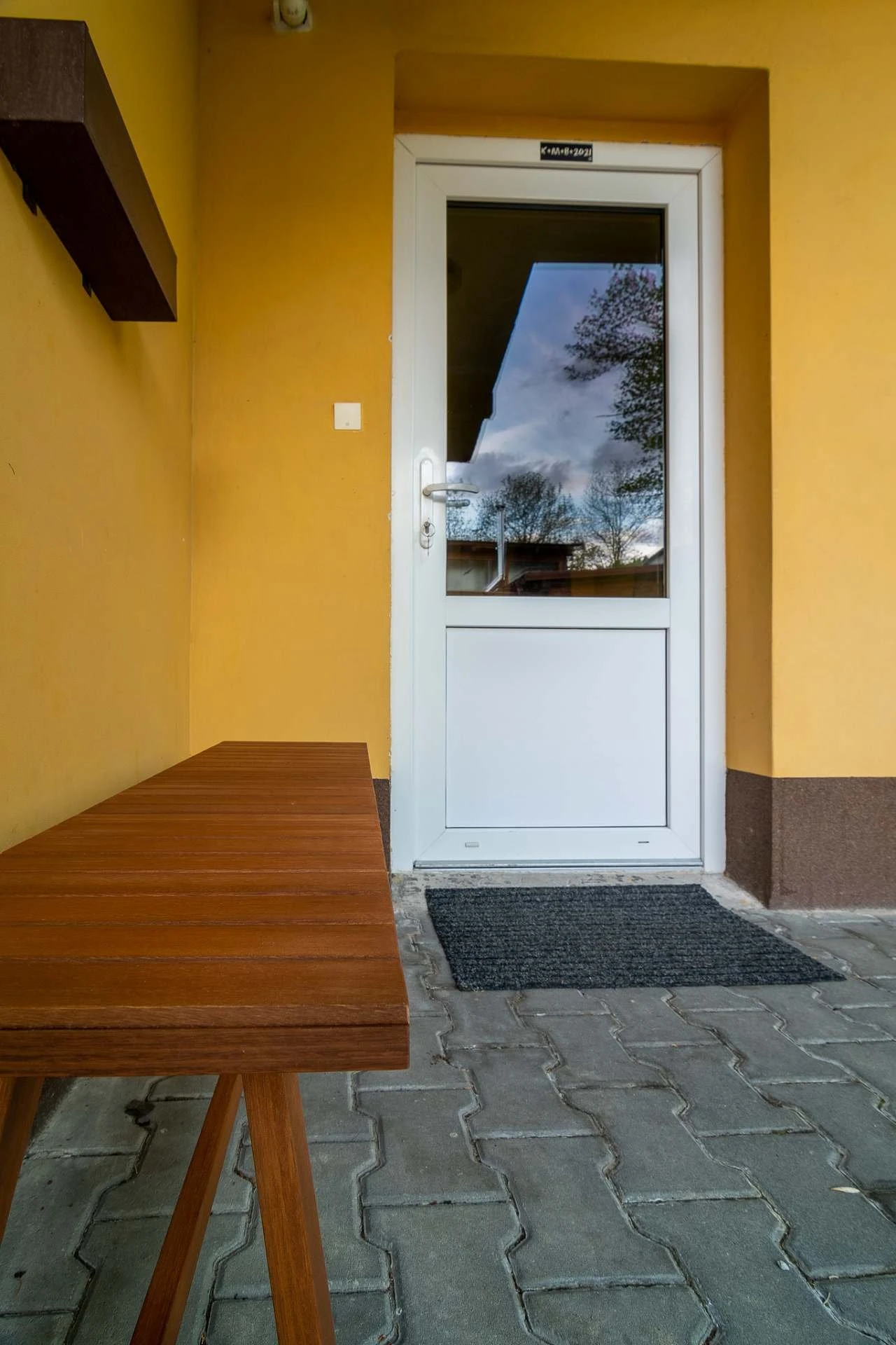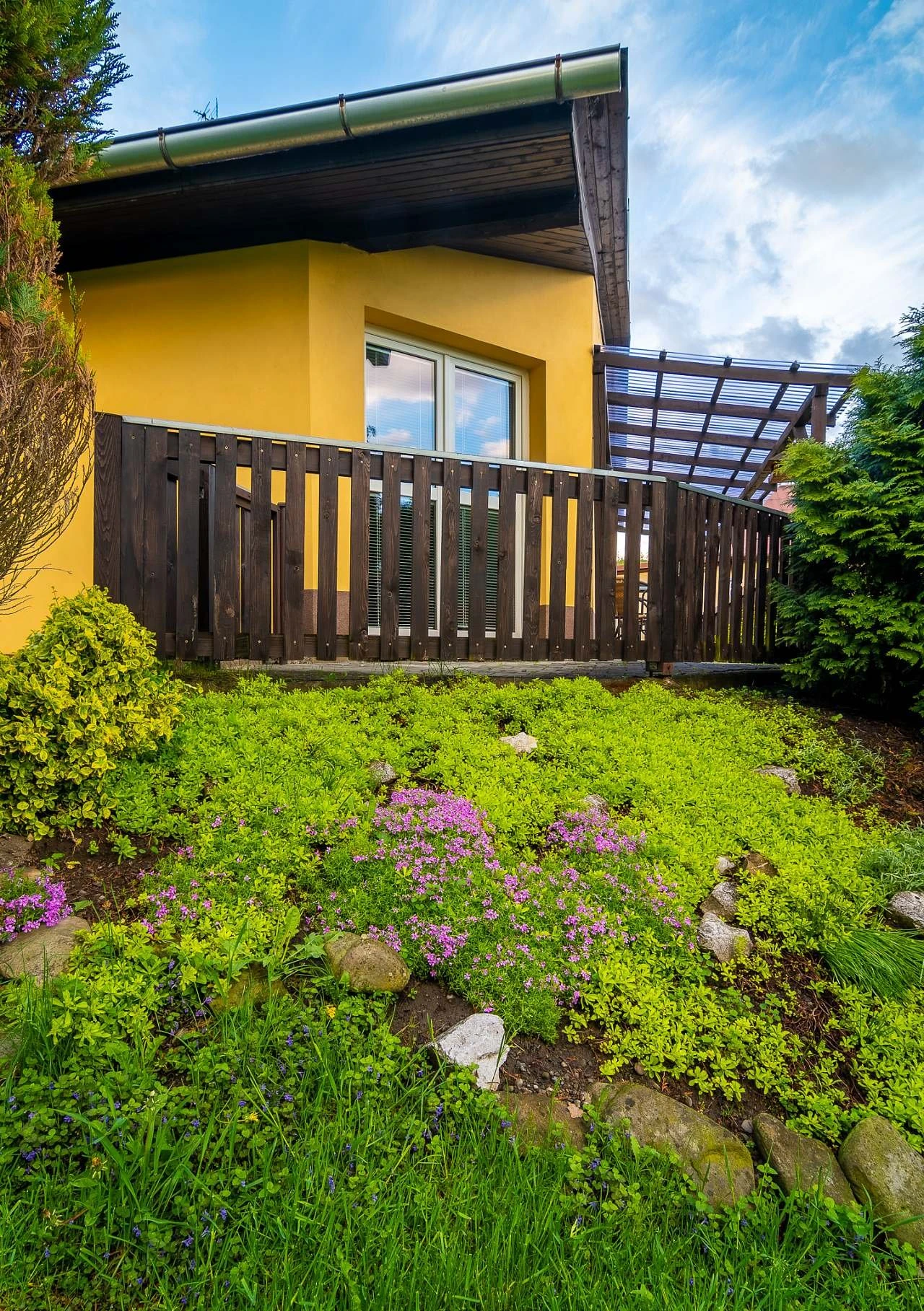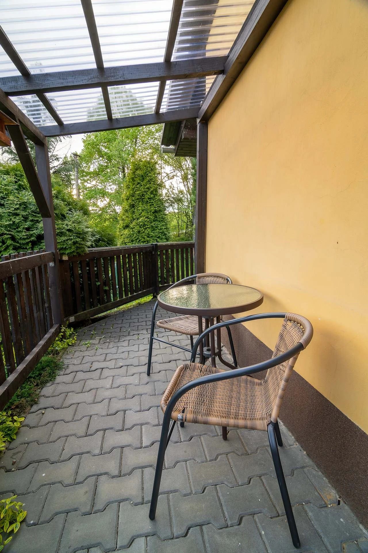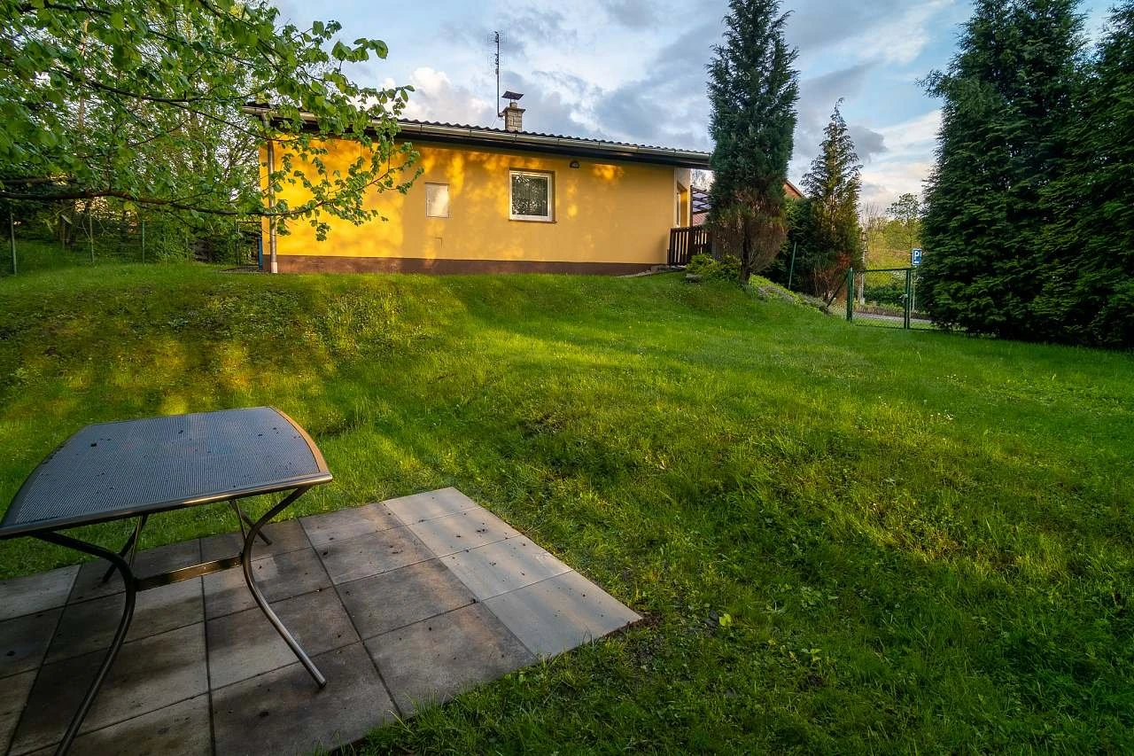 Součástí je oplocená zahrada, která umožňuje využití venkovního prostoru bez přístupu zvenčí. K dispozici je také venkovní posezení a krytá terasa u přední části domu.