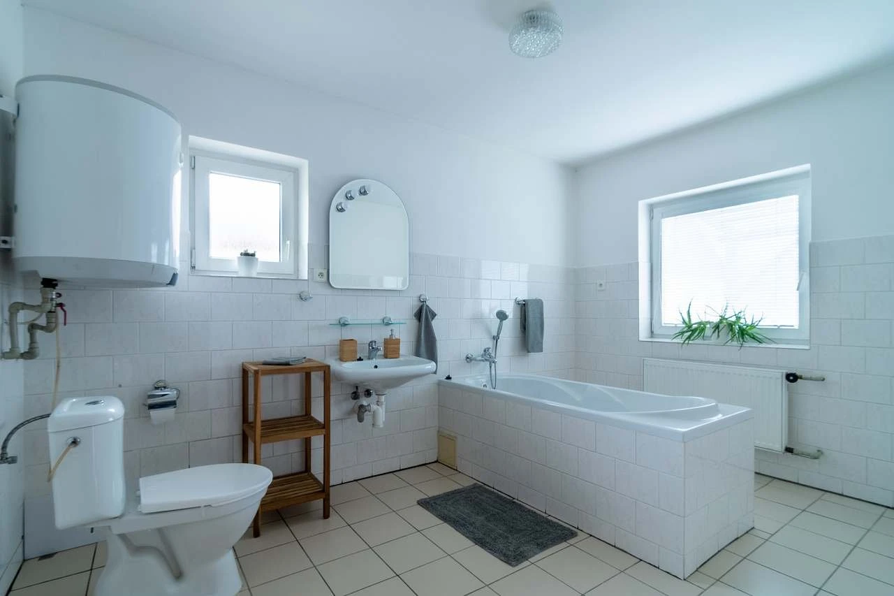Koupelna je prostorná, vybavená vanou a WC. Ohřev vody zajišťuje elektrický bojler o objemu 80 litrů.