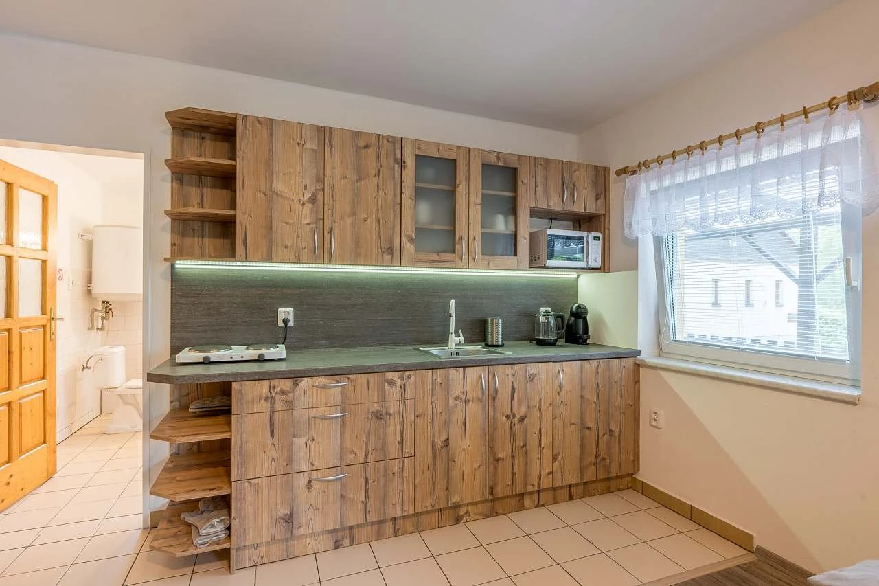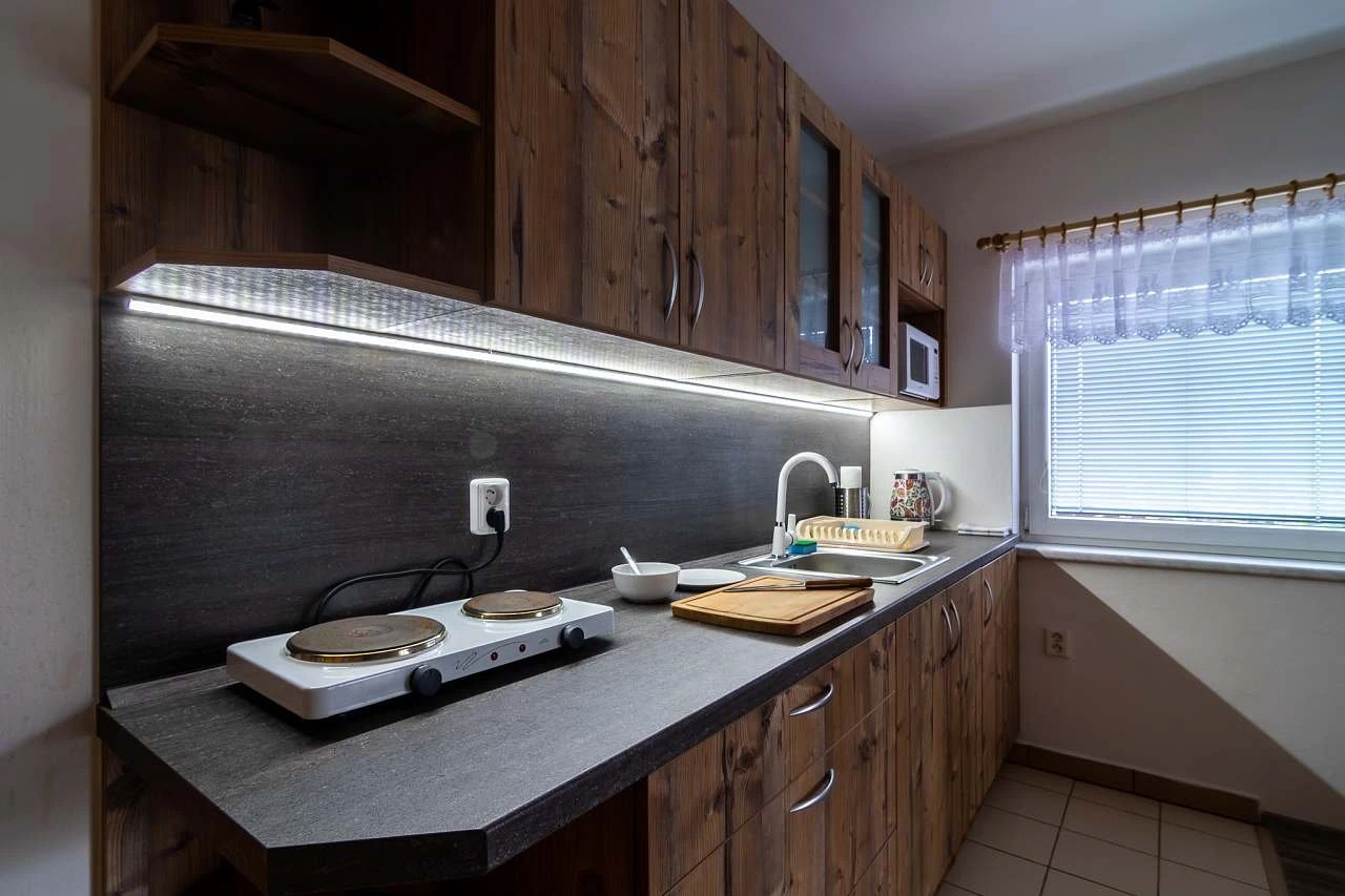 Kuchyňský kout je vybaven pro vaření, obsahuje elektrický dvouplotýnkový vařič, mikrovlnnou troubu, základní vybavení pro vaření a vestavěnou lednici.