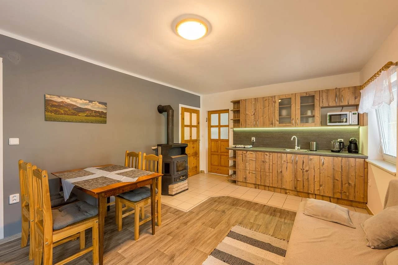 Chalupa má jednu hlavní obytnou místnost, kde je umístěna nová kuchyňská linka s vybavením. Součástí prostoru je také obývací část s rozkládací sedačkou pro 2 osoby, jídelním stolem, židlemi a televizí. Z této místnosti je otevřený vstup bez dveří do ložnice.