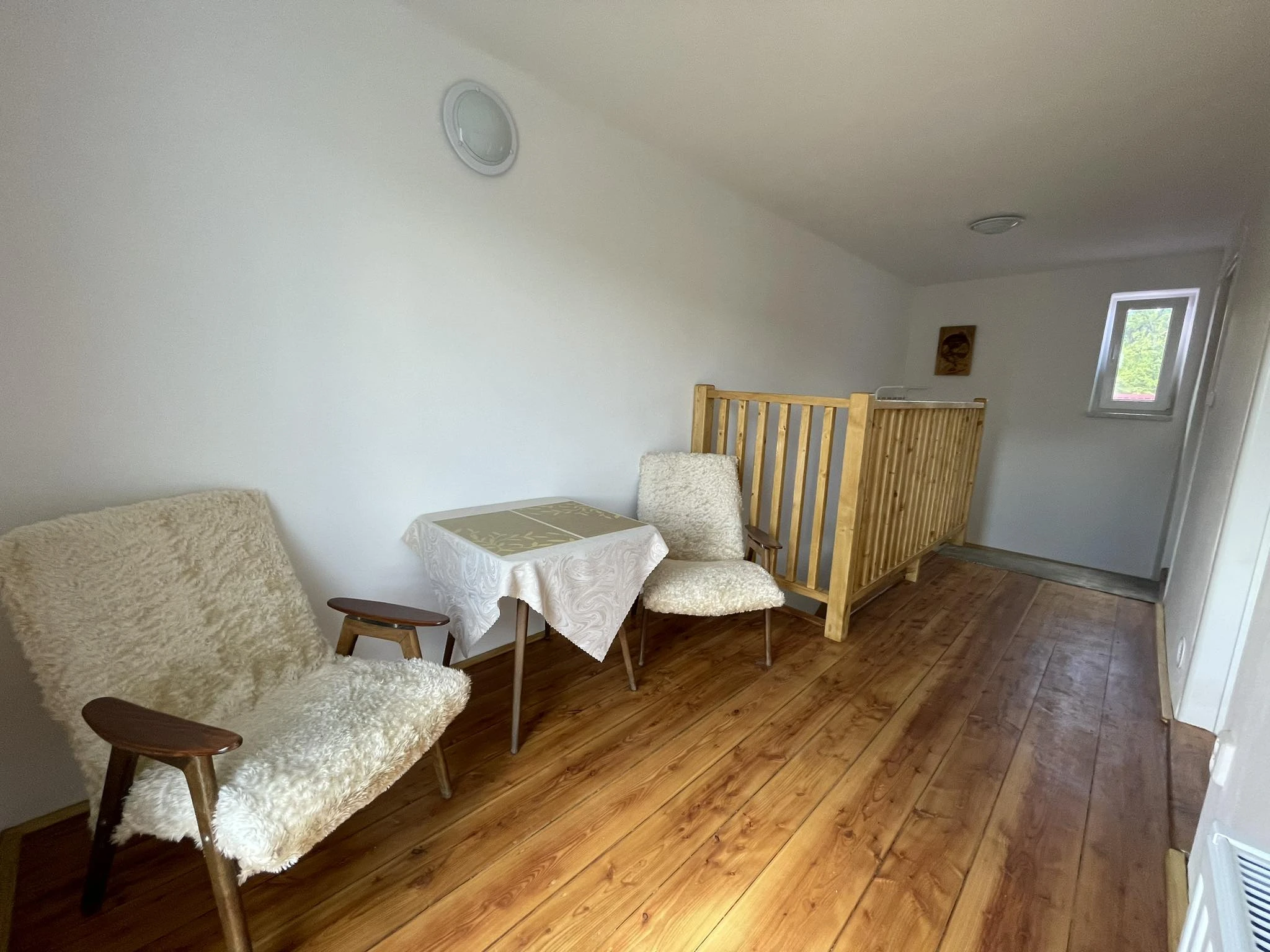 Na dvorku chalupy jsou tři terasy s posezením a ohništěm. Díky tomu si můžete opékat venku během teplých večerů. Pro dobrodružněji založené hosty je možnost stanování na oplocené zahradě nebo spaní pod širým nebem. Balkón v patře nabízí výhled na okolní krajinu. Chalupa nemá Wi-Fi, což umožňuje klidný pobyt bez digitálních rušivých prvků.