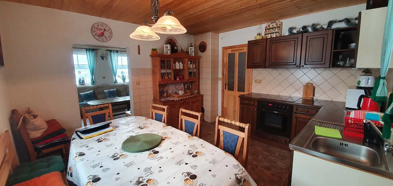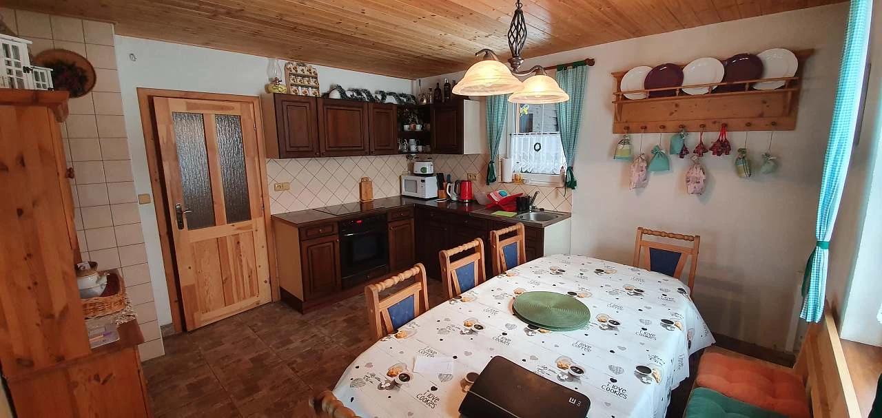 Sociální zařízení zahrnuje v přízemí dvě sprchy, dvě WC a dvě umyvadla, zatímco v patře je jedno WC a jedno umyvadlo. K dispozici je vybavená kuchyň s nově zabudovanou myčkou nádobí. Vně objektu je terasa s posezením a grilovací domek. Parkování je možné přímo u chalupy pro pět aut, další velké parkoviště se nachází přibližně 300 metrů od objektu.