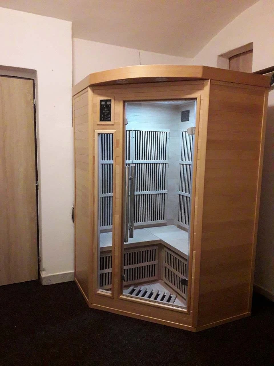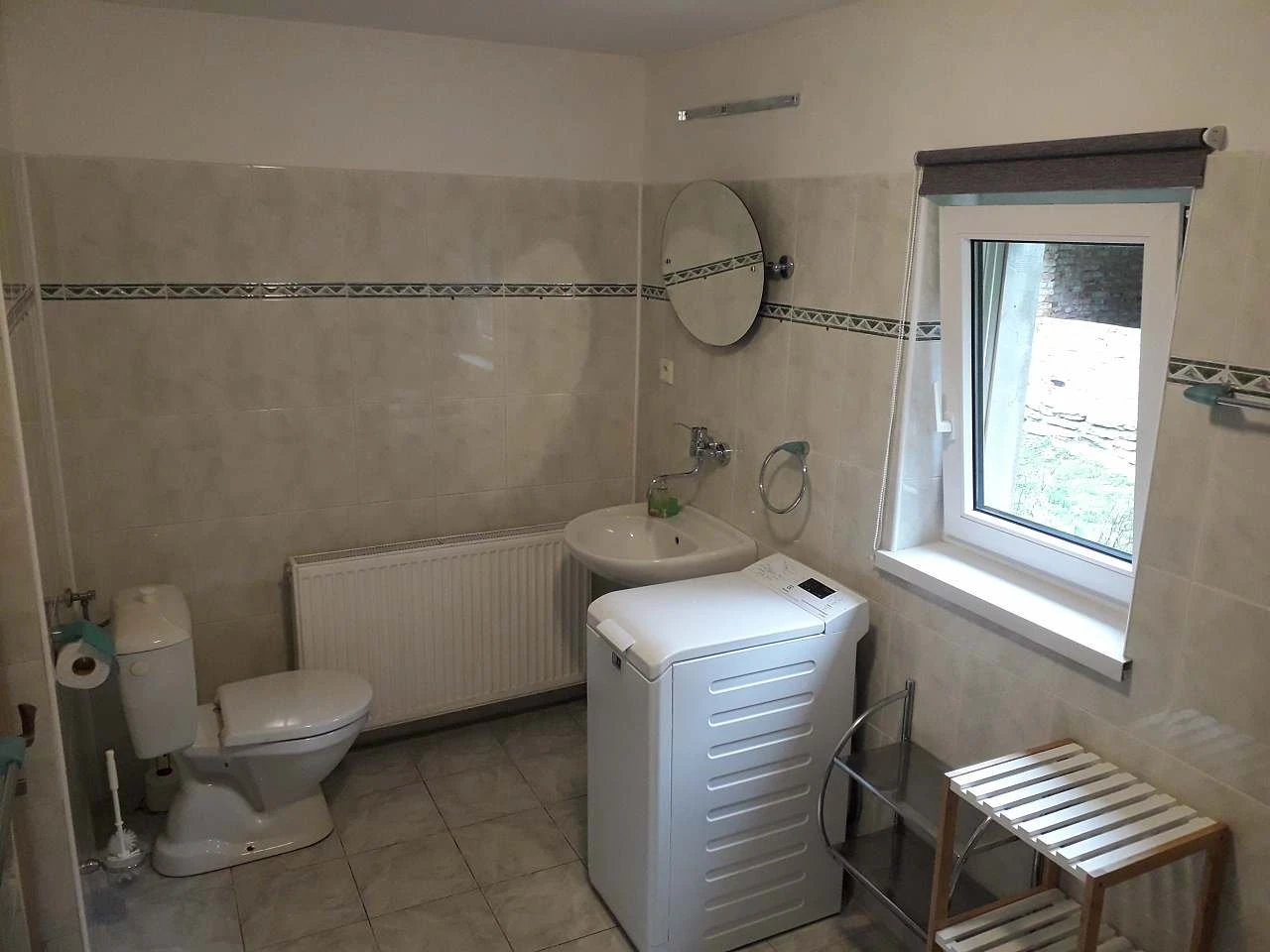 - Koupelna 2: toaleta, umyvadlo, vana, pračka, sušák na prádlo, sauna