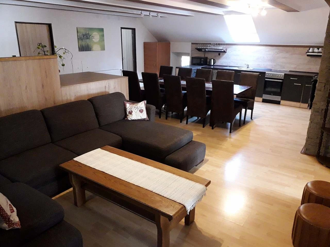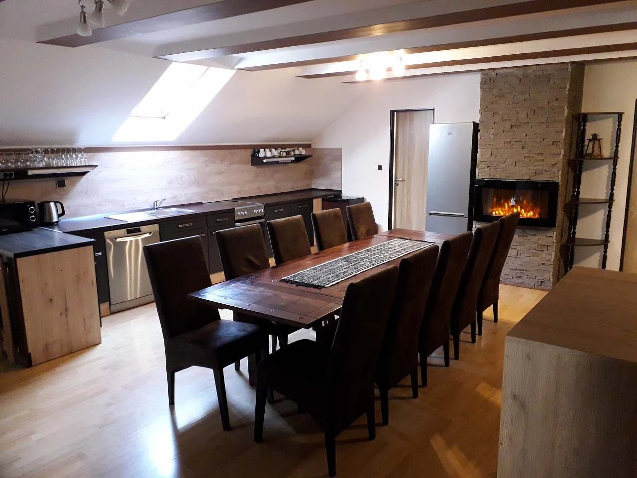 Stravování je vlastní, ve vybavené kuchyni s keramickou varnou deskou, elektrickou troubou, kombinovanou lednicí, mikrovlnnou troubou, topinkovačem, rychlovarnou konvicí a myčkou nádobí. Kuchyň a jídelní část jsou propojeny s obývacím prostorem, který obsahuje pohodlný gauč, konferenční stolek, televizi a elektrický krb.
