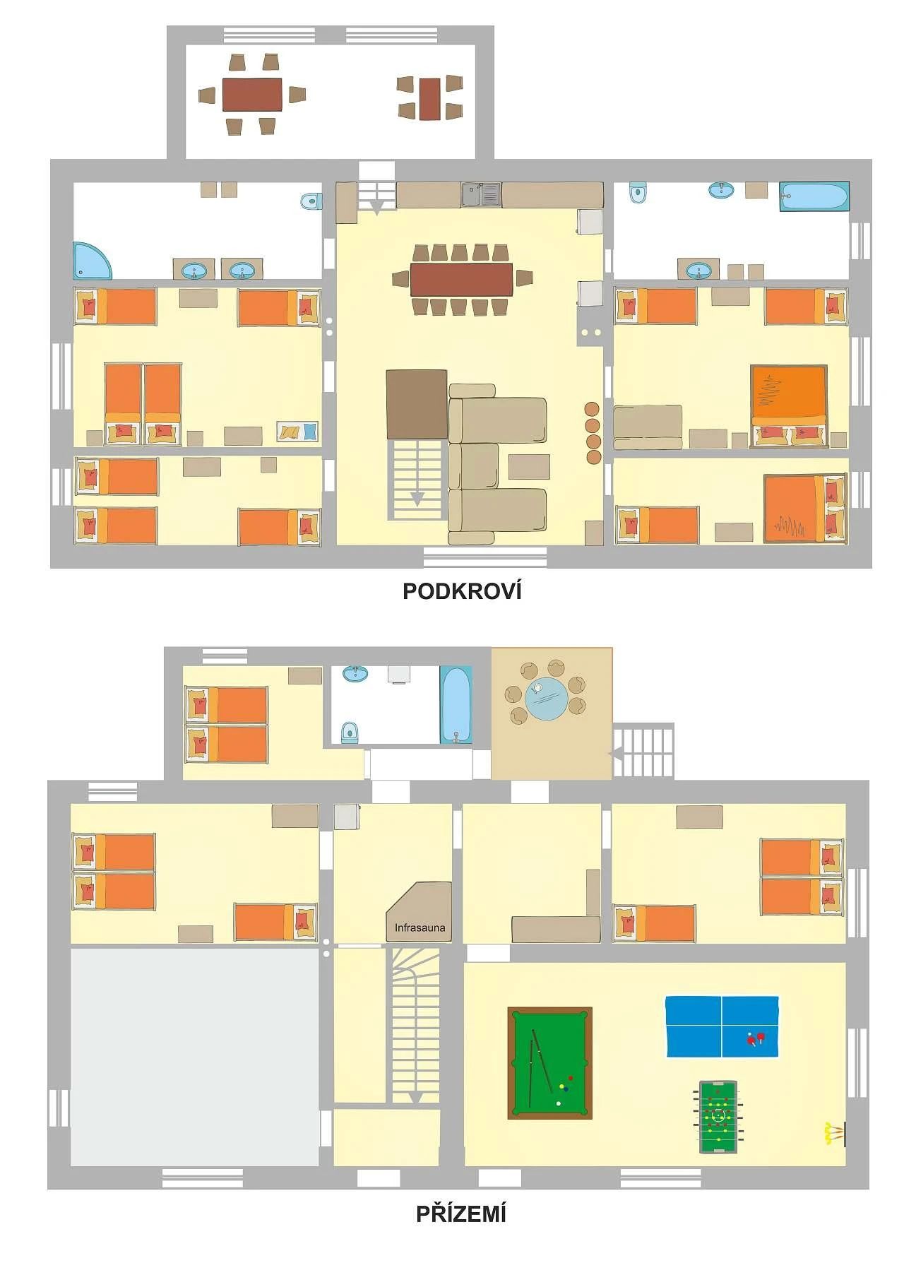 Chalupa poskytuje komfortní ubytování pro skupiny, rodiny i přátele, s důrazem na funkční vybavení a dostatek společných i soukromých prostor.