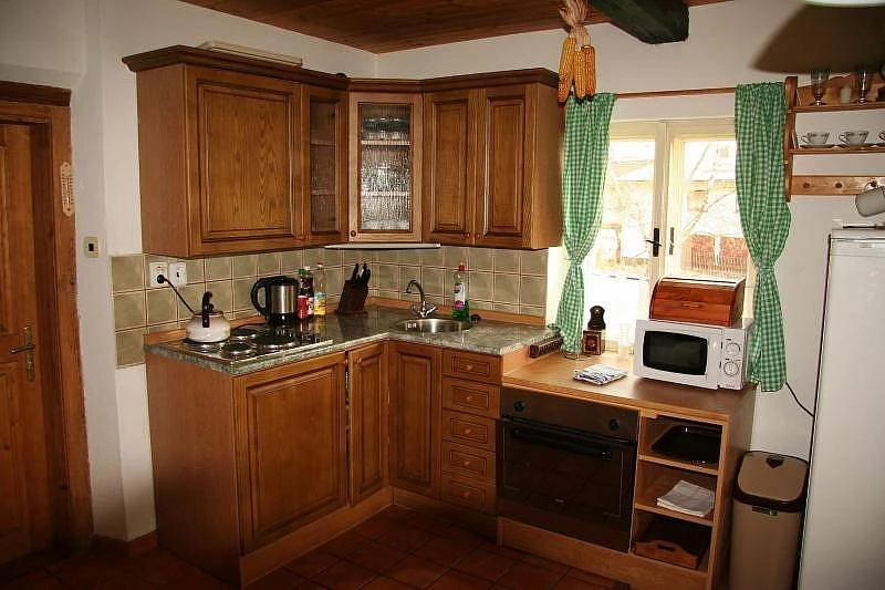 Kuchyňský kout: rychlovarná konvice, sporák, mikrovlnná trouba, lednice, kompletní kuchyňské vybavení.