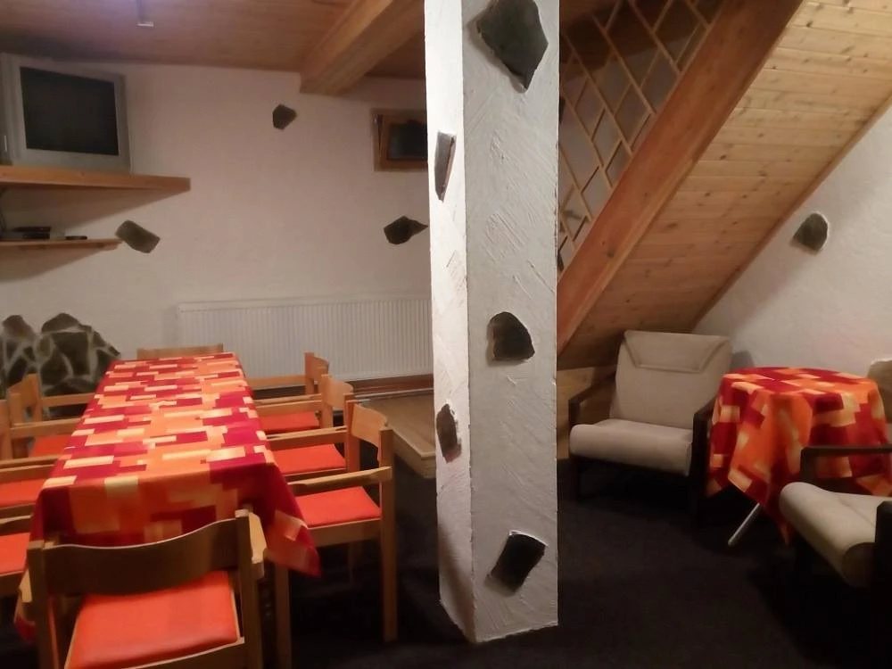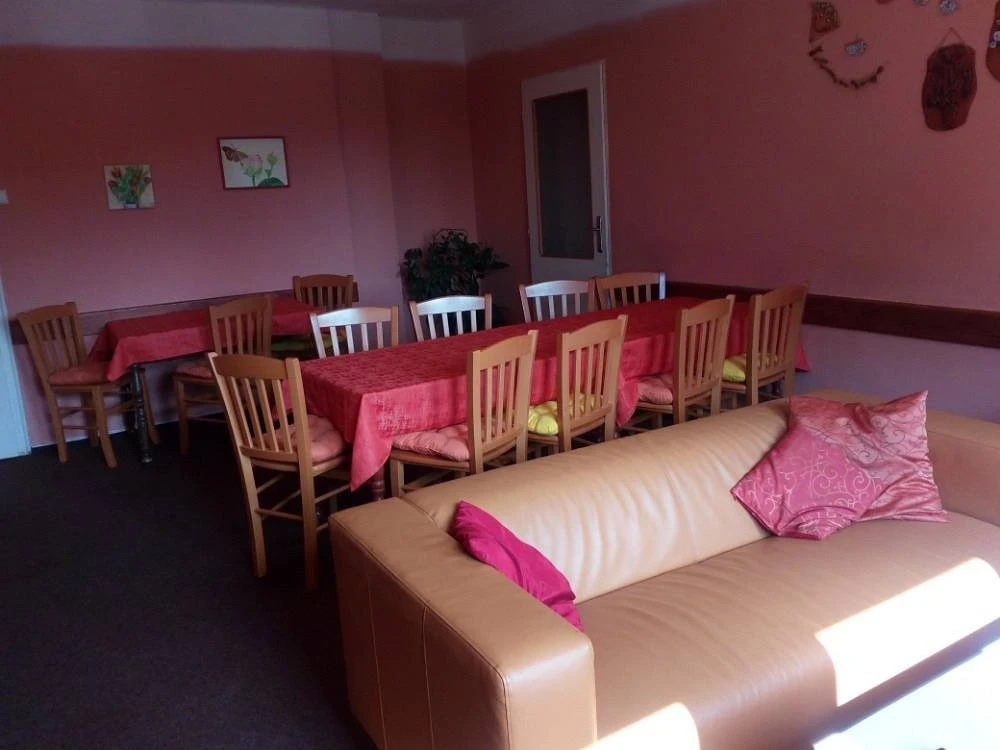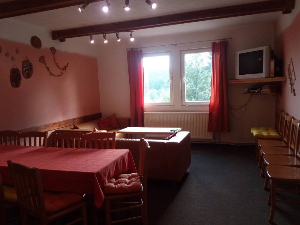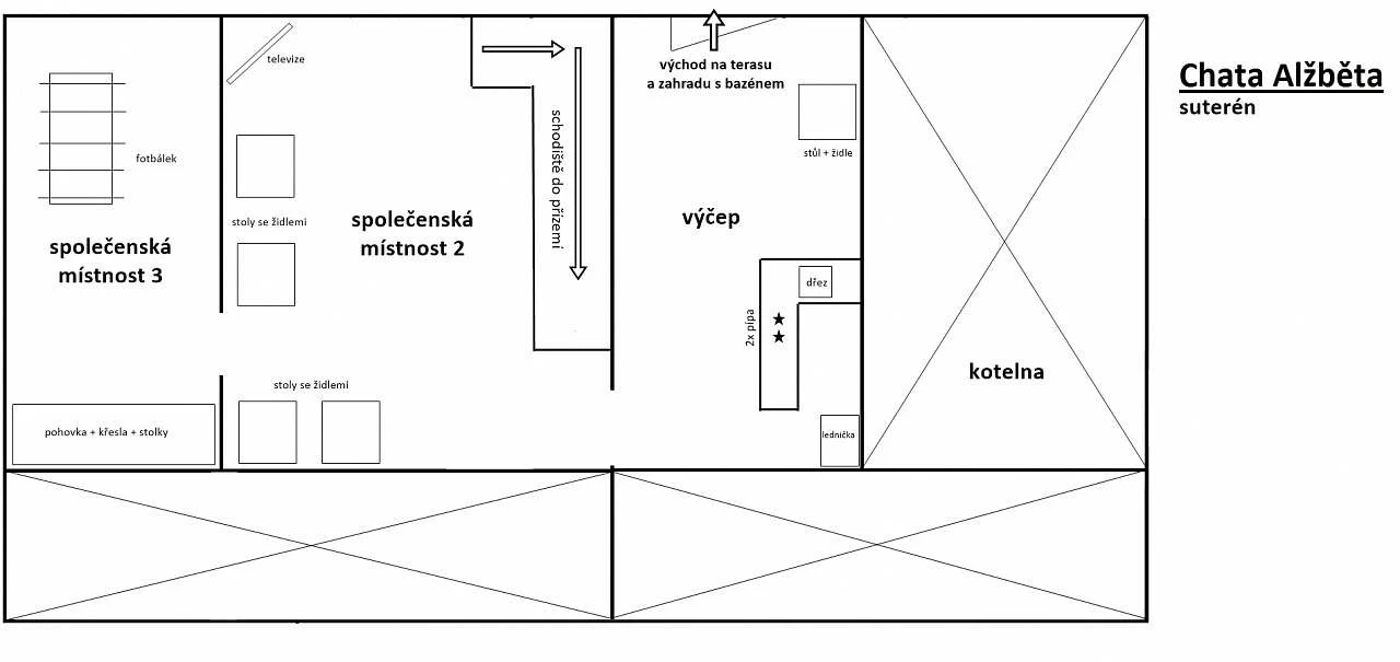K dispozici je společenská místnost, jídelna a bar včetně výčepního zařízení, terasa s grilem a oplocená zahrada cca 800 m² s ohništěm, houpačkami a skluzavkou.